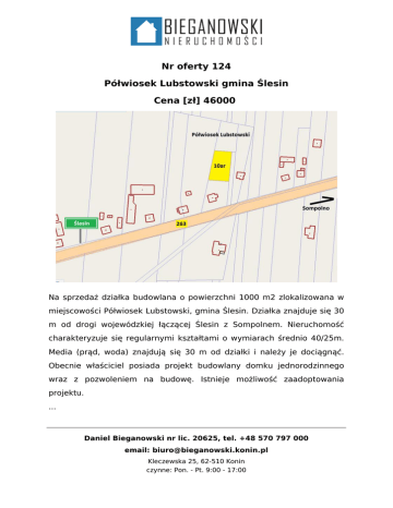 Nr oferty 124 Półwiosek Lubstowski gmina Ślesin Cena [zł] 46000 Działka Budowlana k/Ślesina Na sprzedaż działka budowlana o powierzchni 1000 m2 zlokalizowana w miejscowości Półwiosek Lubstowski, gmina Ślesin. Działka znajduje się 30 m od drogi wojewódzkiej łączącej Ślesin z Sompolnem. Nieruchomość charakteryzuje się regularnymi kształtami o wymiarach średnio 40/25m. Media (prąd, woda) znajdują się 30 m od działki i należy je dociągnąć. Obecnie właściciel posiada projekt budowlany domku jednorodzinnego wraz z pozwoleniem na budowę. Istnieje możliwość zaadoptowania projektu. ... Daniel Bieganowski nr lic. 20625, tel. +48 570 797 000 email: [email protected] Kleczewska 25, 62-510 Konin czynne: Pon. - Pt. 9:00 - 17:00