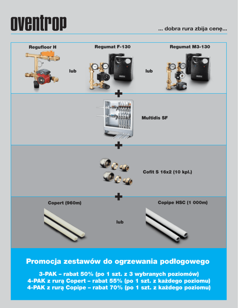 ... dobra rura zbija cenę... Regumat F-130 Regufloor H lub Regumat M3-130 lub Multidis SF Cofit S 16x2 (10 kpl.) Copipe HSC (1 000m) Copert (960m) lub Promocja zestawów do ogrzewania podłogowego 3-PAK – rabat 50% (po 1 szt. z 3 wybranych poziomów) 4-PAK z rurą Copert – rabat 55% (po 1 szt. z każdego poziomu) 4-PAK z rurą Copipe – rabat 70% (po 1 szt. z każdego poziomu) ... dobra rura zbija cenę... „Regufloor H” – grupa pompowa mieszająca do regulacji temperatury zasilania na wejściu do rozdzielacza w instalacji ogrzewania podłogowego. W skład grupy wchodzą: pompa elektroniczna Wilo E15/1-5B, 3-drogowy zawór rozdzielający, regulator temperatury, elektryczny bezpiecznik temperatury krytycznej. Możliwość podłączenia rozdzielacza 2- do 12-obiegowego. Cena katalogowa - 515 EURO Nr kat. 115 10 00 „Regumat F-130” - grupa pompowa mieszająca do łączenia kotła z obiegiem ogrzewania podłogowego. Składniki grupy: pompa Grundfos UPS 25-60, zawór mieszający z regulatorem temperatury do obniżenia temperatury zasilania, zawory kulowe z termometrami, zawór stopowy, elektryczny bezpiecznik temperatury krytycznej. Izolacja w komplecie. Nr kat. 135 41 85 Cena katalogowa - 525 EURO „Regumat M3-130” - grupa pompowa z mieszaczem do łączenia kotła z obiegiem ogrzewania podłogowego. Zawór 3-drogowy z napędem do pogodowej regulacji temperatury zasilania. Pozostałe składniki: pompa Grundfos UPS 25-60, zawory kulowe z termometrami, zawór stopowy. Izolacja w komplecie. Cena katalogowa - 625 EURO Nr kat. 135 52 89 „Multidis SF” – rozdzielacz ze stali nierdzewnej z wkładkami równoważąco-pomiarowymi (0 - 5 l/min). Kurki napełniająco-opróżniające, korki odpowietrzające i zaślepki w komplecie. Cena katalogowa – 121 EURO Cena katalogowa – 150 EURO Cena katalogowa – 175 EURO Cena katalogowa – 202 EURO Cena katalogowa – 231 EURO Cena katalogowa – 256 EURO Cena katalogowa – 284 EURO Cena katalogowa – 310 EURO Cena katalogowa – 339 EURO Cena katalogowa – 366 EURO Nr kat. 140 43 53 (do 3 obiegów) Nr kat. 140 43 54 (do 4 obiegów) Nr kat. 140 43 55 (do 5 obiegów) Nr kat. 140 43 56 (do 6 obiegów) Nr kat. 140 43 57 (do 7 obiegów) Nr kat. 140 43 58 (do 8 obiegów) Nr kat. 140 43 59 (do 9 obiegów) Nr kat. 140 43 60 (do 10 obiegów) Nr kat. 140 43 61 (do 11 obiegów) Nr kat. 140 43 62 (do 12 obiegów) „Cofit S” – złączki skręcane (kpl. = 2 szt.), 16 x 2 mm, nakrętka G ¾, niklowana, do rury wielowarstwowej „Copipe”. Nr kat. 150 79 35 Cena katalogowa (za 10 kpl.) - 70,50 EURO „Copert” - rura PE-RT 16 x 2, z warstwą antydyfuzyjną. W zwojach po 240 m. Nr kat. 140 21 52 Cena katalogowa (za 960 m) - 1200 EURO „Copipe HSC” - rura wielowarstwowa PE-RT/AL/PE-RT, 16 x 2. W zwojach po 200 m. Nr kat. 154 02 55 Cena katalogowa (za 1 000 m) - 2750 EURO 1. Promocja skierowana jest do instalatorów zaopatrujących się w hurtowniach współpracujących z firmą Oventrop. 2. Promocja trwa od 1.06 do 30.09.2012. 3. Szczegółowe informacje techniczne można znaleźć na stronie www.oventrop.pl lub uzyskać pod numerami telefonów 500 477 250 i 502 696 035. 4. Informacje handlowe można uzyskać u właściwego terytorialnie przedstawiciela techniczno-handlowego lub bezpośrednio w firmie Oventrop. 5. Ceny nie zawierają podatku VAT. 6. Jako jeden produkt w przypadku złączek i rur rozumie się odpowiednio 10 kpl. (po 2 szt.) złączek Cofit, 960 m (4 zwoje) rury Copert i 1 000 m (5 zwojów) rury Copipe. Przedstawiciele techniczno-handlowi: • Bydgoszcz, Gdańsk, Olsztyn 501 692 319 • Łódź, Poznań 501 219 679 • Białystok, Płock, Warszawa 501 188 800, 501 501 155 • Lublin, Rzeszów 500 217 414 • Katowice, Kielce, Kraków 509 400 188 • Opole, Wrocław 512 946 002 • Szczecin, Gorzów Wlkp., Zielona Góra 501 609 563 OVENTROP Sp. z o.o. Bronisze, ul. Świerkowa 1B PL - 05-850 Ożarów Mazowiecki Telefon +48 (22) 722 96 42 Telefax +48 (22) 722 96 41 www.oventrop.pl e-mail: [email protected]