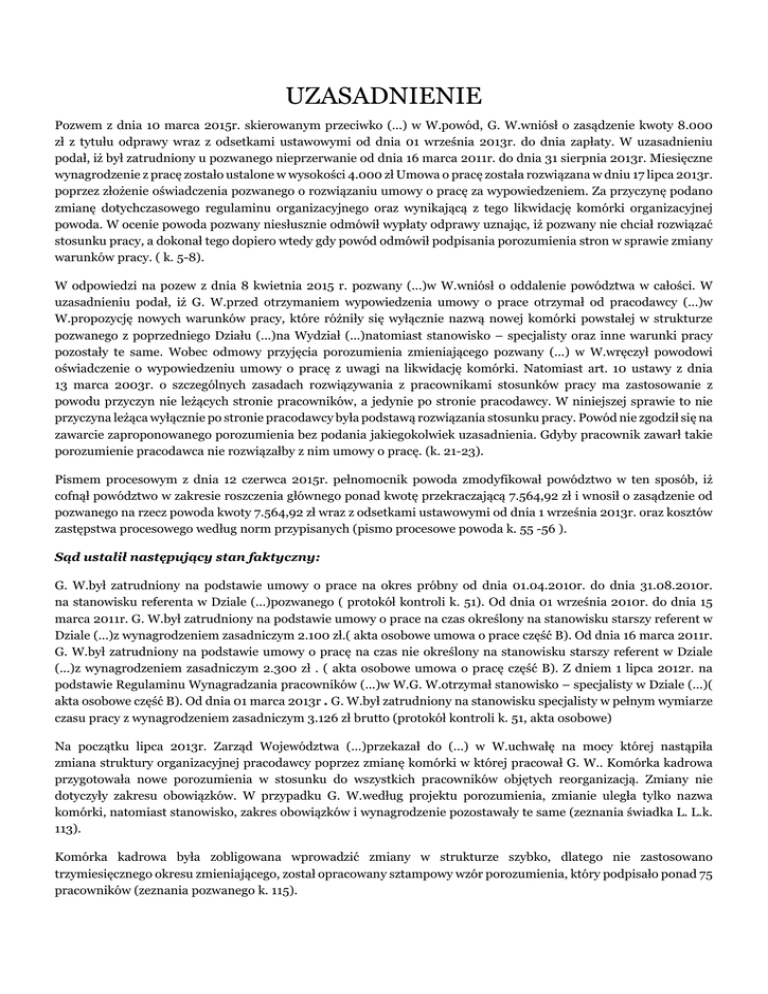 UZASADNIENIE Pozwem z dnia 10 marca 2015r. skierowanym przeciwko (...) w W.powód, G. W.wniósł o zasądzenie kwoty 8.000 zł z tytułu odprawy wraz z odsetkami ustawowymi od dnia 01 września 2013r. do dnia zapłaty. W uzasadnieniu podał, iż był zatrudniony u pozwanego nieprzerwanie od dnia 16 marca 2011r. do dnia 31 sierpnia 2013r. Miesięczne wynagrodzenie z pracę zostało ustalone w wysokości 4.000 zł Umowa o pracę została rozwiązana w dniu 17 lipca 2013r. poprzez złożenie oświadczenia pozwanego o rozwiązaniu umowy o pracę za wypowiedzeniem. Za przyczynę podano zmianę dotychczasowego regulaminu organizacyjnego oraz wynikającą z tego likwidację komórki organizacyjnej powoda. W ocenie powoda pozwany niesłusznie odmówił wypłaty odprawy uznając, iż pozwany nie chciał rozwiązać stosunku pracy, a dokonał tego dopiero wtedy gdy powód odmówił podpisania porozumienia stron w sprawie zmiany warunków pracy. ( k. 5-8). W odpowiedzi na pozew z dnia 8 kwietnia 2015 r. pozwany (...)w W.wniósł o oddalenie powództwa w całości. W uzasadnieniu podał, iż G. W.przed otrzymaniem wypowiedzenia umowy o prace otrzymał od pracodawcy (...)w W.propozycję nowych warunków pracy, które różniły się wyłącznie nazwą nowej komórki powstałej w strukturze pozwanego z poprzedniego Działu (...)na Wydział (...)natomiast stanowisko – specjalisty oraz inne warunki pracy pozostały te same. Wobec odmowy przyjęcia porozumienia zmieniającego pozwany (...) w W.wręczył powodowi oświadczenie o wypowiedzeniu umowy o pracę z uwagi na likwidację komórki. Natomiast art. 10 ustawy z dnia 13 marca 2003r. o szczególnych zasadach rozwiązywania z pracownikami stosunków pracy ma zastosowanie z powodu przyczyn nie leżących stronie pracowników, a jedynie po stronie pracodawcy. W niniejszej sprawie to nie przyczyna leżąca wyłącznie po stronie pracodawcy była podstawą rozwiązania stosunku pracy. Powód nie zgodził się na zawarcie zaproponowanego porozumienia bez podania jakiegokolwiek uzasadnienia. Gdyby pracownik zawarł takie porozumienie pracodawca nie rozwiązałby z nim umowy o pracę. (k. 21-23). Pismem procesowym z dnia 12 czerwca 2015r. pełnomocnik powoda zmodyfikował powództwo w ten sposób, iż cofnął powództwo w zakresie roszczenia głównego ponad kwotę przekraczającą 7.564,92 zł i wnosił o zasądzenie od pozwanego na rzecz powoda kwoty 7.564,92 zł wraz z odsetkami ustawowymi od dnia 1 września 2013r. oraz kosztów zastępstwa procesowego według norm przypisanych (pismo procesowe powoda k. 55 -56 ). Sąd ustalił następujący stan faktyczny: G. W.był zatrudniony na podstawie umowy o prace na okres próbny od dnia 01.04.2010r. do dnia 31.08.2010r. na stanowisku referenta w Dziale (...)pozwanego ( protokół kontroli k. 51). Od dnia 01 września 2010r. do dnia 15 marca 2011r. G. W.był zatrudniony na podstawie umowy o prace na czas określony na stanowisku starszy referent w Dziale (...)z wynagrodzeniem zasadniczym 2.100 zł.( akta osobowe umowa o prace część B). Od dnia 16 marca 2011r. G. W.był zatrudniony na podstawie umowy o pracę na czas nie określony na stanowisku starszy referent w Dziale (...)z wynagrodzeniem zasadniczym 2.300 zł . ( akta osobowe umowa o pracę część B). Z dniem 1 lipca 2012r. na podstawie Regulaminu Wynagradzania pracowników (...)w W.G. W.otrzymał stanowisko – specjalisty w Dziale (...)( akta osobowe część B). Od dnia 01 marca 2013r . G. W.był zatrudniony na stanowisku specjalisty w pełnym wymiarze czasu pracy z wynagrodzeniem zasadniczym 3.126 zł brutto (protokół kontroli k. 51, akta osobowe) Na początku lipca 2013r. Zarząd Województwa (...)przekazał do (...) w W.uchwałę na mocy której nastąpiła zmiana struktury organizacyjnej pracodawcy poprzez zmianę komórki w której pracował G. W.. Komórka kadrowa przygotowała nowe porozumienia w stosunku do wszystkich pracowników objętych reorganizacją. Zmiany nie dotyczyły zakresu obowiązków. W przypadku G. W.według projektu porozumienia, zmianie uległa tylko nazwa komórki, natomiast stanowisko, zakres obowiązków i wynagrodzenie pozostawały te same (zeznania świadka L. L.k. 113). Komórka kadrowa była zobligowana wprowadzić zmiany w strukturze szybko, dlatego nie zastosowano trzymiesięcznego okresu zmieniającego, został opracowany sztampowy wzór porozumienia, który podpisało ponad 75 pracowników (zeznania pozwanego k. 115). W dniu 15 lipca 2013r. G. W.zostało przedstawione porozumienie stron zmieniające warunki umowy o pracę z dniem 01 sierpnia 2013r. w zakresie dotyczącym zmiany stanowiska pracy na stanowisko specjalisty w nowej komórce organizacyjnej Wydziale (...), pozostałe warunki pracy i płacy nie uległy zmianie. Nowo uzgodnione warunki to: 1. stanowisko pracy – specjalista, 2. komórka organizacyjna : Wydział (...). Pozostałe warunki umowy pozostawały bez zmian (porozumienie k. 32). Powód odmówił przyjęcia nowych warunków pracy zaproponowanych przez pracodawcę (...) w W., gdyż uważał, że nie został należycie poinformowany co ulegnie zmianie, polecono mu tylko podpisać porozumienie ( przesłuchanie powoda k. 114, protokół kontroli k. 52). Z dniem 01 sierpnia 2013r. została wprowadzona reorganizacja (...) w W.uchwałą Zarządu Województwa (...)nr (...)z dnia 25.06.2013r. Bezpośrednim następstwem tych zmian była likwidacja niektórych komórek organizacyjnych w tym również tej w której był zatrudniony G. W.(k. 15, k. 61 zeznania świadka M. C., zeznania świadka L. L.k. 112, zarządzenie nr (...)k. 67 ). 17 lipca 2013r. (...) w W.wypowiedział G. W.umowę o pracę, jako przyczynę wskazując zmianę dotychczas obowiązującego regulaminu organizacyjnego i wprowadzenie z dniem 01 sierpnia 2013r. nowego regulaminu organizacyjnego i wynikającą z tego likwidację komórki organizacyjnej i stanowiska pracy na którym powód był zatrudniony. Zgodnie z art. 36 k.p. G. W., został
