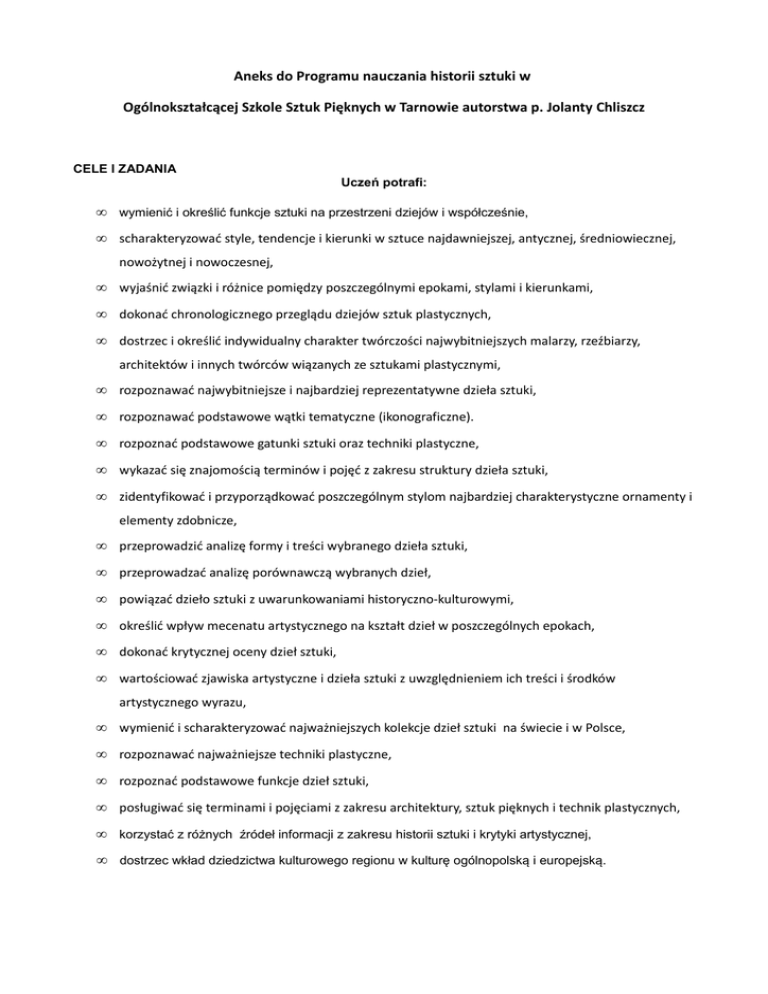 Aneks do Programu nauczania historii sztuki w Ogólnokształcącej Szkole Sztuk Pięknych w Tarnowie autorstwa p. Jolanty Chliszcz CELE I ZADANIA Uczeń potrafi: • wymienić i określić funkcje sztuki na przestrzeni dziejów i współcześnie, • scharakteryzować style, tendencje i kierunki w sztuce najdawniejszej, antycznej, średniowiecznej, nowożytnej i nowoczesnej, • wyjaśnić związki i różnice pomiędzy poszczególnymi epokami, stylami i kierunkami, • dokonać chronologicznego przeglądu dziejów sztuk plastycznych, • dostrzec i określić indywidualny charakter twórczości najwybitniejszych malarzy, rzeźbiarzy, architektów i innych twórców wiązanych ze sztukami plastycznymi, • rozpoznawać najwybitniejsze i najbardziej reprezentatywne dzieła sztuki, • rozpoznawać podstawowe wątki tematyczne (ikonograficzne). • rozpoznać podstawowe gatunki sztuki oraz techniki plastyczne, • wykazać się znajomością terminów i pojęć z zakresu struktury dzieła sztuki, • zidentyfikować i przyporządkować poszczególnym stylom najbardziej charakterystyczne ornamenty i elementy zdobnicze, • przeprowadzić analizę formy i treści wybranego dzieła sztuki, • przeprowadzać analizę porównawczą wybranych dzieł, • powiązać dzieło sztuki z uwarunkowaniami historyczno-kulturowymi, • określić wpływ mecenatu artystycznego na kształt dzieł w poszczególnych epokach, • dokonać krytycznej oceny dzieł sztuki, • wartościować zjawiska artystyczne i dzieła sztuki z uwzględnieniem ich treści i środków artystycznego wyrazu, • wymienić i scharakteryzować najważniejszych kolekcje dzieł sztuki na świecie i w Polsce, • rozpoznawać najważniejsze techniki plastyczne, • rozpoznać podstawowe funkcje dzieł sztuki, • posługiwać się terminami i pojęciami z zakresu architektury, sztuk pięknych i technik plastycznych, • korzystać z różnych źródeł informacji z zakresu historii sztuki i krytyki artystycznej, • dostrzec wkład dziedzictwa kulturowego regionu w kulturę ogólnopolską i europejską.