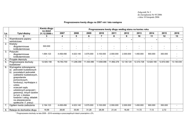 Załącznik Nr 3 do Zarządzenia Nr 95/2006 z dnia 10 listopada 2006 Prognozowane kwoty długu na 2007 rok i lata następne Lp. Tytuł dłuŜny 1 2 1. Wyemitowane papiery wartościowe 2. Kredyty: - długoterminowe - krótkoterminowe 3. PoŜyczki: - długoterminowe - krótkoterminowe 4. Przyjęte depozyty 5. Prognozowane dochody budŜetowe* 6. Wymagalne zobowiązania: a) jednostek budŜetowych b) pozostałych jednostek (zakładów budŜetowych, gospodarstw pomocniczych, funduszy), wynikające z: - ustaw, - orzeczeń sądu - udzielonych poręczeń i gwarancji, innych tytułów (w tym: z dostaw towarów i usług, składek na ubezpieczenia społeczne i f. pracy) 7. Ogółem kwota zadłuŜenia 8. Relacja do dochodów długu Kwota długu na dzień 31.12.2006 r. 3 2007 4 2008 5 2009 6 2010 7 - - - - - 500.000 - - - - - - - - - - - 1.694.123 - 4.458.456 - 4.023.140 - 3.575.000 - 3.100.000 - 2.550.000 - 2.000.000 1.450.000 900.000 350.000 - 12.925.158 16.763.700 11.206.359 11.430.486 11.659.096 11.892.278 12.130.124 12.372.726 12.620.180 12.872.583 13.130.035 2.194.123 4.458.456 4.023.140 3.575.000 3.100.000 2.550.000 2.000.000 1.450.000 900.000 350.000 - 16,98 26,60 35,90 31,28 26,59 21,44 16,49 11,72 7,13 2,72 - Prognozowane kwoty długu według stanu na koniec roku * Prognozowane dochody na lata 2008 – 2016 wzrastają w poszczególnych latach przeciętnie o 2%. 2011 8 2012 9 - 2013 10 2014 11 - - 2015 12 2016 13 - - - Planowane spłaty zobowiązań na 2007 rok i lata następne Lp. Tytuł spłaty 1 2 1. Spłata rat kredytów: 2. 2009 5 Planowane spłaty zobowiązań na lata: 2010 2011 2012 2013 6 7 8 9 2014 10 2015 11 2016 12 długoterminowego 500.000 - - - - - - - - - - krótkoterminowego - - - - - - - - - - 235.667 435.316 448.140 475.000 550.000 550.000 550.000 550.000 550.000 350.000 - - - - - - - - - - Ogółem spłata rat 735.667 435.316 448.140 475.000 550.000 550.000 550.000 550.000 550.000 350.000 Spłata odsetek 100.000 133.000 120.600 107.250 93.000 76.500 60.000 43.500 27.000 10.500 Ogółem spłata długu 835.667 568.316 568.740 582.250 643.000 626.500 610.000 593.500 577.000 360.500 4,98 5,07 4,98 4,99 5,41 5,16 4,93 4,70 4,48 2,75 Spłata rat poŜyczki: Potencjalne kwoty spłat z tytułu udzielonych poręczeń 4. 2008 4 - - długoterminowej 3. 2007 3 Relacja do dochodów spłaty zadłuŜenia