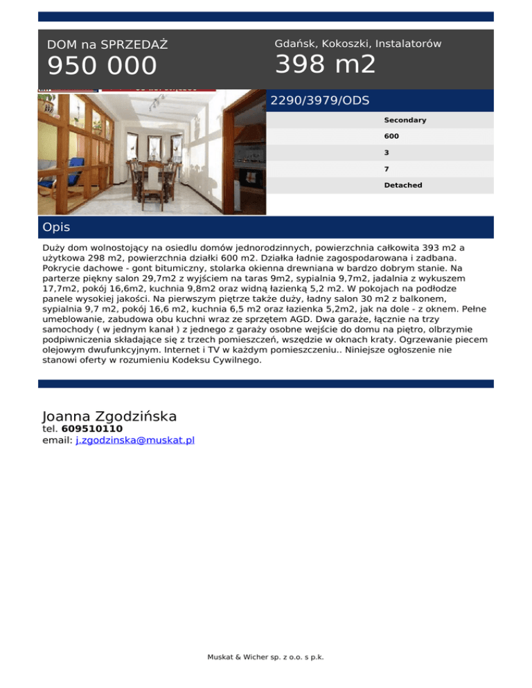 DOM na SPRZEDAŻ 950 000 Gdańsk, Kokoszki, Instalatorów 398 m2 2290/3979/ODS Secondary 600 3 7 Detached Opis Duży dom wolnostojący na osiedlu domów jednorodzinnych, powierzchnia całkowita 393 m2 a użytkowa 298 m2, powierzchnia działki 600 m2. Działka ładnie zagospodarowana i zadbana. Pokrycie dachowe - gont bitumiczny, stolarka okienna drewniana w bardzo dobrym stanie. Na parterze piękny salon 29,7m2 z wyjściem na taras 9m2, sypialnia 9,7m2, jadalnia z wykuszem 17,7m2, pokój 16,6m2, kuchnia 9,8m2 oraz widną łazienką 5,2 m2. W pokojach na podłodze panele wysokiej jakości. Na pierwszym piętrze także duży, ładny salon 30 m2 z balkonem, sypialnia 9,7 m2, pokój 16,6 m2, kuchnia 6,5 m2 oraz łazienka 5,2m2, jak na dole - z oknem. Pełne umeblowanie, zabudowa obu kuchni wraz ze sprzętem AGD. Dwa garaże, łącznie na trzy samochody ( w jednym kanał ) z jednego z garaży osobne wejście do domu na piętro, olbrzymie podpiwniczenia składające się z trzech pomieszczeń, wszędzie w oknach kraty. Ogrzewanie piecem olejowym dwufunkcyjnym. Internet i TV w każdym pomieszczeniu.. Niniejsze ogłoszenie nie stanowi oferty w rozumieniu Kodeksu Cywilnego. Joanna Zgodzińska tel. 609510110 email: [email protected] Muskat & Wicher sp. z o.o. s p.k. Powered by TCPDF (www.tcpdf.org)