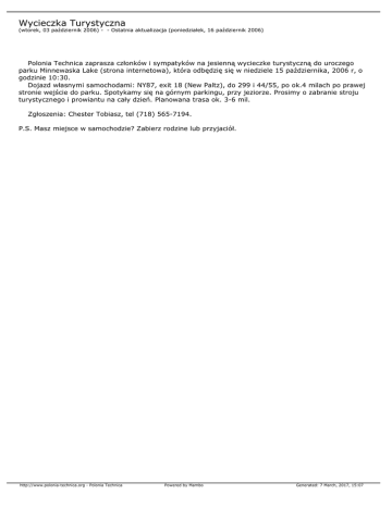 Wycieczka Turystyczna (wtorek, 03 październik 2006) - - Ostatnia aktualizacja (poniedziałek, 16 październik 2006) Polonia Technica zaprasza członków i sympatyków na jesienną wycieczke turystyczną do uroczego parku Minnewaska Lake (strona internetowa), która odbędzię się w niedziele 15 października, 2006 r, o godzinie 10:30. Dojazd własnymi samochodami: NY87, exit 18 (New Paltz), do 299 i 44/55, po ok.4 milach po prawej stronie wejście do parku. Spotykamy się na górnym parkingu, przy jeziorze. Prosimy o zabranie stroju turystycznego i prowiantu na cały dzień. Planowana trasa ok. 3-6 mil. Zgłoszenia: Chester Tobiasz, tel (718) 565-7194. P.S. Masz miejsce w samochodzie? Zabierz rodzine lub przyjaciół. http://www.polonia-technica.org - Polonia Technica Powered by Mambo Generated: 7 March, 2017, 15:07
