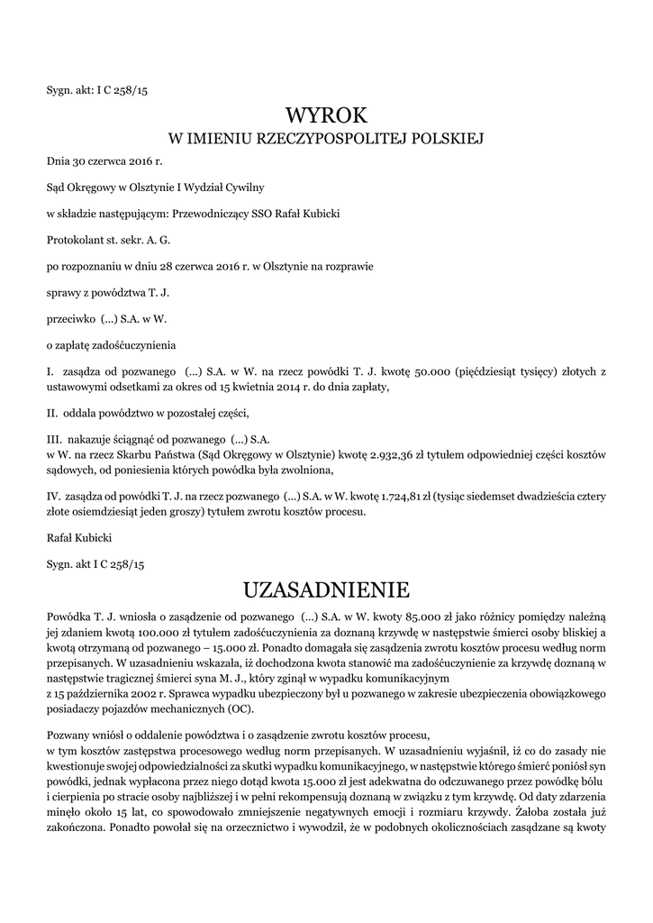 Sygn. akt: I C 258/15 WYROK W IMIENIU RZECZYPOSPOLITEJ POLSKIEJ Dnia 30 czerwca 2016 r. Sąd Okręgowy w Olsztynie I Wydział Cywilny w składzie następującym: Przewodniczący SSO Rafał Kubicki Protokolant st. sekr. A. G. po rozpoznaniu w dniu 28 czerwca 2016 r. w Olsztynie na rozprawie sprawy z powództwa T. J. przeciwko (...) S.A. w W. o zapłatę zadośćuczynienia I. zasądza od pozwanego (...) S.A. w W. na rzecz powódki T. J. kwotę 50.000 (pięćdziesiąt tysięcy) złotych z ustawowymi odsetkami za okres od 15 kwietnia 2014 r. do dnia zapłaty, II. oddala powództwo w pozostałej części, III. nakazuje ściągnąć od pozwanego (...) S.A. w W. na rzecz Skarbu Państwa (Sąd Okręgowy w Olsztynie) kwotę 2.932,36 zł tytułem odpowiedniej części kosztów sądowych, od poniesienia których powódka była zwolniona, IV. zasądza od powódki T. J. na rzecz pozwanego (...) S.A. w W. kwotę 1.724,81 zł (tysiąc siedemset dwadzieścia cztery złote osiemdziesiąt jeden groszy) tytułem zwrotu kosztów procesu. Rafał Kubicki Sygn. akt I C 258/15 UZASADNIENIE Powódka T. J. wniosła o zasądzenie od pozwanego (...) S.A. w W. kwoty 85.000 zł jako różnicy pomiędzy należną jej zdaniem kwotą 100.000 zł tytułem zadośćuczynienia za doznaną krzywdę w następstwie śmierci osoby bliskiej a kwotą otrzymaną od pozwanego – 15.000 zł. Ponadto domagała się zasądzenia zwrotu kosztów procesu według norm przepisanych. W uzasadnieniu wskazała, iż dochodzona kwota stanowić ma zadośćuczynienie za krzywdę doznaną w następstwie tragicznej śmierci syna M. J., który zginął w wypadku komunikacyjnym z 15 października 2002 r. Sprawca wypadku ubezpieczony był u pozwanego w zakresie ubezpieczenia obowiązkowego posiadaczy pojazdów mechanicznych (OC). Pozwany wniósł o oddalenie powództwa i o zasądzenie zwrotu kosztów procesu, w tym kosztów zastępstwa procesowego według norm przepisanych. W uzasadnieniu wyjaśnił, iż co do zasady nie kwestionuje swojej odpowiedzialności za skutki wypadku komunikacyjnego, w następstwie którego śmierć poniósł syn powódki, jednak wypłacona przez niego dotąd kwota 15.000 zł jest adekwatna do odczuwanego przez powódkę bólu i cierpienia po stracie osoby najbliższej i w pełni rekompensują doznaną w związku z tym krzywdę. Od daty zdarzenia minęło około 15 lat, co spowodowało zmniejszenie negatywnych emocji i rozmiaru krzywdy. Żałoba została już zakończona. Ponadto powołał się na orzecznictwo i wywodził, że w podobnych okolicznościach zasądzane są kwoty rzędu 15.000 – 50.000 zł. Na koniec wskazał, że w tym przypadku należy przyjąć przyczynienie się (co najmniej 50%) syna zmarłego do skutków wypadku poprzez niezapięcie pasów bezpieczeństwa. Sąd ustalił następujący stan faktyczny: Wyjąwszy kwestię pasów bezpieczeństwa, okoliczności wypadku komunikacyjnego są bezsporne. W dniu 15 października 2002 r. M. J., podróżując jako pasażer samochodu marki J. o nr rej. (...), kierowanego przez J. P., uczestniczył w wypadku komunikacyjnym, do którego doszło na trasie M. – D. P.. Winnym wypadku był J. P.. Obaj zmarli wskutek obrażeń poniesionych w tym zdarzeniu. Dochodzenie prowadzone w tej sprawie zostało umorzone wskutek śmierci sprawcy. J. P. ubezpieczony był u pozwanego w zakresie ubezpieczenia obowiązkowego posiadaczy pojazdów mechanicznych (OC). W postępowaniu likwidacyjnym (podobnie jak teraz w procesie) pozwany nie zakwestionował zasady swej odpowiedzialności - ani sprawstwa szkody, ani daty szkody w okresie ubezpieczenia OC. Pozwany przyznał powódce przed procesem tytułem zadośćuczynienia kwotę 15.000 zł. /odpis skrócony aktu zgonu k. 50, notatka urzędowa o kolizji drogowej k. 44, odpis postanowienia o umorzeniu dochodzenia k. 42-43, pismo pozwanego z 14.04.2015 r. o przyznaniu 15.000 zł k. 60/ Bezsporne jest też, że w dniu wypadku powódka miała 47 lat, a jej jedyny syn 24 (powódka ma jeszcze córkę). Syn przez całe życie, również po założeniu rodziny, mieszkał z powódką. Z żoną i matką prowadził wspólne gospodarstwo domowe. Powódka wychowywała go samotnie, bowiem rozstała się z mężem, gdy M. miał kilka lat. M. J. pozostawił żonę A., córkę K. (urodzoną w (...) r.) i syna P. (urodzonego w (...) r.). Obecnie powódka utrzymuje się z renty chorobowej (ok. 800 zł), jej jedynym wartościowym majątkiem jest dom (50 m2) o wartości ok. 80.000 zł. / odpisy skrócone aktów urodzenia i małżeństwa k. 50-52/ Do dnia wypadku powódka prowadziła gospodarstwo rolne, a syn z wynagrodzenia za pracę dokładał się do utrzymania. Wypadek nastąpił w dniu imienin powódki. Powódka zareagowała na wiadomość o śmierci syna płaczem i krzykiem, zemdlała. Na miejscu wypadku była po dwóch dniach. Po wypadku przyjmowała leki uspokajające, miała kłopoty ze snem. /dowód: zeznania świadka B. O.. K. 125, zeznania powódki k. 126/ Powódka zakończyła proces żałoby po śmierci syna. Rozpoczęcie procesu żałoby nastąpiło w pierwszych dniach po wypadku, o czym świadczy fakt, że powódka radziła sobie wówczas z emocjami, przyjmując leki uspokajające. Następstwem wypadku były kłopoty ze snem, brak apetytu, koncentrowanie się na osobie zmarłego. Dużą rolę w poradzeniu sobie ze stratą odegrała jej rodzina. Skutkiem tego powódka nie potrzebowała korzystać z pomocy psychologicznej. Powódka ma w charakterystyce psychologicznej tendencję do depresji i załamań nerwowych. /dowód: pisemna opinia biegłego sądowego z zakresu psychologii k. 152-160/ Sąd zważył co następuje: Znaczna część faktów jest bezsporna i znajduje potwierdzenie w dowodach w postaci dokumentów, które nie były kwestionowane przez strony i które nie budzą wątpliwości Sądu. Kwestie związane z rozmiarem krzywdy powódki wynikają z dalszych wiarygodnych dowodów: zeznań świadka, przesłuchania powódki i opinii biegłego s