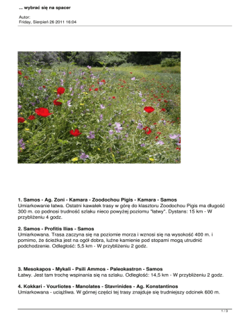 ... wybrać się na spacer Autor: Friday, Sierpień 26 2011 16:04 1. Samos - Ag. Zoni - Kamara - Zoodochou Pigis - Kamara - Samos Umiarkowanie łatwa. Ostatni kawałek trasy w górę do klasztoru Zoodochou Pigis ma długość 300 m. co podnosi trudność szlaku nieco powyżej poziomu "łatwy". Dystans: 15 km - W przybliżeniu 4 godz. 2. Samos - Profitis Ilias - Samos Umiarkowana. Trasa zaczyna się na poziomie morza i wznosi się na wysokość 400 m. i pomimo, że ścieżka jest na ogół dobra, luźne kamienie pod stopami mogą utrudnić podchodzenie. Odległość: 5,5 km - W przybliżeniu 2 godz. 3. Mesokapos - Mykali - Psili Ammos - Paleokastron - Samos Łatwy. Jest tam trochę wspinania się na szlaku. Odległość: 14,5 km - W przybliżeniu 2 godz. 4. Kokkari - Vourliotes - Manolates - Stavrinides - Ag. Konstantinos Umiarkowana - uciążliwa. W górnej części tej trasy znajduje się trudniejszy odcinek 600 m. 1/3 ... wybrać się na spacer Autor: Friday, Sierpień 26 2011 16:04 Odległość: 16 km - W przybliżeniu 4 godz. 15 min. 5. Kampos - Vourliotes - Moni Vronda - Kokkari Umiarkowana - uciążliwa. Trasa zaczyna się od ciągłej drogi w górę z nad poziomu morza do wysokości 460 m. Trasa poprzecinana jest często przez skaliste lub piaszczyste drogi nie nadające się do szybkiego chodzenia. Dystans: 10 km - W przybliżeniu 3 godz. 15 min. 6. Potami - Mikro Seitani - Kosmadeo - Nikoloudes - Tsourlei - Paleo Karlovassi Karlovassi Umiarkowana - uciążliwa. Ciężka praca ogranicza się do wchodzenia od poziomu morza na wysokość 475 m; reszta to spacer w dół. Dystans: 18 km - W przybliżeniu 4godz. 45 min. 7. Potami - Mikro Seitani - Megalo Seitani - Drakei Umiarkowana - uciążliwa. Trasa jest falista, przy brzegu, rozciągająca się na wysokość 375 m, jednak ścieżki są wąskie i kamieniste. Dystans: 10 km - W przybliżeniu 2godz. 45 min. 8. Karlovassi - Paleo Karlovassi - Kosmadeo - Miro Seitani - Potami - Karlovassi Uciążliwa. Kosmadeo znajduje się na wysokości 600 m a trasa w górę od poziomu morza jest czasami stroma, ale przynajmniej jest dużo cienia na drodze. Niektóre ścieżki i szlaki wymagają i pośpiech nie jest zalecany. Odległość: 21,5 km - W przybliżeniu 5 godz. 9. Karlovassi - Paleo Karlovassi - Kastro - Potami - Tsourlei - Paleo Karlovassi Karlovassi Łatwa - umiarkowana. Niektóre miejsca wymagają wspinaczki, początkowo na wysokości 140 m i podobnie poza Potami. Odległość: 15,5 km - W przybliżeniu 3godz. 45 min. 10. Kosmadeo do Marathokambos Umiarkowana. Tylko dla doświadczonych wędrowców - znalezienie odpowiedniej trasy może być trudne na drodze pomiędzy 34 min i 1godziną i 6 min. Dystans: 10 km - W przybliżeniu 2godz. 30 min. 11. Votsalakia - Moni Evangelistria - Vigla - Votsalakis Bardzo intensywny, tylko dla doświadczonych pieszych. Szlak dochodzi do wysokości 1440 m, i prawie wszystko jest na stromym wzniesieniu, a teren kamienisty. Szczyt jest często ukryty w chmurach, w szczególności wiosną i jesienią, więc warto poczekać na dobrą pogodę. Bądź przygotowany także na zimny wiatr na szczycie. Odległość: 21 km - W przybliżeniu 6godz. 30 min. 12. Platanos - Kondeika - Ydroussa - Kondakeika - Ag. Dimitrios Umiarkowana. Nie za dużo wchodzenia pod górę. Wniesienia i doliny nie są aż tak trudne do pokonania. Dystans: 15 km - W przybliżeniu 3godz. 20 min. 13. Koutsi - Neochori - Koumeika - Ormos - Marathokambos Łatwa - umiarkowana. Luźne kamieniste zejście w stronę morza wymaga zręczności. Dystans: 11 km - W przybliżeniu 2godz. 30 min. 2/3 ... wybrać się na spacer Autor: Friday, Sierpień 26 2011 16:04 14. Pandrosos - Łazarz - Kokkari Męcząca, ale nie jest tak trudna, jak mogłoby się wydawać. Zaczynamy na 600 m, pozostawiając tylko ok. 550 m wspinaczki. Dystans: 17 km - W przybliżeniu 4godz. 30 min. 15. Pandrosos - Profitis Ilias - Manolates - Platanakia Męczący, ale nie jest tak trudny, jak mogłoby się wydawać. Pandrosos znajduje się na wysokości około 600 m/2000 stóp i pozostaje tylko 540m by dotrzeć do najwyższego punktu. Odległość: 19 km - W przybliżeniu 4 godzin 16. Mavratzei do Kokkari Umiarkowana. Można dojść do wysokości około 400 m. Dystans: 13 km - W przybliżeniu 3 godzin 17. Mavratzei do Mytilini Łatwa. Trasa zaczyna się na ścieżce, ale jej dalsza część jest głównie wzdłuż drogi. Dystans: 11 km - W przybliżeniu 2godz. 30 min. 18. Chora - Mili - Heraion - Pythagorion Łatwa - umiarkowana. Tylko długość trasy podnosi stopień jej trudności. Dystans: 20 km - W przybliżeniu 4 godziny. 19. Mytilini do Kokkari Łatwa. Niewiele jest tu momentów kiedy wymagana jest wspinaczka. Odległość: 9 km - W przybliżeniu 2 godz. 20. Mytilini - Moni Vronda - Vourliotes - Platanakia Umiarkowana. Wysokość na jaką trzeba sie wspiąć w trakcie spaceru wynosi około 460 m, ale wejście nie jest zbyt trudne. Odległość: 16,5 km - W przybliżeniu 3 godz. 45 min 21. Mytilini - Ag. Triades - Moni Spilianis - Pythagorion Łatwa. Szlak znajduje się na dobrej drodze przez większość odległości. Jednak zejście z zakurzonej drogi może być trudne. Odległość: 8,5 km - W przybliżeniu 2godz. 30 min. 3/3