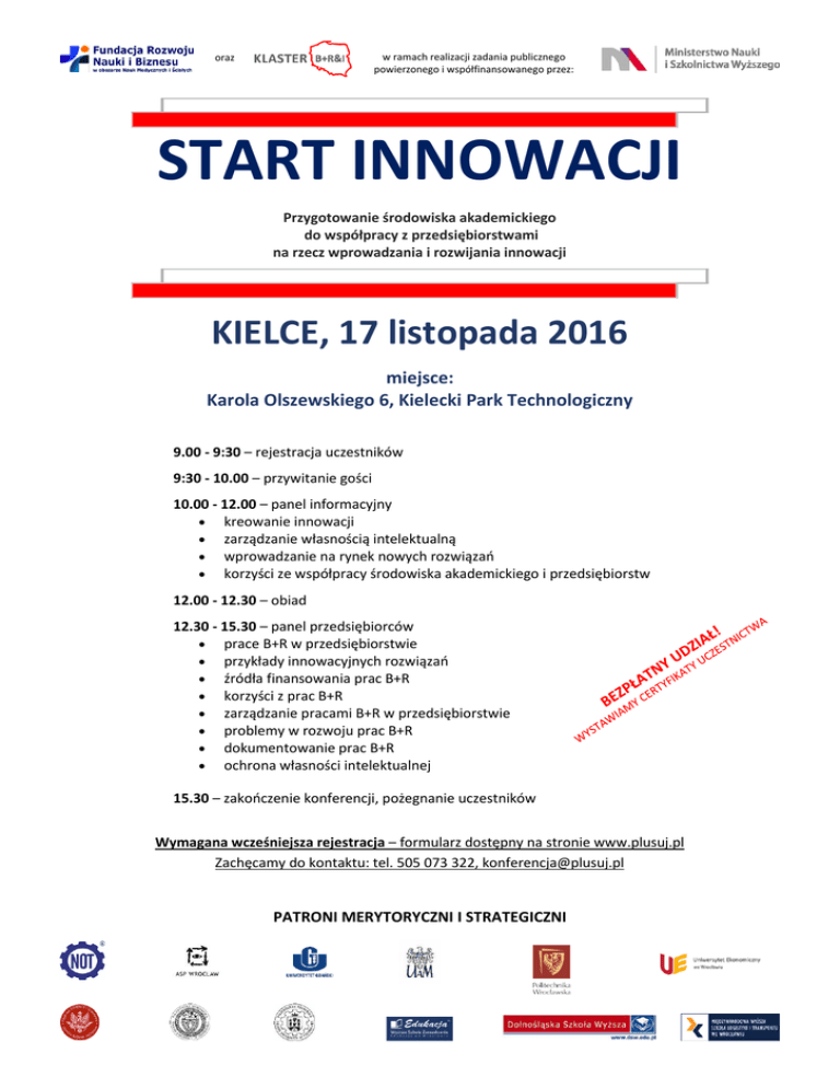 w ramach realizacji zadania publicznego powierzonego i współfinansowanego przez: oraz START INNOWACJI Przygotowanie środowiska akademickiego do współpracy z przedsiębiorstwami na rzecz wprowadzania i rozwijania innowacji KIELCE, 17 listopada 2016 miejsce: Karola Olszewskiego 6, Kielecki Park Technologiczny 9.00 - 9:30 – rejestracja uczestników 9:30 - 10.00 – przywitanie gości 10.00 - 12.00 – panel informacyjny kreowanie innowacji zarządzanie własnością intelektualną wprowadzanie na rynek nowych rozwiązań korzyści ze współpracy środowiska akademickiego i przedsiębiorstw 12.00 - 12.30 – obiad 12.30 - 15.30 – panel przedsiębiorców prace B+R w przedsiębiorstwie przykłady innowacyjnych rozwiązań źródła finansowania prac B+R korzyści z prac B+R zarządzanie pracami B+R w przedsiębiorstwie problemy w rozwoju prac B+R dokumentowanie prac B+R ochrona własności intelektualnej 15.30 – zakończenie konferencji, pożegnanie uczestników Wymagana wcześniejsza rejestracja – formularz dostępny na stronie www.plusuj.pl Zachęcamy do kontaktu: tel. 505 073 322, [email protected] PATRONI MERYTORYCZNI I STRATEGICZNI