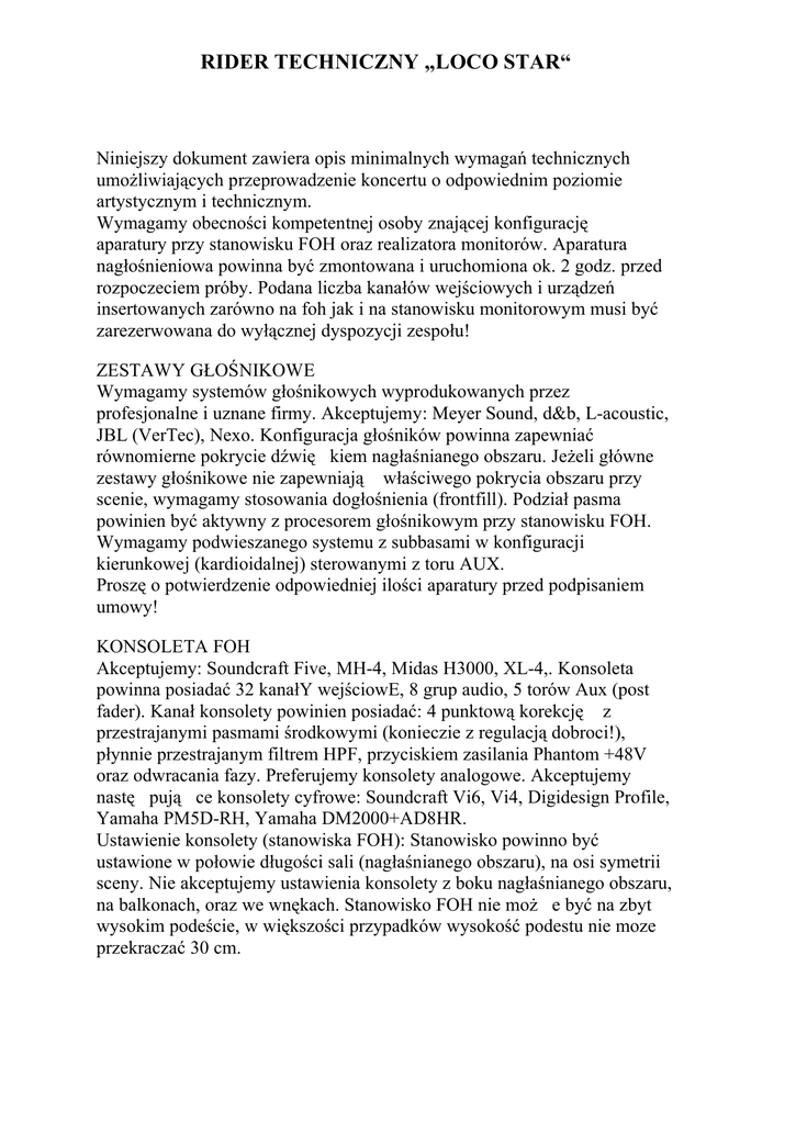 RIDER TECHNICZNY „LOCO STAR“ Niniejszy dokument zawiera opis minimalnych wymagań technicznych umożliwiających przeprowadzenie koncertu o odpowiednim poziomie artystycznym i technicznym. Wymagamy obecności kompetentnej osoby znającej konfigurację aparatury przy stanowisku FOH oraz realizatora monitorów. Aparatura nagłośnieniowa powinna być zmontowana i uruchomiona ok. 2 godz. przed rozpoczeciem próby. Podana liczba kanałów wejściowych i urządzeń insertowanych zarówno na foh jak i na stanowisku monitorowym musi być zarezerwowana do wyłącznej dyspozycji zespołu! ZESTAWY GŁOŚNIKOWE Wymagamy systemów głośnikowych wyprodukowanych przez profesjonalne i uznane firmy. Akceptujemy: Meyer Sound, d&b, L-acoustic, JBL (VerTec), Nexo. Konfiguracja głośników powinna zapewniać równomierne pokrycie dźwię kiem nagłaśnianego obszaru. Jeżeli główne zestawy głośnikowe nie zapewniają właściwego pokrycia obszaru przy scenie, wymagamy stosowania dogłośnienia (frontfill). Podział pasma powinien być aktywny z procesorem głośnikowym przy stanowisku FOH. Wymagamy podwieszanego systemu z subbasami w konfiguracji kierunkowej (kardioidalnej) sterowanymi z toru AUX. Proszę o potwierdzenie odpowiedniej ilości aparatury przed podpisaniem umowy! KONSOLETA FOH Akceptujemy: Soundcraft Five, MH-4, Midas H3000, XL-4,. Konsoleta powinna posiadać 32 kanałY wejściowE, 8 grup audio, 5 torów Aux (post fader). Kanał konsolety powinien posiadać: 4 punktową korekcję z przestrajanymi pasmami środkowymi (konieczie z regulacją dobroci!), płynnie przestrajanym filtrem HPF, przyciskiem zasilania Phantom +48V oraz odwracania fazy. Preferujemy konsolety analogowe. Akceptujemy nastę pują ce konsolety cyfrowe: Soundcraft Vi6, Vi4, Digidesign Profile, Yamaha PM5D-RH, Yamaha DM2000+AD8HR. Ustawienie konsolety (stanowiska FOH): Stanowisko powinno być ustawione w połowie długości sali (nagłaśnianego obszaru), na osi symetrii sceny. Nie akceptujemy ustawienia konsolety z boku nagłaśnianego obszaru, na balkonach, oraz we wnękach. Stanowisko FOH nie moż e być na zbyt wysokim podeście, w większości przypadków wysokość podestu nie moze przekraczać 30 cm. EFEKTY i INSERTY FOH (dla konsolety analogowej) • • • • • • • Bramki: Drawmer, Bss DPR, Klark-Technik – 5 kanałów Kompresory: Dbx 160A, Bss dpr – 9 kanałów Procesor pogłosowy: Lexicon PCM – 1 szt. Procesor efektów Lexicon MPX500 – 1 szt. Procesor efektów Yamaha SPX990 – 1 szt. Delay: T.C. D-Two lub SPX 990 – 1 szt. Korektor graficzny 31 punktowy (SUMA + SUB!): Klark Technik, BSS, XTA –potrzebny równiez w przypadku stołu cyfrowego KONSOLETA MONITOROWA I ODSŁUCHY Konsoleta powinna posiadać 24 kanały wejściowe i możliwość utworzenia 5 torów mono i 2 torów stereo, 4 punktową korekcję z przestrajanymi pasmami środkowymi, płynnie przestrajanym filtrem HPF, oraz przyciskiem odwracania fazy. EFEKTY i INSERTY MONITORY (dla konsolety analogowej) • • • Bramki: Drawmer, Bss DPR, Klark-Technik – 3 kanały Korektor graficzny 31 punktowy na kazdy tor monitorowy (oprócz dousznego) – TC Electronic EQ STATION lub Klark-technik Kompresor – 1 kanał MONITORY ODSŁUCHOWE Akceptujemy: d&b MAX, Meyer Sound oraz JBL SRX712M z końcówkami mocy Crown MA3600 i odsłuchy douszne Sennheiser evolution i Shure PSM 700. • Tor M(1, 2) Wokal (Marsija) • Tor M3 – Lap Top, Trąbka , Nord, Vocal (Tomek) • Tor M4 – Bas,Vocal (Patryk) • Tor M5 – Cymbały, Wibrafon (Miłosz) • Tor M6 – perkusja głośnik niskotonowy (18” lub 15”) • Tor M(7, 8) – perkusja • – odsłuch douszny Sennheiser – 2 monitory podłogowe– 2x XLR do mikserka – 1 monitor podłogowy Wystepują 2 warianty odsłuchu perkusisty w zalezności od grajacego muzyka: 1) – subbas 1x 18” + 2 x XLR do mikserka 2) – subbas 1x 18+ monitor szerokopasmowy