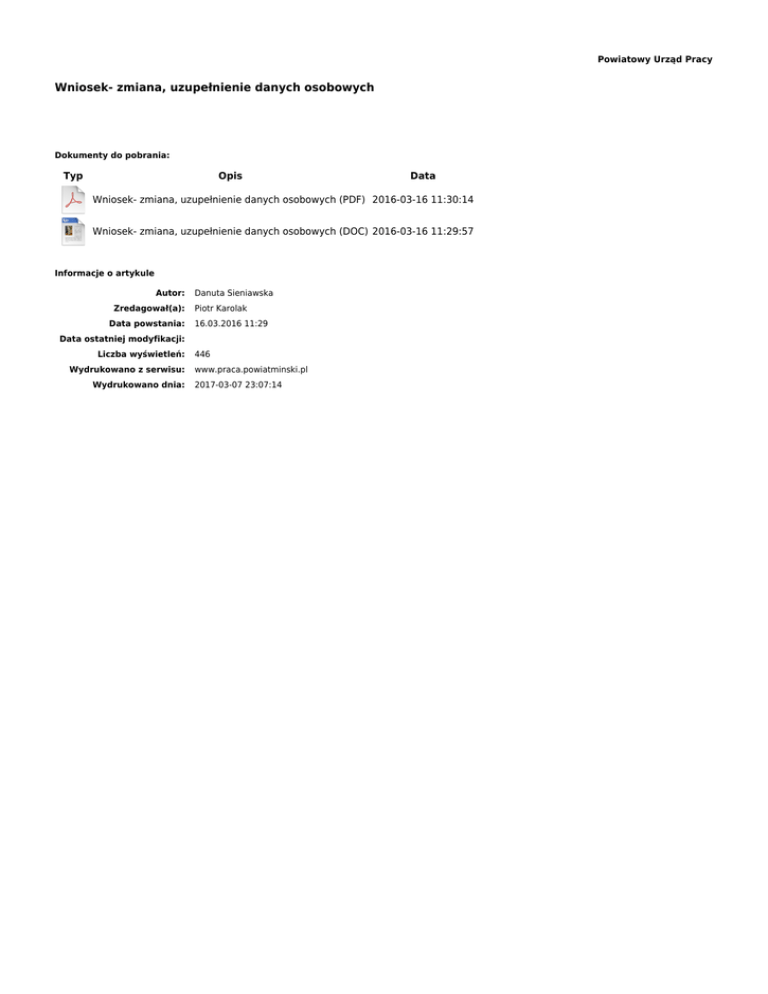 Powiatowy Urząd Pracy Wniosek- zmiana, uzupełnienie danych osobowych Dokumenty do pobrania: Typ Opis Data Wniosek- zmiana, uzupełnienie danych osobowych (PDF) 2016-03-16 11:30:14 Wniosek- zmiana, uzupełnienie danych osobowych (DOC) 2016-03-16 11:29:57 Informacje o artykule Autor: Zredagował(a): Data powstania: Danuta Sieniawska Piotr Karolak 16.03.2016 11:29 Data ostatniej modyfikacji: Liczba wyświetleń: Wydrukowano z serwisu: Wydrukowano dnia: 446 www.praca.powiatminski.pl 2017-03-07 23:07:14