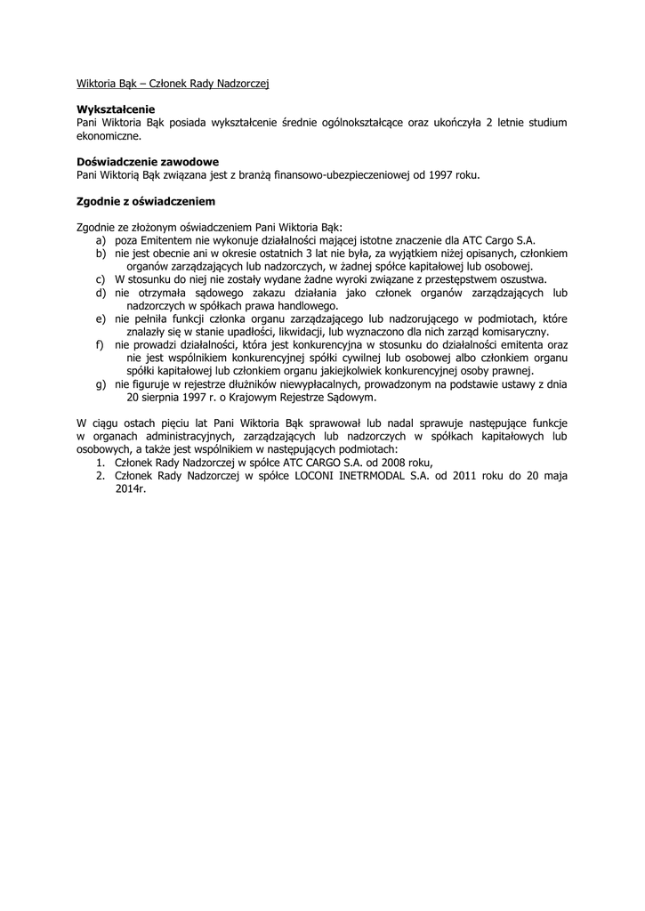 Wiktoria Bąk – Członek Rady Nadzorczej Wykształcenie Pani Wiktoria Bąk posiada wykształcenie średnie ogólnokształcące oraz ukończyła 2 letnie studium ekonomiczne. Doświadczenie zawodowe Pani Wiktorią Bąk związana jest z branżą finansowo-ubezpieczeniowej od 1997 roku. Zgodnie z oświadczeniem Zgodnie ze złożonym oświadczeniem Pani Wiktoria Bąk: a) poza Emitentem nie wykonuje działalności mającej istotne znaczenie dla ATC Cargo S.A. b) nie jest obecnie ani w okresie ostatnich 3 lat nie była, za wyjątkiem niżej opisanych, członkiem organów zarządzających lub nadzorczych, w żadnej spółce kapitałowej lub osobowej. c) W stosunku do niej nie zostały wydane żadne wyroki związane z przestępstwem oszustwa. d) nie otrzymała sądowego zakazu działania jako członek organów zarządzających lub nadzorczych w spółkach prawa handlowego. e) nie pełniła funkcji członka organu zarządzającego lub nadzorującego w podmiotach, które znalazły się w stanie upadłości, likwidacji, lub wyznaczono dla nich zarząd komisaryczny. f) nie prowadzi działalności, która jest konkurencyjna w stosunku do działalności emitenta oraz nie jest wspólnikiem konkurencyjnej spółki cywilnej lub osobowej albo członkiem organu spółki kapitałowej lub członkiem organu jakiejkolwiek konkurencyjnej osoby prawnej. g) nie figuruje w rejestrze dłużników niewypłacalnych, prowadzonym na podstawie ustawy z dnia 20 sierpnia 1997 r. o Krajowym Rejestrze Sądowym. W ciągu ostach pięciu lat Pani Wiktoria Bąk sprawował lub nadal sprawuje następujące funkcje w organach administracyjnych, zarządzających lub nadzorczych w spółkach kapitałowych lub osobowych, a także jest wspólnikiem w następujących podmiotach: 1. Członek Rady Nadzorczej w spółce ATC CARGO S.A. od 2008 roku, 2. Członek Rady Nadzorczej w spółce LOCONI INETRMODAL S.A. od 2011 roku do 20 maja 2014r.