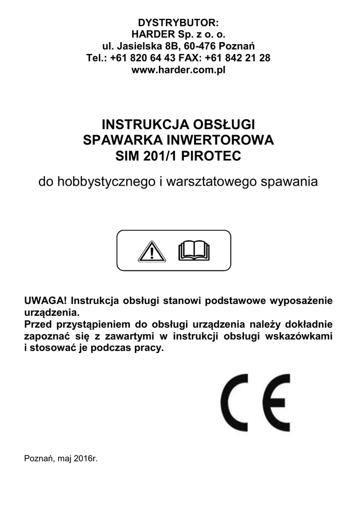 DYSTRYBUTOR: HARDER Sp. z o. o. ul. Jasielska 8B, 60-476 Poznań Tel.: +61 820 64 43 FAX: +61 842 21 28 www.harder.com.pl INSTRUKCJA OBSŁUGI SPAWARKA INWERTOROWA SIM 201/1 PIROTEC do hobbystycznego i warsztatowego spawania UWAGA! Instrukcja obsługi stanowi podstawowe wyposażenie urządzenia. Przed przystąpieniem do obsługi urządzenia należy dokładnie zapoznać się z zawartymi w instrukcji obsługi wskazówkami i stosować je podczas pracy. Poznań, maj 2016r. WPROWADZENIE Spawarka inwertorowa SIM 201/1 PIROTEC dzięki innowacyjnej technologii oraz wysokiej jakości materiałów zastosowanych do jej wytworzenia znakomicie sprawdza się w amatorskich pracach warsztatowych. Niewielka i lekka konstrukcja oraz wysoka wydajność urządzenia ułatwia pracę przy spawaniu materiałów ze stali niskostopowych, niskowęglowych itp. Funkcje HOT START (zapobiega przyklejaniu się elektrody do materiału w chwili zajarzenia łuku), ARC FORCE (regulacja długości łuku spawalniczego) i ANTI STICK (ułatwia oderwanie elektrody od spawanego materiału w przypadku zwarcia) znacznie podnoszą komfort pracy. Dodatkowo wyposażony w wyświetlacz wskazuje wartość wybranego prądu spawania i walizkę ułatwiającą przenoszenie i magazynowanie spawarki. UWAGA! Nie wolno używać urządzenia do celów innych niż, dla których zostało skonstruowane, zabrania się także dokonywania zmian w oryginalnej konstrukcji spawarki – w takich przypadkach dystrybutor i producent nie ponoszą odpowiedzialności za powstałe szkody, anulowaniu ulegają także warunki gwarancji. DANE TECHNICZNE URZĄDZENIA PARAMETRY Faza, napięcie i częstotliwość zasilania Zalecane parametry zasilania Zabezpieczenie i wtyk dla prądu wyjściowego I2 < 100A Zabezpieczenie i wtyk dla prądu wyjściowego I2 >100A Regulacja prądu spawania [A] +/-20% MODEL SIM 201/1 PIROTEC 1~230V 50/60Hz Przewód miedziany minimum 3x2,5mm 2 prosimy zainstalować w obwodzie elektrycznym zasilającym spawarkę bezpiecznik zwłoczny typu „D” Bezpiecznik 16A, wtyczka 16A (na wyposażeniu) Bezpiecznik 25A; wtyczka 32A (p. str 5 WSKAZÓWKI UŻYTKOWANIA) 20~200A Cykl pracy [%] 100 Prąd wyjściowy spawania [A] 130 160 Średnica elektrod [mm] 60 40 200 1.6-4.0 Zajarzenie łuku kontaktowe Stopień ochrony IP21S Wyposażenie standardowe: instrukcja obsługi uchwyt elektrody z przewodem roboczym, klema masy z przewodem roboczym, młotek i szczotka spawalnicze, maska spawalnicza. 1. Złącze uchwytu elektrody 2. Złącze klemy masy 3. Regulacja amperażu prądu Spawania 20-200A 4. Regulacja opcji ARC FORCE (0 -10) 5. Kontrolka zasilania 6. Przewód zasilania 7 Włącznik główny 8. Wentylator s. rys. 1 str. 2 9. Kontrolka termika 10. Wyświetlacz nastawny prądu spawania OPIS OZNAKOWAŃ I SYBOLI urządzenie spawalnicze jednofazowe spawanie łukowego ręczne elektrodami otulonymi rutylowymi spawarka może działać w miejscach z wyższym ryzykiem porażenia elektrycznego (np. w pobliżu dużych mas metalu) zasilanie jednofazowy prąd zmienny, częstotliwość prądu zasilania 50/60Hz stopień ochrony: urządzenie jest chronione przed ciałami stałymi o średnicy 12,5mm i większej oraz pionowo opadającymi kroplami wody E 60974-1:2012 oznaczenie normy dotyczącej urządzeń spawalniczych U0 X maksymalne napięcie prądu jałowego (obwód spawania otwarty) U1 U2 I1 I2 napięcie znamionowe prądu spawania [V] cykl pracy, określa przybliżony czas, w którym spawarka działa przy zastosowaniu wybranego natężenia prądu spawania (p. str. 6 pkt. 8) napięcie wtórne prądu spawania [V] natężenie znamionowe prądu spawania [A] natężenie wtórne prądu spawania [A] I1max …A I1eff …A największe natężenie znamionowe prądu spawania [A] rzeczywiste natężenie pobieranego prądu [A] urządzenie jest wyposażone w wentylator zakaz umieszczania zużytego sprzętu razem z innymi odpadami (szczegóły dotyczące utylizacji zużytego sprzętu el. str. 7) urządzenie należy chronić przed wilgocią rys. 2 str. 3 ZASADY BEZPIECZEŃSTWA UWAGA! Prosimy dokładnie przeczytać niniejszą instrukcję obsługi i stosować zawarte w niej wskazówki. W pobliżu miejsca pracy nie mogą znajdować się materiały łatwopalne i/lub wybuchowe. Inwerter należy ustawić na stabilnej, płaskiej i równej powierzchni; nie wolno stawiać urządzenia w pobliżu źródła ciepła. 3. Otwory wentylacyjne urządzenie nie mogą być zasłonięte podczas pracy. Minimalna odległość ścianki urządzenia od osłony (np. ściany) nie powinna być mniejsza niż 50cm. 4. Spawarki nie wolno stawiać na zbiornikach lub w pobliżu pojemników zawierających gazy oraz substancje łatwopalne, wybuchowe i/lub toksyczne. 5. Spawarki nie wolno stawiać na spawanych elementach. 6. Pomieszczenie, w którym używane jest urządzenie musi mieć dobrą wentylację – opary powstałe w czasie spawania mogą być groźne dla zdrowia użytkownika i osób postronnych. 7. Nie wolno użytkować urządzenia w miejscach, w których panuje wilgoć. 8. Nie wolno użytkować urządzenia na dworze kiedy pada deszcz lub śnieg. 9. Nie wolno użytkować urządzenia jeśli użytkownik znajduje się pod wpływem alkoholu, środków odurzających lub leków zmniejszających koncentrację. 10. Należy zwrócić uwagę na to aby w bezpośrednim pobliżu miejsca pracy i działającego urządzenia nie znajdowały się dzieci i/lub zwierzęta. 11. Urządzenie nie może być użytkowane przez osoby, które mają wszczepiony rozrusznik serca, elektryczne protezy (np. sztuczne kończyny; wzmacniacze słuchu). Ponadto osoby takie nie mogą zbliżać się do miejsca pracy kiedy urządzenie jest włączone. Pole elektromagnetyczne wytwarzane przez urządzenie podczas pracy może zakłócić działanie rozrusznika. 12. Podczas pracy nie należy patrzeć na światło wytwarzane przez łuk – może to spowodować uszkodzenie wzroku. Podczas użytkowania urządzenia należy zabezpieczyć oczy i twarz maską spawalni