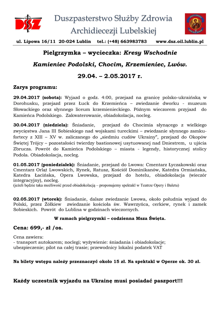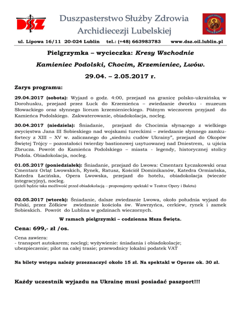 Duszpasterstwo Służby Zdrowia Archidiecezji Lubelskiej ul. Lipowa 16/11 20-024 Lublin tel.: (+48) 663983783 www.dsz.oil.lublin.pl Pielgrzymka – wycieczka: Kresy Wschodnie Kamieniec Podolski, Chocim, Krzemieniec, Lwów. 29.04. – 2.05.2017 r. Zarys programu: 29.04.2017 (sobota): Wyjazd o godz. 4:00, przejazd na granicę polsko-ukraińską w Dorohusku, przejazd przez Łuck do Krzemieńca – zwiedzanie dworku - muzeum Słowackiego oraz słynnego liceum krzemienieckiego. Późnym wieczorem przyjazd do Kamieńca Podolskiego. Zakwaterowanie, obiadokolacja, nocleg. 30.04.2017 (niedziela): Śniadanie, przejazd do Chocimia słynącego z wielkiego zwycięstwa Jana III Sobieskiego nad wojskami tureckimi – zwiedzanie słynnego zamkufortecy z XIII – XV w. zaliczanego do „siedmiu cudów Ukrainy”, przejazd do Okopów Świętej Trójcy – pozostałości twierdzy bastionowej usytuowanej nad Dniestrem, u ujścia Zbrucza. Powrót do Kamieńca Podolskiego – miasta - legendy, historycznej stolicy Podola. Obiadokolacja, nocleg. 01.05.2017 (poniedziałek): Śniadanie, przejazd do Lwowa: Cmentarz Łyczakowski oraz Cmentarz Orląt Lwowskich, Rynek, Ratusz, Kościół Dominikanów, Katedra Ormiańska, Katedra Łacińska, Opera Lwowska, przejazd do hotelu, obiadokolacja (wieczór integracyjny), nocleg. (jeżeli będzie taka możliwość przed obiadokolacją – proponujemy spektakl w Teatrze Opery i Baletu) 02.05.2017 (wtorek): Śniadanie, dalsze zwiedzanie Lwowa, około południa wyjazd do Polski, przez Żółkiew zwiedzanie kościoła św. Wawrzyńca, cerkiew, rynek i zamek Sobieskich. Powrót do Lublina w godzinach wieczornych. W ramach pielgrzymki – codzienna Msza Święta. Cena: 699,- zł /os. Cena zawiera: - transport autokarem; noclegi; wyżywienie: śniadania i obiadokolacje; ubezpieczenie; pilot na całej trasie; przewodnicy lokalni podatek VAT Na bilety wstępu należy przeznaczyć około 15 zł. Na spektakl w Operze ok. 30 zł. Każdy uczestnik wyjazdu na Ukrainę musi posiadać paszport!!! Zapisy: Zaliczka 200 zł. – do końca stycznia 2017 lub do wyczerpania limitu miejsc (50 osób) Ks. Wojciech Iwanicki Kapelan COZL Duszpasterz Służby Zdrowia Tel.: 663 983 783 e-mail: [email protected] Program jest dostępny na stronie: www.dsz.oil.lublin.pl Współorganizator: Biuro Podróży AVITUR ul. Narutowicza 22 20-004 Lublin tel. 81 534 60 10 kom. 600 9 527 36 www.avitur.pl
