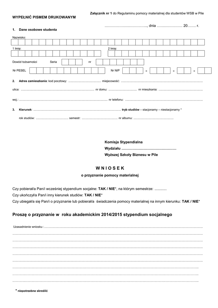 Załącznik nr 1 do Regulaminu pomocy materialnej dla studentów WSB w Pile WYPEŁNIĆ PISMEM DRUKOWANYM …………………………….., dnia ………………… 20……. r. 1. Dane osobowe studenta Nazwisko: 1 Imię: Dowód tożsamości 2 Imię: Seria nr Nr PESEL 2. Nr NIP - - - Adres zamieszkania: kod pocztowy: ....................................... miejscowość: .................................................................................................. ulica: ........................................................................................ nr domu: .................................. nr mieszkania: ..................................................... woj.: .......................................................................................................... nr telefonu: ............................................................................................. 3. Kierunek: ......................................................................................................... tryb studiów – stacjonarny – niestacjonarny * rok studiów: ....................................... semestr: ........................................... nr albumu: ................................................ Komisja Stypendialna Wydziału ……………………………………… Wyższej Szkoły Biznesu w Pile WNIOSEK o przyznanie pomocy materialnej Czy pobierał/a Pan/i wcześniej stypendium socjalne: TAK / NIE*, na którym semestrze: ............ Czy ukończył/a Pan/i inny kierunek studiów: TAK / NIE* Czy ubiegał/a się Pan/i o przyznanie lub pobierał/a świadczenia pomocy materialnej na innym kierunku: TAK / NIE* Proszę o przyznanie w roku akademickim 2014/2015 stypendium socjalnego Uzasadnienie wniosku : .............................................................................................................................................................................................. .................................................................................................................................................................................................................................... .................................................................................................................................................................................................................................... .................................................................................................................................................................................................................................... .................................................................................................................................................................................................................................... .................................................................................................................................................................................................................................... ……………………………………………………………………………………………………………………………………………………………………….. ……………………………………………………………………………………………………………………………………………………………………….. ……………………………………………………………………………………………………………………………………………………………………….. * niepotrzebne skreślić Oświadczam, że w skład mojej rodziny wchodzą następujące osoby: Pouczenie: za członków rodziny uważa się: 1. studenta, 2. małżonka studenta, a także będące na utrzymaniu studenta lub jego małżonka dzieci niepełnoletnie, dzieci pobierające naukę do 26 roku życia, a jeżeli 26 rok życia przypada w ostatnim roku studiów, do ich ukończenia, oraz dzieci niepełnosprawne bez względu na wiek, 3. rodziców, opiekunów prawnych lub faktycznych studenta i będące na ich utrzymaniu dzieci niepełnoletnie, dzieci pobierające naukę do 26 roku życia, a jeżeli 26 rok życia przypada w ostatnim roku studiów, do ich ukończenia, oraz dzieci niepełnosprawne bez względu na wiek. Student może ubiegać się o stypendium socjalne bez wykazywania dochodów osiąganych przez osoby, o których mowa w punkcie 3: 1. w przypadku gdy nie prowadzi wspólnego gospodarstwa domowego z żadnym z rodziców i potwierdził ten fakt w złożonym oświadczeniu oraz spełnia jedną z następujących przesłanek: a) ukończył 26 rok życia, b) pozostaje w związku małżeńskim, c) ma na utrzymaniu dzieci, o których mowa w punkcie 2, lub 2. jeżeli spełnia łącznie następujące warunki: a) posiadał stałe źródło dochodów w ostatnim roku podatkowym, b) posiada stałe źródło dochodów w roku bieżącym, c) jego miesięczny dochód w okresach, o których mowa w lit. a i b, jest wyższy lub równy 1,15 sumy kwoty określonej w art. 5 ust. 1 i kwoty określonej w art. 6 ust. 2 pkt 3 ustawy z dnia 28 listopada 2003 r. o świadczeniach rodzinnych (654,35 zł), d) nie prowadzi wspólnego gospodarstwa domowego z żadnym z rodziców i potwierdził ten fakt w złożonym oświadczeniu. Lp. Imię i nazwisko 1. Data urodzenia Stopień pokrewieństwa Nazwa i adres zakładu pracy, inne źródła utrzymania, nazwa szkoły Uwagi wnioskodawca 2. 3. 4. 5. 6. 7. W przypadku przyznania pomocy materialnej, proszę przekazać przyznaną mi kwotę na rachunek bankowy: Nazwa banku ............................................................................................................................................................................................. Numer konta: Oświadczam, że znam zasady i tryb udzielania pomocy materialnej dla studentów, które zostały ok