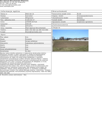 Nax-Agencja Nieruchomości Wiązowna Boryszewska 19, 05-462 Wiązowna tel.22 / 245-15-28 fax. e-mail:[email protected] www.naxmedia.com Informacje ogólne Nieruchomość Oferta nr NAX-GS-15 Powierzchnia działki [m2] 0.00 Rodzaj sprzedaż Zagosp. działki niezagospodarowana Lokalizacja Wiązowna Ukształtowanie działki płaska Pow. całkowita [m2] 1250.00 m² Kształt działki prostokąt Cena 255000.00 PLN Ogrodzenie działki częściowo ogrodzona Cena/m2 204.00 Status aktualna Imię i nazwisko NaX-Agencja Nieruchomości Telefon 602-346-066 lub 606-423-890 E-mail [email protected] Opis Plac zabaw nie Woda miejska Dojazd droga asfaltowa Otoczenie zabudowa jednorodzinna Alarm nie Winda nie Drzwi antywłamaniowe nie Kanalizacja w ulicy Bardzo ładna działka położona w najbardziej atrakcyjnej okolicy Wiązowny.Działka w pełni uzbrojona w media.W bezpośrednim sąsiedztwie-nowa willowa zabudowa jednorodzinna.Działka usytuowana ok.100m od nowej drogi asfaltowej z szerokim chodnikiem prowadzącym wzdłuż terenów leśnych.Piękna i zielona okolica gwarantuje komfortowe warunki mieszkaniowe.Do centrum Wiązowny ok.3 km-2 minuty samochodem.W odległości 2-4 km znajdują się szkoła,przedszkola publiczne i niepubliczne,żłobki,ośrodek zdrowia,wiele sklepów i placówek usługowych.Do końca roku 2014 w okolicy ok.8 km planowane jest duże centrum handlowe mieszczące 300 sklepów,kino,kręgle itp. UWAGA!!! Nasze usługi obejmują pomoc w uzyskaniu szybkiego, korzystnego kredytu oraz pełną obsługę prawną i notarialną - kredyty hipoteczne,podziały nieruchomości,wycena.Zapraszamy: 606 423 890, 602 346 066 © Wszelkie prawa zastrzeżone - Nax Pomieszczenia Zdjęcia