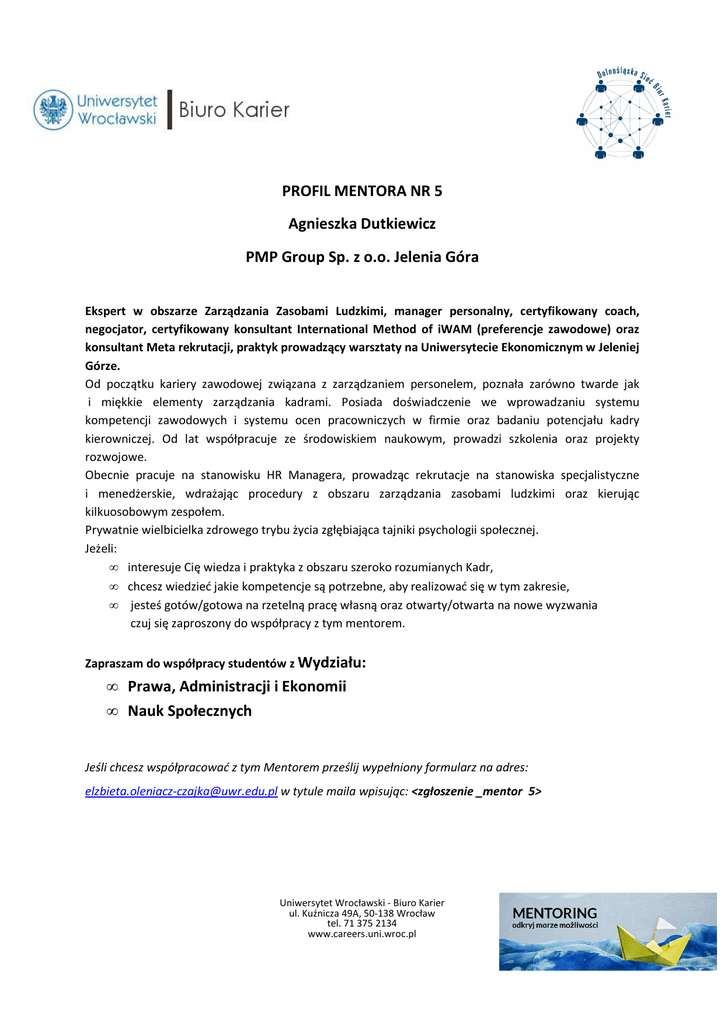 PROFIL MENTORA NR 5 Agnieszka Dutkiewicz PMP Group Sp. z o.o. Jelenia Góra Ekspert w obszarze Zarządzania Zasobami Ludzkimi, manager personalny, certyfikowany coach, negocjator, certyfikowany konsultant International Method of iWAM (preferencje zawodowe) oraz konsultant Meta rekrutacji, praktyk prowadzący warsztaty na Uniwersytecie Ekonomicznym w Jeleniej Górze. Od początku kariery zawodowej związana z zarządzaniem personelem, poznała zarówno twarde jak i miękkie elementy zarządzania kadrami. Posiada doświadczenie we wprowadzaniu systemu kompetencji zawodowych i systemu ocen pracowniczych w firmie oraz badaniu potencjału kadry kierowniczej. Od lat współpracuje ze środowiskiem naukowym, prowadzi szkolenia oraz projekty rozwojowe. Obecnie pracuje na stanowisku HR Managera, prowadząc rekrutacje na stanowiska specjalistyczne i menedżerskie, wdrażając procedury z obszaru zarządzania zasobami ludzkimi oraz kierując kilkuosobowym zespołem. Prywatnie wielbicielka zdrowego trybu życia zgłębiająca tajniki psychologii społecznej. Jeżeli: • interesuje Cię wiedza i praktyka z obszaru szeroko rozumianych Kadr, • chcesz wiedzieć jakie kompetencje są potrzebne, aby realizować się w tym zakresie, • jesteś gotów/gotowa na rzetelną pracę własną oraz otwarty/otwarta na nowe wyzwania czuj się zaproszony do współpracy z tym mentorem. Zapraszam do współpracy studentów z Wydziału: • Prawa, Administracji i Ekonomii • Nauk Społecznych Jeśli chcesz współpracować z tym Mentorem prześlij wypełniony formularz na adres: [email protected] w tytule maila wpisując: <zgłoszenie _mentor 5> Uniwersytet Wrocławski - Biuro Karier ul. Kuźnicza 49A, 50-138 Wrocław tel. 71 375 2134 www.careers.uni.wroc.pl