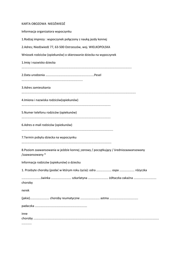 KARTA OBOZOWA NIEDŹWIEDŹ Informacja organizatora wypoczynku 1.Rodzaj imprezy : wypoczynek połączony z nauką jazdy konnej 2.Adres; Niedźwiedź 77, 63-500 Ostrzeszów, woj. WIELKOPOLSKA Wniosek rodziców (opiekunów) o skierowanie dziecka na wypoczynek 1.Imię i nazwisko dziecka …................................................................................................................................ 2.Data urodzenia ….......................................................Pesel …...................................................................... 3.Adres zamieszkania …..................................................................................................................................... 4.Imiona i nazwiska rodziców(opiekunów) …....................................................................................................... 5.Numer telefonu rodziców (opiekunów) …....................................................................................................... 6.Adres e-mail rodziców (opiekunów) ….......................................................................................................... 7.Termin pobytu dziecka na wypoczynku …........................................................................................................ 8.Poziom zaawansowania w jeździe konnej ;zerowy / początkujący / średniozaawansowany /zaawansowany * Informacja rodziców (opiekunów) o dziecku 1. Przebyte choroby (podać w którym roku życia): odra .................. ospa .................. różyczka .......................świnka ........................ szkarlatyna ........................ żółtaczka zakaźna ........................... choroby nerek (jakie)....................... choroby reumatyczne ....................... astma .................................. padaczka .............................................................. inne choroby ..................................................................................................................................................... ............ 2. U dziecka występowały w ostatnim roku lub występują obecnie: drgawki, utraty przytomności, zaburzenia równowagi, omdlenia, częste bóle brzucha, częste bóle głowy, lęki nocne, trudności w zasypianiu, tiki, moczenie nocne, wymioty, krwawienia z nosa, przewlekły kaszel (lub katar, anginy), duszność, bóle stawów, szybkie męczenie się, niedosłuch, jąkanie, inne* ......................................................................................................................................................... .................... .......... .. 3. Czy dziecko przyjmuje stale leki: tak – nie*. Jeżeli tak, to jakie i w jakich dawkach....................................................... 4. Dziecko jest: nieśmiałe, ma trudności w nawiązywaniu kontaktów, nadpobudliwe*. Inne informacje o usposobieniu i zachowaniu dziecka ...................................................................................................................................................... ..... 5. Dziecko jest uczulone: tak – nie*. Jeżeli tak, podać na co .............................................................................................. 6. Dziecko nosi: okulary, aparat ortodontyczny, wkładki ortopedyczne, inne aparaty* ....................................................... 7. Inne uwagi o zdrowiu dziecka ........................................................................................................................................ 8. Informacja wychowawcy klasy o dziecku (w przypadku braku możliwości uzyskania opinii wychowawcy klasy - wypełnia rodzic lub opiekun) .................................................................................................................................................... .......................................................................................................... ........................................................ ................................................................................................................................................................... ................................... …................................................................................................................................................................ .......................................................................................... data............................................... podpis wychowawcy,rodzica/opiekuna.......................................................................... W razie zagrożenia życia dziecka, zgadzam się na jego leczenie szpitalne, zabiegi diagnostyczne, operacje.* STWIERDZAM, ŻE PODAŁAM/EM WSZYSTKIE ZNANE MI INFORMACJE O DZIECKU, KTÓRE MOGĄ POMÓC W ZAPEWNIENIU MU WŁAŚCIWEJ OPIEKI W CZASIE POBYTU NA WAKACJACH W SIODLE -1- Wypoczynek z jazdą konną Niedźwiedź 2014 REGULAMIN UCZESTNIKA 1.Uczestnicy zakwaterowani są na terenie gospodarstwa agroturystycznego, stadniny koni 2.Uczestnik ma obowiązek : a) Brać udział w realizacji programu b) Przestrzegać ramowego rozkładu dnia c) Bezwzględnego podporządkowania się poleceniom wychowawców i instruktorów jazdy konnej d) Zachowania higieny osobistej, schludnego wyglądu i czystości w obiekcie oraz poszanowania mienia własnego, współuczestników oraz właścicieli obiektu f) Przestrzegać przepisów przeciwpożarowych, BHP i regulaminu stajni 3.Samowolne oddalenie się od opiekunów , niesubordynacja, niezdyscyplinowanie, nie wykonywanie poleceń wychowawców i instruktorów jazdy konnej, nieprzestrzeganie regulaminu karane będzie natychmiastowym odesłaniem uczestnika wypoczynku do domu na koszt rodziców lub prawnych opiekunów. W takich przypadkach rodzice(opiekunowie) zobowiązani są w przeciągu 24 godzin od momentu powiadomienia tel. zgłosić się po relegowanego z wypoczynku uczestnika. 4.Zabrania się