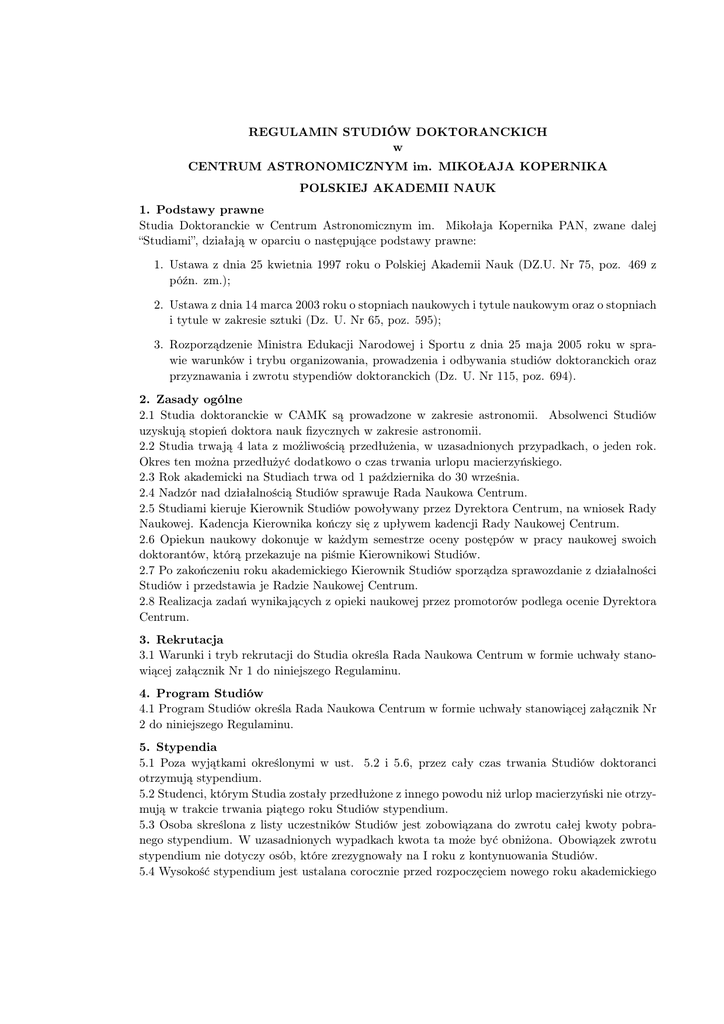REGULAMIN STUDIÓW DOKTORANCKICH w CENTRUM ASTRONOMICZNYM im. MIKOŁAJA KOPERNIKA POLSKIEJ AKADEMII NAUK 1. Podstawy prawne Studia Doktoranckie w Centrum Astronomicznym im. Mikołaja Kopernika PAN, zwane dalej “Studiami”, działają w oparciu o następujące podstawy prawne: 1. Ustawa z dnia 25 kwietnia 1997 roku o Polskiej Akademii Nauk (DZ.U. Nr 75, poz. 469 z późn. zm.); 2. Ustawa z dnia 14 marca 2003 roku o stopniach naukowych i tytule naukowym oraz o stopniach i tytule w zakresie sztuki (Dz. U. Nr 65, poz. 595); 3. Rozporządzenie Ministra Edukacji Narodowej i Sportu z dnia 25 maja 2005 roku w sprawie warunków i trybu organizowania, prowadzenia i odbywania studiów doktoranckich oraz przyznawania i zwrotu stypendiów doktoranckich (Dz. U. Nr 115, poz. 694). 2. Zasady ogólne 2.1 Studia doktoranckie w CAMK są prowadzone w zakresie astronomii. Absolwenci Studiów uzyskują stopień doktora nauk fizycznych w zakresie astronomii. 2.2 Studia trwają 4 lata z możliwością przedłużenia, w uzasadnionych przypadkach, o jeden rok. Okres ten można przedłużyć dodatkowo o czas trwania urlopu macierzyńskiego. 2.3 Rok akademicki na Studiach trwa od 1 października do 30 września. 2.4 Nadzór nad działalnością Studiów sprawuje Rada Naukowa Centrum. 2.5 Studiami kieruje Kierownik Studiów powoływany przez Dyrektora Centrum, na wniosek Rady Naukowej. Kadencja Kierownika kończy się z upływem kadencji Rady Naukowej Centrum. 2.6 Opiekun naukowy dokonuje w każdym semestrze oceny postępów w pracy naukowej swoich doktorantów, którą przekazuje na piśmie Kierownikowi Studiów. 2.7 Po zakończeniu roku akademickiego Kierownik Studiów sporządza sprawozdanie z działalności Studiów i przedstawia je Radzie Naukowej Centrum. 2.8 Realizacja zadań wynikających z opieki naukowej przez promotorów podlega ocenie Dyrektora Centrum. 3. Rekrutacja 3.1 Warunki i tryb rekrutacji do Studia określa Rada Naukowa Centrum w formie uchwały stanowiącej załącznik Nr 1 do niniejszego Regulaminu. 4. Program Studiów 4.1 Program Studiów określa Rada Naukowa Centrum w formie uchwały stanowiącej załącznik Nr 2 do niniejszego Regulaminu. 5. Stypendia 5.1 Poza wyjątkami określonymi w ust. 5.2 i 5.6, przez cały czas trwania Studiów doktoranci otrzymują stypendium. 5.2 Studenci, którym Studia zostały przedłużone z innego powodu niż urlop macierzyński nie otrzymują w trakcie trwania piątego roku Studiów stypendium. 5.3 Osoba skreślona z listy uczestników Studiów jest zobowiązana do zwrotu całej kwoty pobranego stypendium. W uzasadnionych wypadkach kwota ta może być obniżona. Obowiązek zwrotu stypendium nie dotyczy osób, które zrezygnowały na I roku z kontynuowania Studiów. 5.4 Wysokość stypendium jest ustalana corocznie przed rozpoczęciem nowego roku akademickiego decyzją Dyrektora Centrum. 5.5 Uczestnicy starszych lat Studiów mogą otrzymywać stypendium wyższe przeciętnie o 20 % od stypendium otrzymywanego przez uczestników roku pierwszego. Decyzja o przyznaniu wyższego stypendium podejmowana jest na podstawie oceny postępów pracy naukowej i rozwoju naukowego uczestnika Studiów, na którą składa się: – rozmowa Dyrektora Centrum, Kierownika Studiów i opiekuna naukowego z uczestnikiem Studiów, – liczba publikacji recenzowanych prac naukowych, – publikacje i działalność popularnonaukowa, – liczba wygłoszonych seminariów naukowych. 5.6 Dyrektor Centrum może nie przyznać stypendium lub cofnąć stypendium. W szczególności, cofnięcie stypendium może nastąpić po upływie 22 dni roboczych od chwili wyjazdu doktoranta na długoterminowy staż zagraniczny. 5.7 Wyjazdy doktorantów na konferencje i warsztaty naukowe oraz na obserwacje odbywają się na takich samych zasadach, jak wyjazdy pracowników Centrum. 5.8 Zasady ujęte w punktach od 5.1 do 5.5 nie dotyczą doktorantów, którzy nie są obywatelami RP, i których opłaty za studia regulowane są odrębnymi przepisami. 6. Sprawy socjalno - bytowe 6.1 Doktorant ma prawo do 8 tygodni przerwy w zajęciach w ciągu roku akademickiego. Przerwa ta jest odpowiednikiem wakacji studenckich. Terminy przerw w zajęciach w danym roku akademickim ustalane są przez Dyrektora Centrum w formie zarządzenia. 6.2 Doktorant ma prawo do korzystania z opieki medycznej na takich samych zasadach jak etatowy pracownik Centrum. Ma również prawo do dofinansowania kosztów okularów korygujących wzrok, na następujących zasadach: – Centrum pokrywa częściowo koszt wykonania okularów korygujących wzrok o parametrach zgodnych z zaleceniem lekarza okulisty. Wysokość udziału Centrum w pokrywaniu kosztów okularów wynosi 150 zł, – dofinansowanie kosztów wykonania okularów przez Centrum występuje raz w czasie trwania Studiów Doktoranckich, – podstawą zwrotu przez Centrum części kosztów okularów korygujących wzrok są: zaświadczenie od lekarza okulisty o zaleceniu korzystania z okularów podczas pracy przy komputerze, wniosek do Dyrektora Centrum, stanowiący Załącznik nr 3 do niniejszego Regulaminu oraz faktura VAT za okulary korygujące wzrok, wystawiona na Centrum. 6.3 Doktorant ma prawo korzystać z zakładowego funduszu świadczeń socjalnych. 6.4 Doktorant mieszkający poza Warszawą może ubiegać się o zakwaterowanie w hotelu Centrum. 6.5 Okres Studiów doktoranckich, niezależnie od daty ich zakończenia, nie dłuższy jednak niż cztery lata, zalicza się do okresu pracy, od którego zależą uprawnienia pracownicze, jeżeli obrona rozprawy doktorskiej nastąpi w ciągu roku od daty zakończenia tych Studiów. 6.6 Okres Studiów doktoranckich nie jest wliczany do okresu, od którego zależą uprawnienia emerytalne. 6.7 Dokumentację przebiegu Studiów każdego doktoranta prowadzi Sekretariat CAMK. 7. Postanowienia końcowe 7.1 Wszelkie zmiany w Regulaminie dokonane przez Radę Naukową Centrum wymagają zatwierdzenia przez Dyrektora Centrum. 7.2 Regulamin obowiązuje od 