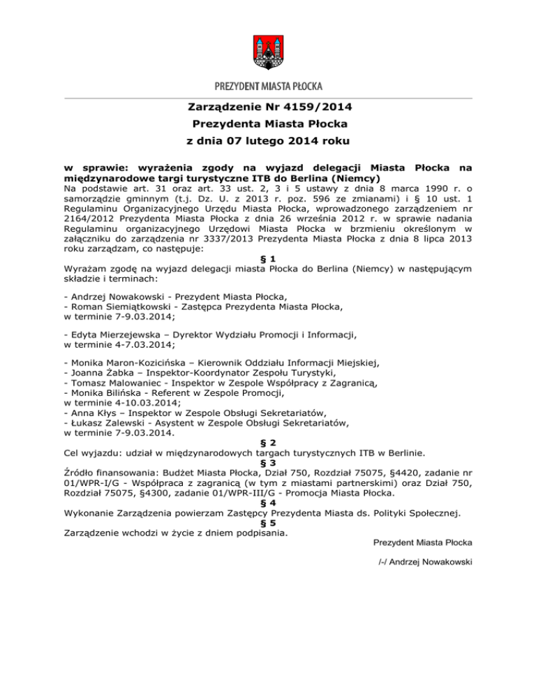 Zarządzenie Nr 4159/2014 Prezydenta Miasta Płocka z dnia 07 lutego 2014 roku w sprawie: wyrażenia zgody na wyjazd delegacji Miasta międzynarodowe targi turystyczne ITB do Berlina (Niemcy) Płocka na Na podstawie art. 31 oraz art. 33 ust. 2, 3 i 5 ustawy z dnia 8 marca 1990 r. o samorządzie gminnym (t.j. Dz. U. z 2013 r. poz. 596 ze zmianami) i § 10 ust. 1 Regulaminu Organizacyjnego Urzędu Miasta Płocka, wprowadzonego zarządzeniem nr 2164/2012 Prezydenta Miasta Płocka z dnia 26 września 2012 r. w sprawie nadania Regulaminu organizacyjnego Urzędowi Miasta Płocka w brzmieniu określonym w załączniku do zarządzenia nr 3337/2013 Prezydenta Miasta Płocka z dnia 8 lipca 2013 roku zarządzam, co następuje: §1 Wyrażam zgodę na wyjazd delegacji miasta Płocka do Berlina (Niemcy) w następującym składzie i terminach: - Andrzej Nowakowski - Prezydent Miasta Płocka, - Roman Siemiątkowski - Zastępca Prezydenta Miasta Płocka, w terminie 7-9.03.2014; - Edyta Mierzejewska – Dyrektor Wydziału Promocji i Informacji, w terminie 4-7.03.2014; - Monika Maron-Kozicińska – Kierownik Oddziału Informacji Miejskiej, - Joanna Żabka – Inspektor-Koordynator Zespołu Turystyki, - Tomasz Malowaniec - Inspektor w Zespole Współpracy z Zagranicą, - Monika Bilińska - Referent w Zespole Promocji, w terminie 4-10.03.2014; - Anna Kłys – Inspektor w Zespole Obsługi Sekretariatów, - Łukasz Zalewski - Asystent w Zespole Obsługi Sekretariatów, w terminie 7-9.03.2014. §2 Cel wyjazdu: udział w międzynarodowych targach turystycznych ITB w Berlinie. §3 Źródło finansowania: Budżet Miasta Płocka, Dział 750, Rozdział 75075, §4420, zadanie nr 01/WPR-I/G - Współpraca z zagranicą (w tym z miastami partnerskimi) oraz Dział 750, Rozdział 75075, §4300, zadanie 01/WPR-III/G - Promocja Miasta Płocka. §4 Wykonanie Zarządzenia powierzam Zastępcy Prezydenta Miasta ds. Polityki Społecznej. §5 Zarządzenie wchodzi w życie z dniem podpisania. Prezydent Miasta Płocka /-/ Andrzej Nowakowski