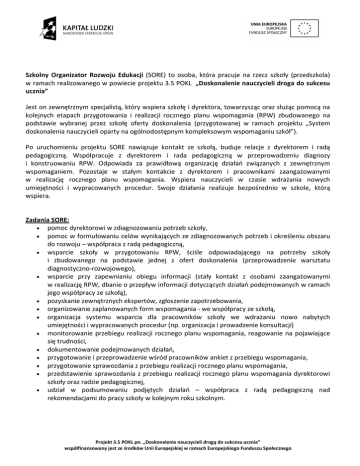 Szkolny Organizator Rozwoju Edukacji (SORE) to osoba, która pracuje na rzecz szkoły (przedszkola) w ramach realizowanego w powiecie projektu 3.5 POKL „Doskonalenie nauczycieli droga do sukcesu ucznia” Jest on zewnętrznym specjalistą, który wspiera szkołę i dyrektora, towarzysząc oraz służąc pomocą na kolejnych etapach przygotowania i realizacji rocznego planu wspomagania (RPW) zbudowanego na podstawie wybranej przez szkołę oferty doskonalenia (przygotowanej w ramach projektu „System doskonalenia nauczycieli oparty na ogólnodostępnym kompleksowym wspomaganiu szkół”). Po uruchomieniu projektu SORE nawiązuje kontakt ze szkołą, buduje relacje z dyrektorem i radą pedagogiczną. Współpracuje z dyrektorem i rada pedagogiczną w przeprowadzeniu diagnozy i konstruowaniu RPW. Odpowiada za prawidłową organizację działań związanych z zewnętrznym wspomaganiem. Pozostaje w stałym kontakcie z dyrektorem i pracownikami zaangażowanymi w realizację rocznego planu wspomagania. Wspiera nauczycieli w czasie wdrażania nowych umiejętności i wypracowanych procedur. Swoje działania realizuje bezpośrednio w szkole, którą wspiera. Zadania SORE: pomoc dyrektorowi w zdiagnozowaniu potrzeb szkoły, pomoc w formułowaniu celów wynikających ze zdiagnozowanych potrzeb i określeniu obszaru do rozwoju – współpraca z radą pedagogiczną, wsparcie szkoły w przygotowaniu RPW, ściśle odpowiadającego na potrzeby szkoły i zbudowanego na podstawie jednej z ofert doskonalenia (przeprowadzenie warsztatu diagnostyczno-rozwojowego), wsparcie przy zapewnianiu obiegu informacji (stały kontakt z osobami zaangażowanymi w realizację RPW, dbanie o przepływ informacji dotyczących działań podejmowanych w ramach jego współpracy ze szkołą), pozyskanie zewnętrznych ekspertów, zgłoszenie zapotrzebowania, organizowanie zaplanowanych form wspomagania - we współpracy ze szkołą, organizacja systemu wsparcia dla pracowników szkoły we wdrażaniu nowo nabytych umiejętności i wypracowanych procedur (np. organizacja i prowadzenie konsultacji) monitorowanie przebiegu realizacji rocznego planu wspomagania, reagowanie na pojawiające się trudności, dokumentowanie podejmowanych działań, przygotowanie i przeprowadzenie wśród pracowników ankiet z przebiegu wspomagania, przygotowanie sprawozdania z przebiegu realizacji rocznego planu wspomagania, przedstawienie sprawozdania z przebiegu realizacji rocznego planu wspomagania dyrektorowi szkoły oraz radzie pedagogicznej, udział w podsumowaniu podjętych działań – współpraca z radą pedagogiczną nad rekomendacjami do pracy szkoły w kolejnym roku szkolnym. Projekt 3.5 POKL pn. „Doskonalenie nauczycieli drogą do sukcesu ucznia” współfinansowany jest ze środków Unii Europejskiej w ramach Europejskiego Funduszu Społecznego