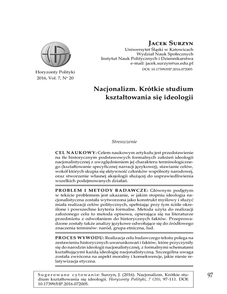 Horyzonty Polityki Jacek Surzyn Uniwersytet Śląski w Katowicach Wydział Nauk Społecznych Instytut Nauk Politycznych i Dziennikarstwa e‑mail: [email protected] DOI: 10.17399/HP.2016.072005 Horyzonty Polityki 2016, Vol. 7, No 20 Nacjonalizm. Krótkie studium kształtowania się ideologii Streszczenie CEL NAUKOWY: Celem naukowym artykułu jest przedstawienie na tle historycznym podstawowych formalnych założeń ideologii nacjonalistycznej z uwzględnieniem jej charakteru terminologiczne‑ go (kształtowanie specyficznej narracji językowej), stawianie celów, wokół których skupia się aktywność członków wspólnoty narodowej, oraz stworzenie własnej aksjologii służącej do usprawiedliwienia wszelkich podejmowanych działań. P R O B L E M I M E T O D Y B A D AW C Z E : Głównym podjętym w tekście problemem jest ukazanie, w jakim stopniu ideologia na‑ cjonalistyczna została wytworzona jako konstrukt myślowy i służyć miała realizacji celów politycznych, spełniając przy tym ściśle okre‑ ślone i powszechne kryteria formalne. Metoda użyta do realizacji założonego celu to metoda opisowa, opierająca się na literaturze przedmiotu z odwołaniem do historycznych faktów. Przeprowa‑ dzone zostały także analizy językowe odwołujące się do źródłowego znaczenia terminów: naród, grupa etniczna, lud. PROCES WYWODU: Realizacja celu badawczego tekstu polega na zestawieniu historycznych uwarunkowań i faktów, które przyczyniły się do narodzin ideologii nacjonalistycznej, z formalnymi schematami kształtującymi każdą ideologię nacjonalistyczną. Szczególna uwaga została zwrócona na aspekt moralny i konsekwencje, jakie niesie re‑ latywizacja etyczna. S u g e r o w a n e c y t o w a n i e: Surzyn, J. (2016). Nacjonalizm. Krótkie stu‑ dium kształtowania się ideologii. Horyzonty Polityki, 7 (20), 97‑111. DOI: 10.17399/HP.2016.072005. 97 Jacek Surzyn WYNIKI ANALIZY NAUKOWEJ: Tekst skrótowo sygnalizuje przyczyny negatywnego ujmowania nacjonalizmu. Wskazuje także na niebezpieczeństwa tkwiące w tej ideologii, opierając się na historycznych przykładach związa‑ nych z nazizmem i komunizmem, które to doktryny wykorzystywały ideologię nacjonalistyczną. WNIOSKI, INNOWACJE, REKOMENDACJE: Przede wszystkim w tek‑ ście zwrócona jest uwaga na niebezpieczeństwa wynikające z relatywizmu etycz‑ nego i wytwarzania przez każdą ideologię nacjonalistyczną własnego porządku wartości. Tekst sygnalizuje, że możliwość dokonywania masowych zbrodni i eksterminacji charakteryzująca największe totalitaryzmy XX wieku wynikała właśnie z przyjęcia usprawiedliwionej skutecznością działania i realizacji zało‑ żonego celu specyficznej aksjologii. Słowa kluczeow: nacjonalizm, naród, ideologia, wspólnota, państwo NATIONALISM. A SHORT STUDY FORMATION OF THE IDEOLOGY Abstract RESEARCH OBJECTIVE: The aim of this article is present the historical background of formal basic assumptions of nationalist ideology in regard to the nature of terminology (formation of a specific narrative language), goal setting for activity of the members of national community, and create its own axiology used to justify any taken actions. T H E R E S E A R C H P R O B L E M A N D M E T H O D S : The main problem, which is taken in the text is the question how nationalist ideology has been produced as a mental construct, which would serve for realization of political aims, with the strict and universal formal criteria. The method used to achieved the stated aim is descriptive method with reference to the historical facts. There were also carried linguistic analysis referring to the source meaning of the terms nation, ethnic group or people. THE PROCESS OF ARGUMENTATION: Realization of the research aim consists the combination of historical circumstances and facts that led to the birth of nationalist ideology with the formal patterns shaping every nationalist ideologies. Particular attention was paid to the moral aspect and consequences, which are effects of ethical relativism. RESEARCH RESULTS: Text briefly indicates the causes of negative recogni‑ tion of nationalism. It also points to the dangers inherent in this ideology based 98 Nacjonalizm. Krótkie studium kształtowania się ideologii on historical examples associated with Nazism and communism, which both used the nationalist ideology for their ideological aims. CONCLUSIONS, INNOVATIONS AND RECOMMENDATIONS: First of all there was paid attention to the dangers of ethical relativism and crea‑ tion for every nationalist ideology its own order of values. Articles indicates that the ability to make mass murder and extermination characterized the greatest to‑ talitarianisms of the twentieth century was due to the adoption justified efficiency of operation and achieved for realization of nationalist aim specific axiology. Keywords: nationalism, nation, ideology, community, state WSTĘP Nacjonalizm jest ideologią, która miała ogromne znaczenie w kształ‑ towaniu życia społecznego i politycznego w XX wieku. Zarazem jest to ideologia stosunkowo młoda i bardzo zróżnicowana, choć w wy‑ miarze formalnym można wydzielić kilka wspólnych jej składni‑ ków. Nacjonalizm od samego początku odwoływał się do kontekstu dziejowego i historycznego, co sprawiło, że elementem składowym każdej koncepcji lub doktryny nacjonalistycznej jest historyczny mit początku. Nacjonalizm w decydującym stopniu determinował więc (i determinuje także dziś) poczucie świadomości historycznej wśród narodów, zarówno w wymiarze świadomości ciągłości histo‑ rycznego trwania jakiejś grupy społecznej, etnicznej czy narodowej, jak też i poczucia dumy z własnych dokonań w przeszłości, a także potrzeby odbudowania ewentualnie zniszczonej (utraconej) dawnej potęgi. Postrzeganie dziejów (historii) jako permanentnej konfron‑ tacji i rywalizacji na poziomie „narodowym”, nawet jeśli świad