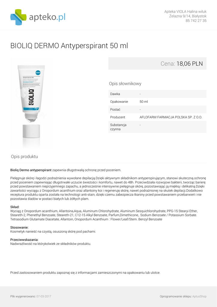 Apteka VIOLA Halina wiluk Żelazna 9/14, Białystok 85 742 27 35 BIOLIQ DERMO Antyperspirant 50 ml Cena: 18,06 PLN Opis słownikowy Dawka - Opakowanie 50 ml Postać - Producent AFLOFARM FARMACJA POLSKA SP. Z O.O. Substancja czynna - Opis produktu Bioliq Dermo antyperspirant zapewnia długotrwałą ochronę przed poceniem. Pielęgnuje skórę i łagodzi podrażnienia wywołane depilacją.Dzięki aktywnym składnikom antyperspirującym, stanowi skuteczną ochronę przed poceniem zapewniając długotrwałe uczucie świeżości i komfortu, nawet do 48h. Przeciwdziała rozwojowi bakterii, tworząc barierę przed powstawaniem nieprzyjemnego zapachu, a jednocześnie intensywnie pielęgnuje skórę, pozostawiając ją miękką i delikatną.Dzięki zawartości wyciągu z Onopordum acanthium oraz allantoiny koi i regeneruję skórę, nawet podrażnionej na skutek depilacji.Dodatkowo receptura produktu oparta została na technologii anti-stain, dzięki czemu zabezpiecza tkaniny przed powstawaniem przebarwień i nie pozostawia śladów w postaci białych lub żółtych plam. Skład: Wyciąg z Onopordum acanthium, Allantoina,Aqua, Aluminum Chlorohydrate, Aluminum Sesquichlorohydrate, PPG-15 Stearyi Ether, Steareth-2, Phenethyl Benzoate, Steareth-21, C12-15 Alkyl Benzoate, Parfum,Dimethicone,. Sodium Benzoate / Potassium Sorbate. Tetrasodium Glutamate Diacetate, Allantoin, Onopordum Acanthium : Flower/Leaf/Stem. Benzyl Benzoate Stosowanie: Kosmetyk nanieść na czystą, osuszoną skórę pod pachami. Przeciwwskazania: Nadwrażliwość na którykolwiek ze składników produktu. Przed zastosowaniem produktu zapoznaj się z informacjami zamieszczonymi na opakowaniu lub ulotce. Plik wygenerowano: 07-03-2017 Oprogramowanie sklepu: AptusShop Apteka VIOLA Halina wiluk Żelazna 9/14, Białystok 85 742 27 35 Plik wygenerowano: 07-03-2017 Powered by TCPDF (www.tcpdf.org) Oprogramowanie sklepu: AptusShop