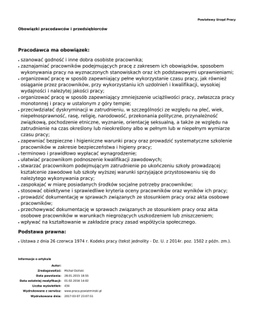 Powiatowy Urząd Pracy Obowiązki pracodawców i przedsiębiorców Pracodawca ma obowiązek: ● ● ● ● ● ● ● ● ● ● ● ● ● ● szanować godność i inne dobra osobiste pracownika; zaznajamiać pracowników podejmujących pracę z zakresem ich obowiązków, sposobem wykonywania pracy na wyznaczonych stanowiskach oraz ich podstawowymi uprawnieniami; organizować pracę w sposób zapewniający pełne wykorzystanie czasu pracy, jak również osiąganie przez pracowników, przy wykorzystaniu ich uzdolnień i kwalifikacji, wysokiej wydajności i należytej jakości pracy; organizować pracę w sposób zapewniający zmniejszenie uciążliwości pracy, zwłaszcza pracy monotonnej i pracy w ustalonym z góry tempie; przeciwdziałać dyskryminacji w zatrudnieniu, w szczególności ze względu na płeć, wiek, niepełnosprawność, rasę, religię, narodowość, przekonania polityczne, przynależność związkową, pochodzenie etniczne, wyznanie, orientację seksualną, a także ze względu na zatrudnienie na czas określony lub nieokreślony albo w pełnym lub w niepełnym wymiarze czasu pracy; zapewniać bezpieczne i higieniczne warunki pracy oraz prowadzić systematyczne szkolenie pracowników w zakresie bezpieczeństwa i higieny pracy; terminowo i prawidłowo wypłacać wynagrodzenie; ułatwiać pracownikom podnoszenie kwalifikacji zawodowych; stwarzać pracownikom podejmującym zatrudnienie po ukończeniu szkoły prowadzącej kształcenie zawodowe lub szkoły wyższej warunki sprzyjające przystosowaniu się do należytego wykonywania pracy; zaspokajać w miarę posiadanych środków socjalne potrzeby pracowników; stosować obiektywne i sprawiedliwe kryteria oceny pracowników oraz wyników ich pracy; prowadzić dokumentację w sprawach związanych ze stosunkiem pracy oraz akta osobowe pracowników; przechowywać dokumentację w sprawach związanych ze stosunkiem pracy oraz akta osobowe pracowników w warunkach niegrożących uszkodzeniem lub zniszczeniem; wpływać na kształtowanie w zakładzie pracy zasad współżycia społecznego. Podstawa prawna: ● Ustawa z dnia 26 czerwca 1974 r. Kodeks pracy (tekst jednolity - Dz. U. z 2014r. poz. 1502 z późn. zm.). Informacje o artykule Autor: Zredagował(a): Michał Osiński Data powstania: 28.01.2015 18:55 Data ostatniej modyfikacji: 01.02.2016 14:02 Liczba wyświetleń: Wydrukowano z serwisu: Wydrukowano dnia: 434 www.praca.powiatminski.pl 2017-03-07 23:07:51