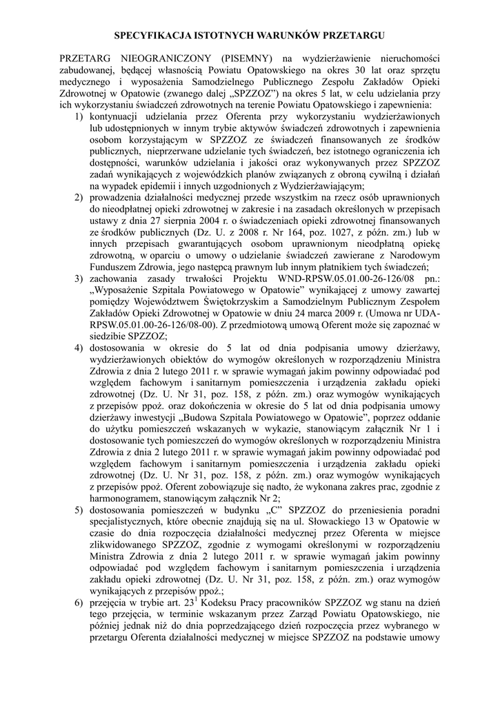 SPECYFIKACJA ISTOTNYCH WARUNKÓW PRZETARGU PRZETARG NIEOGRANICZONY (PISEMNY) na wydzierżawienie nieruchomości zabudowanej, będącej własnością Powiatu Opatowskiego na okres 30 lat oraz sprzętu medycznego i wyposażenia Samodzielnego Publicznego Zespołu Zakładów Opieki Zdrowotnej w Opatowie (zwanego dalej „SPZZOZ”) na okres 5 lat, w celu udzielania przy ich wykorzystaniu świadczeń zdrowotnych na terenie Powiatu Opatowskiego i zapewnienia: 1) kontynuacji udzielania przez Oferenta przy wykorzystaniu wydzierżawionych lub udostępnionych w innym trybie aktywów świadczeń zdrowotnych i zapewnienia osobom korzystającym w SPZZOZ ze świadczeń finansowanych ze środków publicznych, nieprzerwane udzielanie tych świadczeń, bez istotnego ograniczenia ich dostępności, warunków udzielania i jakości oraz wykonywanych przez SPZZOZ zadań wynikających z wojewódzkich planów związanych z obroną cywilną i działań na wypadek epidemii i innych uzgodnionych z Wydzierżawiającym; 2) prowadzenia działalności medycznej przede wszystkim na rzecz osób uprawnionych do nieodpłatnej opieki zdrowotnej w zakresie i na zasadach określonych w przepisach ustawy z dnia 27 sierpnia 2004 r. o świadczeniach opieki zdrowotnej finansowanych ze środków publicznych (Dz. U. z 2008 r. Nr 164, poz. 1027, z późn. zm.) lub w innych przepisach gwarantujących osobom uprawnionym nieodpłatną opiekę zdrowotną, w oparciu o umowy o udzielanie świadczeń zawierane z Narodowym Funduszem Zdrowia, jego następcą prawnym lub innym płatnikiem tych świadczeń; 3) zachowania zasady trwałości Projektu WND-RPSW.05.01.00-26-126/08 pn.: „Wyposażenie Szpitala Powiatowego w Opatowie” wynikającej z umowy zawartej pomiędzy Województwem Świętokrzyskim a Samodzielnym Publicznym Zespołem Zakładów Opieki Zdrowotnej w Opatowie w dniu 24 marca 2009 r. (Umowa nr UDARPSW.05.01.00-26-126/08-00). Z przedmiotową umową Oferent może się zapoznać w siedzibie SPZZOZ; 4) dostosowania w okresie do 5 lat od dnia podpisania umowy dzierżawy, wydzierżawionych obiektów do wymogów określonych w rozporządzeniu Ministra Zdrowia z dnia 2 lutego 2011 r. w sprawie wymagań jakim powinny odpowiadać pod względem fachowym i sanitarnym pomieszczenia i urządzenia zakładu opieki zdrowotnej (Dz. U. Nr 31, poz. 158, z późn. zm.) oraz wymogów wynikających z przepisów ppoż. oraz dokończenia w okresie do 5 lat od dnia podpisania umowy dzierżawy inwestycji „Budowa Szpitala Powiatowego w Opatowie”, poprzez oddanie do użytku pomieszczeń wskazanych w wykazie, stanowiącym załącznik Nr 1 i dostosowanie tych pomieszczeń do wymogów określonych w rozporządzeniu Ministra Zdrowia z dnia 2 lutego 2011 r. w sprawie wymagań jakim powinny odpowiadać pod względem fachowym i sanitarnym pomieszczenia i urządzenia zakładu opieki zdrowotnej (Dz. U. Nr 31, poz. 158, z późn. zm.) oraz wymogów wynikających z przepisów ppoż. Oferent zobowiązuje się nadto, że wykonana zakres prac, zgodnie z harmonogramem, stanowiącym załącznik Nr 2; 5) dostosowania pomieszczeń w budynku „C” SPZZOZ do przeniesienia poradni specjalistycznych, które obecnie znajdują się na ul. Słowackiego 13 w Opatowie w czasie do dnia rozpoczęcia działalności medycznej przez Oferenta w miejsce zlikwidowanego SPZZOZ, zgodnie z wymogami określonymi w rozporządzeniu Ministra Zdrowia z dnia 2 lutego 2011 r. w sprawie wymagań jakim powinny odpowiadać pod względem fachowym i sanitarnym pomieszczenia i urządzenia zakładu opieki zdrowotnej (Dz. U. Nr 31, poz. 158, z późn. zm.) oraz wymogów wynikających z przepisów ppoż.; 6) przejęcia w trybie art. 231 Kodeksu Pracy pracowników SPZZOZ wg stanu na dzień tego przejęcia, w terminie wskazanym przez Zarząd Powiatu Opatowskiego, nie później jednak niż do dnia poprzedzającego dzień rozpoczęcia przez wybranego w przetargu Oferenta działalności medycznej w miejsce SPZZOZ na podstawie umowy dzierżawy oraz zapewnienia przejętym pracownikom odpowiedniego pakietu socjalnego. I. OPIS PRZEDMIOT PRZETARGU 1. Przedmiot dzierżawy obejmuje: a) nieruchomość zabudowaną, położoną w Opatowie, przy ulicy Szpitalnej 4, o powierzchni 3,9558 ha, składającej się z działki oznaczonej w ewidencji gruntów i budynków numerem 2033/1, położoną w obrębie 1 Miasta Opatów, dla której prowadzona jest Księga Wieczysta KI1T/00029131/0 w Sądzie Rejonowy w Opatowie, IV Wydział Ksiąg Wieczystych w Opatowie - z przeznaczeniem na kontynuowanie udzielania przez Oferenta przy wykorzystaniu wydzierżawionych lub udostępnionych w innym trybie aktywów świadczeń zdrowotnych i zapewnienia osobom korzystającym w SPZZOZ ze świadczeń finansowanych ze środków publicznych, nieprzerwane udzielanie tych świadczeń, bez istotnego ograniczenia ich dostępności, warunków udzielania i jakości oraz wykonywanych przez SPZZOZ zadań wynikających z wojewódzkich planów związanych z obroną cywilną i działań na wypadek epidemii i innych uzgodnionych z Wydzierżawiającym Nieruchomość opisana powyżej stanowi w dacie niniejszego ogłoszenia przedmiot umowy użyczenia na rzecz SPZZOZ i jest obciążona służebnością przechodu i przejazdu ustanowioną na rzecz właściciela działki oznaczonej w ewidencji gruntów numerem 2033/2 Świętokrzyskiego Centrum Ratownictwa Medycznego i Transportu Sanitarnego w Kielcach. Przebieg służebności prezentuje mapa sytuacyjna, stanowiąca załącznik Nr 3 oraz innymi umowami, których wykaz stanowi załącznik Nr 4; b) Wyposażenie i sprzęt medyczny SPZZOZ, zgodnie z załącznikiem Nr 5, przeznaczony do kontynuowania świadczeń zdrowotnych opisanych w pkt a. 2. Ponadto wyposażanie i sprzęt medyczny darowany przez Fundację WOŚP oraz zakupiony ze środków unijnych w ramach projektu „Wyposażenie Szpitala Powiatowego w Opatowie”, zostanie użyczony dzierżawcy na okres 5 lat z przeznaczeniem na prowadzenie działalności medycznej,