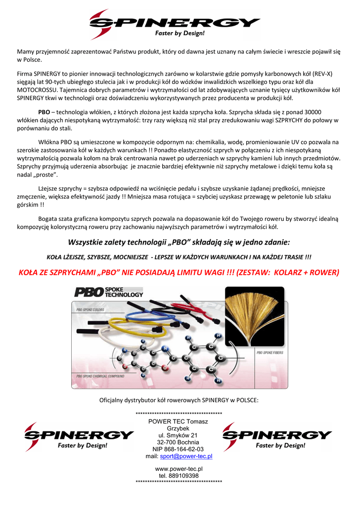 Faster by Design! Mamy przyjemność zaprezentować Państwu produkt, który od dawna jest uznany na całym świecie i wreszcie pojawił się w Polsce. Firma SPINERGY to pionier innowacji technologicznych zarówno w kolarstwie gdzie pomysły karbonowych kół (REV-X) sięgają lat 90-tych ubiegłego stulecia jak i w produkcji kół do wózków inwalidzkich wszelkiego typu oraz kół dla MOTOCROSSU. Tajemnica dobrych parametrów i wytrzymałości od lat zdobywających uznanie tysięcy użytkowników kół SPINERGY tkwi w technologii oraz doświadczeniu wykorzystywanych przez producenta w produkcji kół. PBO – technologia włókien, z których złożona jest każda szprycha koła. Szprycha składa się z ponad 30000 włókien dających niespotykaną wytrzymałość: trzy razy większą niż stal przy zredukowaniu wagi SZPRYCHY do połowy w porównaniu do stali. Włókna PBO są umieszczone w kompozycie odpornym na: chemikalia, wodę, promieniowanie UV co pozwala na szerokie zastosowania kół w każdych warunkach !! Ponadto elastyczność szprych w połączeniu z ich niespotykaną wytrzymałością pozwala kołom na brak centrowania nawet po uderzeniach w szprychy kamieni lub innych przedmiotów. Szprychy przyjmują uderzenia absorbując je znacznie bardziej efektywnie niż szprychy metalowe i dzięki temu koła są nadal „proste”. Lżejsze szprychy = szybsza odpowiedź na wciśnięcie pedału i szybsze uzyskanie żądanej prędkości, mniejsze zmęczenie, większa efektywność jazdy !! Mniejsza masa rotująca = szybciej uzyskasz przewagę w peletonie lub szlaku górskim !! Bogata szata graficzna kompozytu szprych pozwala na dopasowanie kół do Twojego roweru by stworzyć idealną kompozycję kolorystyczną roweru przy zachowaniu najwyższych parametrów i wytrzymałości kół. Wszystkie zalety technologii „PBO” składają się w jedno zdanie: KOŁA LŻEJSZE, SZYBSZE, MOCNIEJSZE - LEPSZE W KAŻDYCH WARUNKACH I NA KAŻDEJ TRASIE !!! KOŁA ZE SZPRYCHAMI „PBO” NIE POSIADAJĄ LIMITU WAGI !!! (ZESTAW: KOLARZ + ROWER) Oficjalny dystrybutor kół rowerowych SPINERGY w POLSCE: Faster by Design! ************************************* POWER TEC Tomasz Grzybek ul. Smyków 21 32-700 Bochnia NIP 868-164-62-03 mail: [email protected] www.power-tec.pl tel. 889109398 ************************************* Faster by Design!