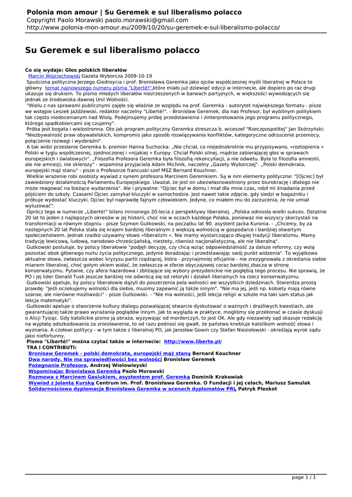 Polonia mon amour | Su Geremek e sul liberalismo polacco Copyright Paolo Morawski [email protected] http://www.polonia-mon-amour.eu/2009/10/20/su-geremek-e-sul-liberalismo-polacco/ Su Geremek e sul liberalismo polacco Co się wydaje: Głos polskich liberałów Marcin Wojciechowski, Gazeta Wyborcza 2009-10-19 Spuścizna polityczna Jerzego Giedroycia i prof. Bronisława Geremka jako ojców współczesnej myśli liberalnej w Polsce to główny temat najnowszego numeru pisma "Liberté!",które miało już dziewięć edycji w internecie, ale dopiero po raz drugi ukazuje się drukiem. To pismo młodych liberałów niezrzeszonych w barwach partyjnych, w większości wywodzących się jednak ze środowiska dawnej Unii Wolności. "Wielu z nas sprawami publicznymi zajęło się właśnie ze względu na prof. Geremka - autorytet największego formatu - pisze we wstępie Leszek Jażdżewski, redaktor naczelny "Liberté!". - Bronisław Geremek, dla nas Profesor, był wybitnym politykiem tak często niedocenianym nad Wisłą. Podejmujemy próbę przedstawienia i zinterpretowania jego programu politycznego, którego spadkobiercami się czujemy". Próba jest bogata i wielostronna. Oto jak program polityczny Geremka streszcza b. wiceszef "Rzeczpospolitej" Jan Skórzyński: "Niezbywalność praw obywatelskich, kompromis jako sposób rozwiązywania konfliktów, kategoryczne odrzucenie przemocy, połączenie rozwagi i wyobraźni". A tak widzi przesłanie Geremka b. premier Hanna Suchocka: „Nie chciał, co niejednokrotnie mu przypisywano, »roztopienia « Polski w tyglu współczesnej, zjednoczonej i »nijakiej « Europy. Chciał Polski silnej, mądrze zabierającej głos w sprawach europejskich i światowych". „Filozofia Profesora Geremka była filozofią rekoncyliacji, a nie odwetu. Była to filozofia amnestii, ale nie amnezji, nie sklerozy" - wspomina przyjaciela Adam Michnik, naczelny „Gazety Wyborczej". „Polski demokrata, europejski mąż stanu" - pisze o Profesorze francuski szef MSZ Bernard Kouchner. Wielkie wrażenie robi osobisty wywiad z synem profesora Marcinem Geremkiem. Są w nim elementy polityczne: "[Ojciec] był zawiedziony działalnością Parlamentu Europejskiego. Uważał, że jest on ubezwłasnowolniony przez biurokrację i dlatego nie może reagować na bieżące wydarzenia". Ale i prywatne: "Ojciec był w domu i miał dla mnie czas, robił mi śniadania przed pójściem do szkoły. Czasami Ojciec zamykał kluczyki w samochodzie. Jest nawet takie zdjęcie, gdy siedzi w bagażniku i próbuje wydostać kluczyki. Ojciec był naprawdę fajnym człowiekiem. Jedyne, co miałem mu do zarzucenia, że nie umiał wyluzować". Oprócz tego w numerze „Liberté!" bilans minionego 20-lecia z perspektywy liberalnej. „Polska odniosła wielki sukces. Ostatnie 20 lat to jeden z najlepszych okresów w jej historii, choć nie w oczach każdego Polaka, ponieważ nie wszyscy skorzystali na transformacji w równym stopniu - pisze Szymon Gutkowski, na początku lat 90. asystent Jacka Kuronia. - „Chcemy, by za następnych 20 lat Polska stała się krajem bardziej liberalnym z większą wolnością w gospodarce i bardziej otwartym społeczeństwem. Jednak rzadko używamy słowo »liberalizm «. Nie mamy wystarczająco długiej tradycji liberalizmu. Mamy tradycję lewicową, ludową, narodowo-chrześcijańską, niestety, również nacjonalistyczną, ale nie liberalną". Gutkowski postuluje, by polscy liberałowie "podjęli decyzję, czy chcą wziąć odpowiedzialność za dalsze reformy, czy wolą pozostać obok głównego nurtu życia politycznego, jedynie doradzając i przedstawiając swój punkt widzenia". To wyjątkowo aktualne słowa, zwłaszcza wobec kryzysu partii rządzącej, która - przynajmniej oficjalnie - nie zrezygnowała z określania siebie mianem liberalnej, choć gołym okiem widać, że zwłaszcza w sferze obyczajowej coraz bardziej zbacza w stronę konserwatyzmu. Pytanie, czy afera hazardowa i zbliżające się wybory prezydenckie nie pogłębią tego procesu. Nie sprawią, że PO i jej lider Donald Tusk jeszcze bardziej nie odwrócą się od retoryki i działań liberalnych na rzecz konserwatyzmu. Gutkowski apeluje, by polscy liberałowie dążyli do poszerzenia pola wolności we wszystkich dziedzinach. Stwierdza prostą prawdę: "Jeśli oczekujemy wolności dla siebie, musimy zapewnić ją także innym". "Nie ma jej, jeśli np. kobiety mają równe szanse, ale nierówne możliwości" - pisze Gutkowski. - "Nie ma wolności, jeśli lekcja religii w szkole ma taki sam status jak lekcja matematyki". Gutkowski apeluje o stworzenie kultury dialogu pozwalającej otwarcie dyskutować o ważnych i drażliwych kwestiach, ale gwarantującej także prawo wyrażania poglądów innym. Jak to wygląda w praktyce, mogliśmy się przekonać w czasie dyskusji o Alicji Tysiąc. Gdy katolickie pismo ją obraża, wyzywając od morderczyń, to jest OK. Ale gdy niezawisły sąd skazuje redakcję na wypłatę odszkodowania za zniesławienie, to od razu podnosi się gwałt, że państwo knebluje katolikom wolność słowa i wyznania. A czołowi politycy - w tym także z liberalnej PO, jak Jarosław Gowin czy Stefan Niesiołowski - określają wyrok sądu jako niefortunny. Pismo "Liberté!" można czytać także w internecie: http://www.liberte.pl/ TRA I CONTRIBUTI: Bronisaw Geremek - polski demokrata, europejski mąż stanu, Bernard Kouchner Dwa narody. Nie ma sprawiedliwości bez wolności, Bronisław Geremek Pożegnanie Profesora, Andrzej Wielowieyski Wspominając Bronisława Geremka, Paolo Morawski Rozmowa z Marcinem Gasiukiem, asystentem prof. Geremka, Dominik Krakowiak Wywiad z Jolantą Kurską, Centrum im. Prof. Bronisława Geremka. O Fundacji i jej celach, Mariusz Samulak Solidarnościowa dyplomacja Bronisława Geremka w ocenach dyplomatów PRL, Patryk Pleskot page 1 / 1
