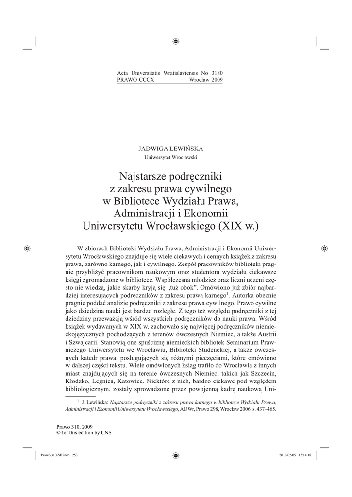 Acta Universitatis Wratislaviensis No 3180 PRAWO CCCX Wrocław 2009 JADWIGA LEWIŃSKA Uniwersytet Wrocławski Najstarsze podręczniki z zakresu prawa cywilnego w Bibliotece Wydziału Prawa, Administracji i Ekonomii Uniwersytetu Wrocławskiego (XIX w.) W zbiorach Biblioteki Wydziału Prawa, Administracji i Ekonomii Uniwersytetu Wrocławskiego znajduje się wiele ciekawych i cennych książek z zakresu prawa, zarówno karnego, jak i cywilnego. Zespół pracowników biblioteki pragnie przybliżyć pracownikom naukowym oraz studentom wydziału ciekawsze księgi zgromadzone w bibliotece. Współczesna młodzież oraz liczni uczeni często nie wiedzą, jakie skarby kryją się „tuż obok”. Omówiono już zbiór najbardziej interesujących podręczników z zakresu prawa karnego1. Autorka obecnie pragnie poddać analizie podręczniki z zakresu prawa cywilnego. Prawo cywilne jako dziedzina nauki jest bardzo rozległe. Z tego też względu podręczniki z tej dziedziny przeważają wśród wszystkich podręczników do nauki prawa. Wśród książek wydawanych w XIX w. zachowało się najwięcej podręczników niemieckojęzycznych pochodzących z terenów ówczesnych Niemiec, a także Austrii i Szwajcarii. Stanowią one spuściznę niemieckich bibliotek Seminarium Prawniczego Uniwersytetu we Wrocławiu, Biblioteki Studenckiej, a także ówczesnych katedr prawa, posługujących się różnymi pieczęciami, które omówiono w dalszej części tekstu. Wiele omówionych ksiąg trafiło do Wrocławia z innych miast znajdujących się na terenie ówczesnych Niemiec, takich jak Szczecin, Kłodzko, Legnica, Katowice. Niektóre z nich, bardzo ciekawe pod względem bibliologicznym, zostały sprowadzone przez powojenną kadrę naukową Uni1 J. Lewińska: Najstarsze podręczniki z zakresu prawa karnego w bibliotece Wydziału Prawa, Administracji i Ekonomii Uniwersytetu Wrocławskiego, AUWr, Prawo 298, Wrocław 2006, s. 437–465. Prawo 310, 2009 © for this edition by CNS Prawo-310-SH.indb 253 2010-02-05 15:14:18 254 JADWIGA LEWIŃSKA wersytetu Wrocławskiego i zaprezentowane na Wystawie Ziem Odzyskanych w 1948 r. Książki wydane w języku polskim i rosyjskim zostały przywiezione przez kadrę profesorską Uniwersytetu Jana Kazimierza we Lwowie i Uniwersytetu Stefana Batorego w Wilnie, która po zakończeniu II wojny światowej znalazła zatrudnienie we Wrocławiu. Celem pracy jest przedstawienie najciekawszych pozycji książkowych z zakresu prawa cywilnego. Przygotowanie materiału wymagało wiele czasu i wnikliwości. Obecny księgozbiór biblioteki liczy około 138,5 tys. książek oraz 51,5 tys. czasopism przedwojennych już nieukazujących się oraz bieżących. Autorkę szczególnie interesowały publikacje wydane od początku funkcjonowania Uniwersytetu do końca XIX w. Zwróciła ona uwagę na dokonujący się w miarę upływu lat wzrost liczby podręczników. Podręczniki niemieckojęzyczne I połowa XIX w. Podręczniki wydane w języku niemieckim stanowią największą grupę książek. Przed scaleniem znajdowały się w zbiorach Juristisches Seminar der Universität Breslau, o czym informuje pieczęć okrągła i owalna biblioteki KöniglichPreussisches Oberlandes Gerichts zu Paderborn, co poświadcza pieczęć podłużna, Geschichts- und Altertums-Verein für Stadt und Fürstentum Liegnitz, o czym informuje pieczęć podłużna, Magistrat Liegnitz Ratsbibliothek, co poświadcza pieczęć podłużna, Staatswissenschaftlich-Statistisches Seminar Universität Breslau, czego dowodem jest pieczęć podłużna, Bibliothek des Oberlandesgericht in Breslau, o czym informuje pieczęć owalna, Studentische Bibliothek in Breslau, czego dowodem jest pieczęć owalna, Bücherei des Finanzamts Stolz (Pommern), co poświadcza pieczęć okrągła, Bücherei des Oberfinanzpräsident Stettin, o czym informuje pieczęć okrągła. W pierwszej połowie XIX w. na terenie Niemiec prężnie działała firma wydawnicza należąca do Dietericha z Getyngi. Spod prasy drukarskiej tego wydawnictwa wyszło dzieło Grundsätze des gemeinen deutschen Privatrechts Justusa Friedricha R u n d e g o. Trzecie wydanie tego podręcznika ukazało się w 1801 r. Książka została wydana w małym formacie, lecz jest dość pokaźna objętościowo (liczy 634 strony). Zastosowano w niej stare techniki drukarskie i graficzne. Jest to najstarszy podręcznik prawniczy znajdujący się w zasobach biblioteki, obecnie przywrócono mu dawną oprawę introligatorską; tytuł podręcznika jest odręcznie napisany na grzbiecie (sygn. 586 I). Od początku XIX w. typografowie, twórcy ozdobników drukarskich, dostosowywali środki wyrazu ornamentów drukarskich do stylu tej epoki, gdyż zmuszeni byli rywalizować z techniką litograficzną. W okresie tzw. historyzPrawo 310, 2009 © for this edition by CNS Prawo-310-SH.indb 254 2010-02-05 15:14:18 Najstarsze podręczniki z zakresu prawa cywilnego 255 mu okładki książek obramowywano greckimi kolumnadami i gotyckimi budowlami2. Innym bardzo ciekawym podręcznikiem jest dzieło Civil Recht der Herzogtümer Mecklenburg Karla Alberta von K a m p t z a wydawany w Schwerin od 1805 r. przez Bodnera. Część pierwsza to Quellen und Literatur, a druga to Handbuch des Mecklenburgischen Civil-Rechts, która ukazała się w 1824 r. Książka posiada stare tłoczenia i dawniejszą oprawę introligatorską. Dedykowano ją państwu Drossen von Bülow w dowód przyjaźni (sygn. 44825 II). Jednym z najstarszych podręczników tego okresu jest Handbuch des heutigen Privatrechts nach dem System des Hern[?] Geheimenjustizrahts Runde autorstwa Wilhelma Augusta Friedricha D a n z a. Ukazał się on w wydawnictwie F.C. Loflunda ze Stuttgartu. Tom 8 (jako jedyny obecny w bibliotece) został wydany w 1807 r. Książka ta niegdyś musiała być bardzo elegancka, na okładce bowiem znajduje się odciśnięty herb złocony z ozdobną literą „U”. Dzieło ma twardą oprawę typu półskórek, ozdobny złocony grzbiet i
