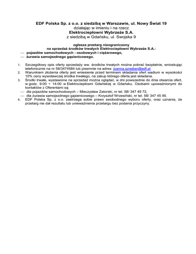 EDF Polska Sp. z o.o. z siedzibą w Warszawie, ul. Nowy Świat 19 działając w imieniu i na rzecz Elektrociepłowni WybrzeŜe S.A. z siedzibą w Gdańsku, ul. Swojska 9 ogłasza przetarg nieograniczony na sprzedaŜ środków trwałych Elektrociepłowni WybrzeŜe S.A.: pojazdów samochodowych - osobowych i cięŜarowego, Ŝurawia samojezdnego gąsienicowego. Szczegółowy opis oferty sprzedaŜy ww. środków trwałych moŜna pobrać bezpłatnie, wnioskując telefonicznie na nr 58/3474584 lub pisemnie na adres: [email protected] 2. Warunkiem złoŜenia oferty jest wniesienie przed terminem składania ofert wadium w wysokości 10% ceny wywoławczej środka trwałego, na zakup którego oferta jest składana. 3. Środki trwałe, wystawione na sprzedaŜ moŜna oglądać, w dni powszednie do dnia otwarcia ofert, w godz. 9:00 ÷ 14:00 w Elektrociepłowni Gdańskiej w Gdańsku. Osobami upowaŜnionymi do kontaktów z Oferentami są: dla pojazdów samochodowych – Mieczysław Zatorski, nr tel. 58/ 347 49 72, dla Ŝurawia samojezdnego gąsienicowego – Krzysztof Wrzesiński, nr tel. 58/ 347 45 95. 4. EDF Polska Sp. z o.o. zastrzega sobie prawo swobodnego wyboru oferty, oraz uznania, Ŝe przetarg nie dał rezultatu lub uniewaŜnienia przetargu bez podania przyczyny. 1.