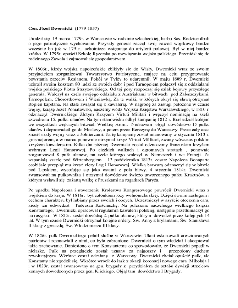 Gen. Józef Dwernicki (1779-1857) Urodził się 19 marca 1779r. w Warszawie w rodzinie szlacheckiej, herbu Sas. Rodzice dbali o jego patriotyczne wychowanie. Przyszły generał zaczął swój zawód wojskowy bardzo wcześnie bo już w 1791r., ochotniczo wstępując do artylerii polowej. Był w niej bardzo krótko. W 1795r. opuścił Szkołę Rycerska po rozwiązaniu wojska polskiego. Przeniósł się do rodzinnego Zawala i zajmował się gospodarstwem. W 1806r., kiedy wojska napoleońskie zbliżyły się do Wisły, Dwernicki wraz ze swoim przyjacielem zorganizował Towarzystwo Patriotyczne, mające na celu przygotowanie powstania przeciw Rosjanom. Pokój w Tylży to udaremnił. W maju 1809 r. Dwernicki uzbroił swoim kosztem 80 ludzi ze swoich dóbr i pod Tarnopolem połączył się z oddziałami wojska polskiego Piotra Strzyżewskiego. Od tej pory rozpoczął się szlak bojowy przyszłego generała. Walczył na czele swojego oddziału z Austriakami w bitwach pod Zaleszczykami, Tarnopolem, Chorostkowem i Wieniawką. Za te walki, w których okrył się sławą otrzymał stopień kapitana. Na stałe związał się z kawalerią. W nagrodę za zasługi położone w czasie wojny, książę Józef Poniatowski, naczelny wódz Wojska Księstwa Warszawskiego, w 1810 r. odznaczył Dwernickiego Złotym Krzyżem Virtuti Militari i wręczył nominację na szefa szwadronu 15. pułku ułanów. Na tym stanowisku odbył kampanię 1812 r. Brał udział kolejno we wszystkich większych bitwach Wielkiej Armii. Niebawem objął dowództwo 15 pułku ułanów i doprowadził go do Moskwy, a potem przez Berezynę do Warszawy. Przez cały czas znosił trudy wojny wraz z żołnierzami. Za tę kampanię został mianowany w styczniu 1813 r. grosmajorem, a w marcu ponownie otrzymał krzyż Virtuti Millitari, zwany wówczas polskim krzyżem kawalerskim. Kilka dni później Dwernicki został odznaczony francuskim krzyżem srebrnym Legii Honorowej. Po ciężkich walkach i ogromnych stratach , ponownie zorganizował 8 pułk ułanów, na czele którego walczył w Niemczech i we Francji. Za wspaniałą szarżę pod Wirtenbergiem 13 października 1813r. cesarz Napoleon Bonaparte osobiście przypiął mu krzyż złoty Legii Honorowej. Wielką brawurą odznaczył się w bitwie pod Lipskiem, wycofując się jako ostatni z pola bitwy. 4 stycznia 1814r. Dwernicki awansował na pułkownika i otrzymał dowództwo świeżo utworzonego pułku Krakusów, z którym wsławił się zażartą walkę z Prusakami na rogatkach Paryża. Po upadku Napoleona i utworzeniu Królestwa Kongresowego powrócił Dwernicki wraz z wojskiem do kraju. W 1816r. był członkiem loży wolnomularskiej. Dzięki swoim zasługom i cechom charakteru był lubiany przez swoich i obcych. Uczestniczył w asyście otoczenia cara, kiedy ten odwiedzał Tadeusza Kościuszkę. Na polecenie naczelnego wielkiego księcia Konstantego, Dwernicki opracował regulamin kawalerii polskiej, następnie przetłumaczył go na rosyjski. W 1815r. został dowódcą 2. pułku ułanów, którym dowodził przez kolejnych 14 lat. W tym czasie Dwernicki otrzymał kolejne ordery: Św. Anny z brylantami, Św. Stanisława II klasy z gwiazdą, Św. Włodzimierza III klasy. W 1826r. pułk Dwernickiego pełnił służbę w Warszawie. Ułani eskortowali aresztowanych patriotów i rozmawiali z nimi, co było zabronione. Dwernicki o tym wiedział i akceptował takie zachowanie. Doniesiono o tym Konstantemu co spowodowało, że Dwernicki popadł w niełaskę. Pułk na przeglądzie został uznany za najgorszy i przepojony duchem rewolucyjnym. Wkrótce został odesłany z Warszawy. Dwernicki chciał opuścić pułk, ale Konstanty nie zgodził się. Wkrótce wrócił do łask z okazji koronacji nowego cara Mikołaja I i w 1829r. został awansowany na gen. brygady z przydziałem do sztabu dywizji strzelców konnych dowodzonych przez gen. Klickiego. Objął tam dowództwo I Brygady. Wybuch powstania listopadowego w 1830r. zastał gen. Dwernickiego w Sieradzu, gdzie dowodził 3 Pułkiem Strzelców Konnych. Został wezwany do Warszawy, gdzie powierzono mu dowództwo nad nowymi dywizjonami, które praktycznie musiał formować od początku. Wykazał przy tym swój świetny talent organizacyjny. Do stycznia 1831r. sformował i uzbroił 18 szwadronów gotowych do walki. W końcu stycznia Rząd Narodowy zdecydował się na wysłanie na Ruś wydzielonego korpusu pod dowództwem gen. Dwernickiego, o co on sam usilnie o to zabiegał. Po tej nominacji odwiedziła Dwernickiego delegacja z Ukrainy, Podola i Wołynia, która zaproponowała utworzenie Legii Wołyńskiej pod jego dowództwem. Legia miała wejść w skład korpusu gen. Dwernickiego. Sytuacja w kraju uległa zmianie. Do królestwa wkroczyły wojska rosyjskie. W tej sytuacji Wódz Naczelny ks. Radziwiłł wysłał korpus gen. Dwernickiego przeciwko dywizji gen. Fiodora Geismara, który stacjonował w Seroczynie. Do spotkania obu wojsk doszło 14 lutego 1831r. pod Stoczkiem. Korpus gen. Dwernickiego po dwugodzinnej walce rozgromił rosyjską dywizję strzelców konnych i zdobył cztery armaty. Była to pierwsza i zarazem zwycięska bitwa w tej wojnie. Za to zwycięstwo Dwernicki został awansowany do stopnia gen. dywizji.. Nowe rozkazy dowództwa doprowadziły do kolejnej bitwy z korpusem gen. Cypriana Kreutza w rejonie Mniszewa, Ryczywoły i Nowej Wsi. Gen. Dwernicki zdobył całą artylerię rosyjską i około 40 jeńców. Poległo ponad 200 Rosjan. Dalszy szlak bitewny gen. Dwernickiego to Warka, Kozienice, Puławy, Lublin i Zamość. Wszędzie odnosił zwycięstwa. W początkach kwietnia 1831 r. gen. Dwernicki przekroczył Bug z korpusem liczącym około 7000 żołnierzy i rozpoczął marsz na Wołyń. Po drodze do korpusu gen. Dwernickiego dołączali ochotnicy, ale nie było ich wielu. Na Wołyniu miało wybuchnąć powstanie, ale do wybuchu nie doszło. Sytuacja stała się niekorzystna. Siły rosyjskie gen. Rudigera były znacznie liczniejsze. Do pi