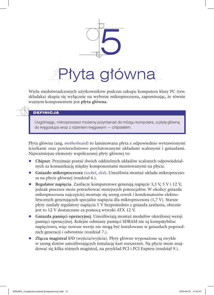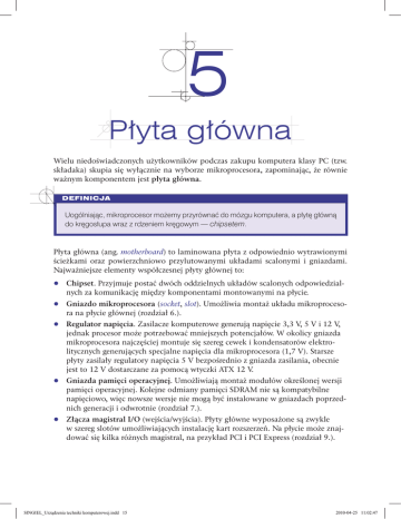 5 Płyta główna Wielu niedoświadczonych użytkowników podczas zakupu komputera klasy PC (tzw. składaka) skupia się wyłącznie na wyborze mikroprocesora, zapominając, że równie ważnym komponentem jest płyta główna. DEFINICJA Uogólniając, mikroprocesor możemy przyrównać do mózgu komputera, a płytę główną do kręgosłupa wraz z rdzeniem kręgowym — chipsetem. Płyta główna (ang. motherboard) to laminowana płyta z odpowiednio wytrawionymi ścieżkami oraz powierzchniowo przylutowanymi układami scalonymi i gniazdami. Najważniejsze elementy współczesnej płyty głównej to: qq C hipset. Przyjmuje postać dwóch oddzielnych układów scalonych odpowiedzialnych za komunikację między komponentami montowanymi na płycie. qq G niazdo mikroprocesora (socket, slot). Umożliwia montaż układu mikroprocesora na płycie głównej (rozdział 6.). qq R egulator napięcia. Zasilacze komputerowe generują napięcie 3,3 V, 5 V i 12 V, jednak procesor może potrzebować mniejszych potencjałów. W okolicy gniazda mikroprocesora najczęściej montuje się szereg cewek i kondensatorów elektrolitycznych generujących specjalne napięcia dla mikroprocesora (1,7 V). Starsze płyty zasilały regulatory napięcia 5 V bezpośrednio z gniazda zasilania, obecnie jest to 12 V dostarczane za pomocą wtyczki ATX 12 V. qq G niazda pamięci operacyjnej. Umożliwiają montaż modułów określonej wersji pamięci operacyjnej. Kolejne odmiany pamięci SDRAM nie są kompatybilne napięciowo, więc nowsze wersje nie mogą być instalowane w gniazdach poprzednich generacji i odwrotnie (rozdział 7.). qq Z łącza magistral I/O (wejścia/wyjścia). Płyty główne wyposażone są zwykle w szereg slotów umożliwiających instalację kart rozszerzeń. Na płycie może znajdować się kilka różnych magistral, na przykład PCI i PCI Express (rozdział 9.). SINGIEL_Urządzenia techniki komputerowej.indd 15 2010-04-25 11:02:47 Rozdział 5 t Płyta główna qq B IOS ROM. Układ scalony typu Flash przechowujący oprogramowanie niezbędne do działania płyty głównej. qq P orty I/O. Zestaw portów komunikacyjnych umożliwiających montaż klawiatury, myszy, drukarki, skanera, kamery internetowej itd. (rozdział 12.). qq K anały interfejsów pamięci masowych. Płyty główne umożliwiają przyłączenie napędów optycznych i twardych dysków za pomocą kanałów interfejsów ATA i SATA. Stacje dyskietek przyłączane są do dedykowanego interfejsu stacji dyskietek. qq P iny konfiguracyjne i sygnalizacyjne. Na płycie głównej mogą się znajdować specjalne piny lub mikroprzełączniki służące do konfiguracji niektórych ustawień płyty. Dodatkowy panel umożliwia podłączenie przycisków obudowy komputerowej (power, reset) i diod sygnalizacyjnych. W produkcji płyt głównych specjalizuje się kilka firm. Listę popularnych producentów zawiera tabela 5.1. Tabela 5.1. Producenci płyt głównych Producent Opis Abit/USI Tajwański producent płyt głównych w 2006 roku przejęty przez Universal Scientific Industrial (USI). Płyty Abit cenione były wśród overclockerów1. A-Open Duży tajwański producent elektroniki wytwarzający również płyty główne dla produktów Intela i AMD. ASRock Firma z Tajwanu specjalizująca się w produkcji tańszych płyt głównych obsługujących mikroprocesory Intela i AMD. ASUS Jeden z największych producentów płyt głównych dla platform Intela i AMD. Główna siedziba firmy znajduje się na Tajwanie. ECS Drugi potentat w dziedzinie produkcji płyt głównych rodem z Tajwanu. Produkty ECS przeznaczone są dla mikroprocesorów Intela i AMD. GIGABYTE Tajwańska firma specjalizująca się w produkcji osprzętu komputerowego, w tym płyt głównych dla produktów Intela i AMD. Intel Firma specjalizuje się w produkcji wysokiej klasy płyt głównych na bazie swoich chipsetów i wyłącznie dla swoich mikroprocesorów. MSI Tajwańska firma specjalizująca się w produkcji osprzętu komputerowego, w tym płyt głównych dla produktów Intela i AMD. W niniejszym rozdziale skupimy się na najpopularniejszych formatach płyt głównych, architekturze współczesnych chipsetów oraz BIOS-ie. 1 soba, która przetaktowuje częstotliwość pracy poszczególnych komponentów komputera O w celu zwiększenia jego wydajności. 16 SINGIEL_Urządzenia techniki komputerowej.indd 16 2010-04-25 11:02:47 5.1. Formaty płyt głównych 5.1. Formaty płyt głównych Podstawowym pojęciem związanym z płytami głównymi jest format płyty (ang. form factor), który jednoznacznie określa jej wielkość, rozmieszczenie poszczególnych elementów, gniazd i otworów montażowych. Od formatu płyty zależy rodzaj zastosowanej obudowy czy zasilacza. Spośród różnych formatów płyt głównych najpopularniejsze to: qq AT (przestarzały), qq ATX, qq NLX. 5.1.1. Format AT W 1984 r. firma IBM opracowała komputer pod nazwą IBM AT (ang. Advanced Technology — zaawansowana technologia) wyposażony w płytę główną określaną później mianem Full size AT. Format AT oparty został na wcześniejszym rozwiązaniu oznaczonym jako XT (1983 r.), które z kolei bazowało na płycie pierwszego mikrokomputera IBM PC (1981 r). Pod ogólną nazwą AT ukrywają się dwie odmiany formatów płyt głównych: qq F ull size AT. Płyty o wymiarach 30 cm szerokości i 34,5 cm długości, stanowiące rozwinięcie wcześniejszego standardu XT. Płyty montowane były w specjalnie przystosowanych obudowach typu Desktop (leżąca) lub Tower (stojąca), również określanych skrótem AT. qq B aby AT. W 1986 r. IBM wypuszcza komputer XT-286, w którym pierwszy raz zastosowano pomniejszoną wersję płyty Full size AT. Inni producenci zrezygnowali z nazwy XT i opracowali własny standard Baby AT (rysunek 5.1). Płytę Baby AT można zamontować w obudowach przeznaczonych dla płyt Full size AT. Dla nowych płyt opracowano również specjalne obudowy typu mini tower, w których nie można było zamo