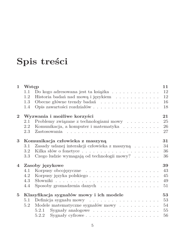Spis treści 1 Wstęp 1.1 Do kogo adresowana jest ta książka . 1.2 Historia badań nad mową i językiem 1.3 Obecne główne trendy badań . . . . 1.4 Opis zawartości rozdziałów . . . . . . . . . . 11 12 12 16 18 2 Wyzwania i możliwe korzyści 2.1 Problemy związane z technologiami mowy . . . . . . . . . 2.2 Komunikacja, a komputer i matematyka . . . . . . . . . . 2.3 Zastosowania . . . . . . . . . . . . . . . . . . . . . . . . . 21 25 26 27 . . . . . . . . . . . . . . . . . . . . . . . . . . . . . . . . . . . . . . . . . . . . 3 Komunikacja człowieka z maszyną 31 3.1 Zasady udanej interakcji człowieka z maszyną . . . . . . . 34 3.2 Kilka słów o fonetyce . . . . . . . . . . . . . . . . . . . . . 36 3.3 Czego ludzie wymagają od technologii mowy? . . . . . . . 36 4 Zasoby językowe 4.1 Korpusy obcojęzyczne . . . . 4.2 Korpusy języka polskiego . . . 4.3 Słowniki . . . . . . . . . . . . 4.4 Sposoby gromadzenia danych . . . . . . . . . . . . . . . . . . . . . . . . . . . . . . . . . . . . . . . . 39 43 45 49 51 5 Klasyfikacja sygnałów mowy i ich modele 5.1 Definicja sygnału mowy . . . . . . . . . . 5.2 Modele matematyczne sygnałów mowy . . 5.2.1 Sygnały analogowe . . . . . . . . . 5.2.2 Sygnały cyfrowe . . . . . . . . . . . . . . . . . . . . . . . . . . . . . . . . . . . . . . . . . . . . . . . 53 53 54 55 56 5 . . . . . . . . . . . . . . . . . . . . . . . . SPIS TREŚCI 6 Analiza częstotliwościowa sygnału 6.1 Widmo sygnałów okresowych . . . . . . . . . . . . . . . . 6.2 Transformacja Fouriera . . . . . . . . . . . . . . . . . . . . 6.3 Widma sygnałów mowy . . . . . . . . . . . . . . . . . . . 6.4 Własności transformacji Fouriera . . . . . . . . . . . . . . 6.4.1 Parzystość widma amplitudowego i nieparzystość widma fazowego . . . . . . . . . . . . . . . . . . . 6.4.2 Liniowość transformacji Fouriera . . . . . . . . . . 6.4.3 Zachowanie iloczynu skalarnego . . . . . . . . . . . 6.4.4 Zachowanie energii . . . . . . . . . . . . . . . . . . 6.4.5 Dualność transformacji Fouriera . . . . . . . . . . . 6.4.6 Zmiana skali czasu sygnału . . . . . . . . . . . . . 6.4.7 Przesunięcie w dziedzinie czasu . . . . . . . . . . . 6.4.8 Przesunięcie w dziedzinie częstotliwości . . . . . . . 6.4.9 Splot w dziedzinie czasu . . . . . . . . . . . . . . . 6.4.10 Różniczkowanie w dziedzinie czasu . . . . . . . . . 6.4.11 Różniczkowanie w dziedzinie częstotliwości . . . . . 6.4.12 Całkowanie w dziedzinie czasu . . . . . . . . . . . . 6.5 Przykłady transformat Fouriera . . . . . . . . . . . . . . . 6.6 Uogólnienie transformacji Fouriera . . . . . . . . . . . . . 6.6.1 Widmo impulsu Diraca . . . . . . . . . . . . . . . . 6.6.2 Transformata Fouriera sygnału stałego . . . . . . . 6.6.3 Transformaty Fouriera sygnałów okresowych . . . . 6.6.4 Transformacja sygnału z niezerową wartością średnią 6.7 Transformacja kosinusowa . . . . . . . . . . . . . . . . . . 7 Lokalna analiza widmowa mowy 7.1 Okna transformacji lokalnych . 7.1.1 Okno prostokątne . . . . 7.1.2 Okno Bartletta . . . . . 7.1.3 Okno Hanna . . . . . . . 7.1.4 Okno Hamminga . . . . 7.1.5 Okno Parzena . . . . . . 7.1.6 Okno paraboliczne . . . 7.1.7 Okno Gaussa . . . . . . 7.2 Transformacja Gabora . . . . . 6 . . . . . . . . . . . . . . . . . . . . . . . . . . . . . . . . . . . . . . . . . . . . . . . . . . . . . . . . . . . . . . . . . . . . . . . . . . . . . . . . . . . . . . . . . . . . . . . . . . . . . . . . . . . . . . . . . . . . . . . . . . . . . . . . . . . . . . . 59 60 63 64 68 68 69 70 70 71 71 72 72 73 74 75 75 76 79 80 81 82 82 83 85 89 90 91 91 92 93 95 95 102 SPIS TREŚCI 7.3 Analiza falkowa . . . . . . . . . . . . . . . . . . . . . . . . 103 7.3.1 Zastosowanie falek do reprezentacji sygnałów . . . . 110 7.3.2 Transformacja falkowa . . . . . . . . . . . . . . . . 112 8 Filtry analogowe 117 8.1 Definicje i modele matematyczne filtrów . . . . . . . . . . 117 8.2 Idealny filtr dolnoprzepustowy . . . . . . . . . . . . . . . . 122 8.3 Rzeczywiste filtry dolnoprzepustowe . . . . . . . . . . . . . 124 8.3.1 Filtr Butterwortha . . . . . . . . . . . . . . . . . . 124 8.3.2 Filtry Czebyszewa . . . . . . . . . . . . . . . . . . 126 8.3.3 Filtr eliptyczny . . . . . . . . . . . . . . . . . . . . 130 8.4 Porównanie własności filtrów rzeczywistych . . . . . . . . . 134 8.5 Przekształcenie filtrów dolnoprzepustowych w filtry innego typu . . . . . . . . . . . . . . . . . . . . . . . . . . . . . . 135 9 Przetwarzanie A/C 139 9.1 Próbkowanie sygnałów mowy . . . . . . . . . . . . . . . . 139 9.2 Aliasing . . . . . . . . . . . . . . . . . . . . . . . . . . . . 142 10 Analiza częstotliwościowa sygnałów cyfrowych 10.1 Dyskretna transformacja Fouriera sygnałów akustycznych 10.2 Szybka transformacja Fouriera . . . . . . . . . . . . . . . 10.3 Dyskretna transformacja kosinusowa . . . . . . . . . . . 145 . 145 . 152 . 158 11 Filtry cyfrowe 161 11.1 Z -transformacja . . . . . . . . . . . . . . . . . . . . . . . . 161 11.1.1 Przykłady z-transformat . . . . . . . . . . . . . . . 163 11.1.2 Własności z-transformacji . . . . . . . . . . . . . . 164 11.1.3 Związek z-transformacji z transformacją Fouriera . 167 11.2 Filtry FIR . . . . . . . . . . . . . . . . . . . . . . . . . . . 168 11.2.1 Charakterystyki częstotliwościowe filtrów FIR . . . 173 11.2.2 Filtry FIR z liniową charakterystyką fazową . . . . 174 11.2.3 Optymalizacyjna metoda projektowania filtrów FIR 179 11.3 Filtry IIR . . . . . . . . . . . . . . . . . . . . . . . . . . . 183 11.3.1 Stabilność filtrów IIR . . . . . . . . . . . . . . . . . 184 11.3.2 Projektowanie filtrów IIR w oparciu o filtry analogowe . . . . . . . . . . . . . . . . . . . . . . . . . . 194 7 SPIS TREŚCI 11.4 Banki filtrów . . . . . . . . . . . . . . . . . . . . . . . . . 196 12 Teoria falek w lokalnej analizie sygnałów 197 13 Kodowanie i kompresja mowy 203 13.1 Kompresja bezstratna . . . . . . . . . . . . . . . . . . . . . 205 13.1.1 Kodowanie różnic
