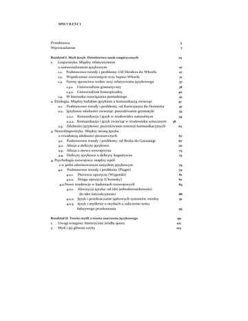 SPIS T R E Ś C I Przedmowa Wprowadzenie 5 7 Rozdział I. Myśl-Jezyk: Dziedzictwo nauk empirycznych 1. 25 Lingwistyka: Między relatywizmem a uniwersalizmem językowym 1.1. Podstawowe trendy i problemy: Od Herdera do Whorfa 1.2. Współczesne rozwinięcie tezy Sapira-Whorfa 1.3. Formy sprzeciwu wobec tezy relatywizmu językowego 27 27 31 37 Uniwersalizm gramatyczny Uniwersalizm konceptualny 1.4. W kierunku rozwiązania pośredniego 2. Etiologia. Między ludzkim językiem a komunikacją zwierząt 2.1. Podstawowe trendy i problemy: od Kartezjusza do Dennetta 2.2. Językowe zdolności zwierząt: poszukiwanie gramatyki 1.3.1. 38 1.3.2. 40 43 47 47 53 2.2.1. Komunikacja i język w środowisku naturalnym 2.2.2. Komunikacja i język zwierząt w środowisku sztucznym 2.3. Zdolności językowe: poszukiwanie intencji komunikacyjnych 54 58 62 3. Neurolingwistyka. Między utratą języka a trwałością zdolności poznawczych 3.1. Podstawowe trendy i problemy: od Broka do Gazzanigi 3.2. Afazja a deficyty językowe 3.3. Afazja a mowa wewnętrzna 3.4. Deficyty językowe a deficyty kognitywne 4. Psychologia rozwojowa: między wpół a w pełni uformowanym umysłem językowym 4.1. Podstawowe trendy i problemy (Piaget) 4.1.1. Pierwsza opozycja (Wygotski) 4.1.2. Druga opozycja (Chomsky) 4.2.Nowe tendencje w badaniach rozwojowych 4.2.1. Akwizycja języka: od idei jednokierunkowości do idei interakcyjności 4.2.2. Język i przekraczanie jądrowych systemów wiedzy 4.2.3. Język i myślenie o myślach a zaliczenie testu fałszywego przekonania Rozdział II. Teoria myśli a teoria znaczenia językowego 1. 2. Uwagi wstępne: historyczne źródła sporu Myśl i jej główne cechy 67 67 70 73 75 79 79 81 82 84 88 91 95 99 101 103 g02 3. 4. SPIS TREŚCI Podstawy kontrowersji między teorią znaczenia językowego a teorią myśli 3.1. Interpretacja w schemacie teorii znaczenia językowego 3.2. Interpretacja w schemacie teorii myśli Jedna myśl - dwa zdania 4.1. Zdanie - myśl - styl - zabarwienie 4.2. Co to znaczy, że myśl jest wewnętrznie złożona 4.3. Myśl jako wartość poznawcza i identyczność myśli 5. Ogólne wsparcie poglądu nadającego myśli niezależność od języka Credo filozoficzne 5.2. Myślenie (ujęcie myśli) a funkcje języka 5.1. 112 112 115 121 124 152 160 160 165 Rozdział III. Język a posiadanie myśli - o prymacie języka nad myślę 1. 2. 3. Uwagi wstępne: idea konceptualnego prymatu języka nad myślą Uprzywilejowana pozycja języka i język jako nośnik myśli Odrzucenie koncepcji języka jako kodu dla myśli Język jako kod: ogólna idea 3.2. Krytyka wybranych twierdzeń 3- 3- Odrzucenie metafory myśli jako samodzielnego przedmiotu przed „okiem umysłu" 4. Myśli a protomyśli 4.1. Myśli jako rodzaj treści konceptualnych 4.2. Treści konceptualne a język 4.2.1. Konsekwencje językowego związania treści konceptualnych 4-3- Protomyśl jako rodzaj treści niekonceptualnych 4.3.1. Locus protomyśli 4.3.2. Nośnik i funkcje protomyśli 5. Konsekwencje, trudności, ograniczenia 5.1. Problem wyróżnienia protomyśli 5.2. Treści konceptualne a zdolności przedjęzykowe 5- 3- Konceptualne pierwszeństwo myśli przed językiem 3.1. 173 175 180 189 190 194 201 210 211 214 220 221 222 226 239 239 248 254 Rozdział IV. Język jako środek tworzenia myśli (międzymodułowo) złożonych 269 Uwagi wstępne: idea języka w strukturze modularnej umysłu 2. Umiarkowanie rozległy modularyzm i rozumienie języka naturalnego 3. Język a przełamywanie ograniczeń myślenia przestrzennego 4. Język a myślenie matematyczne 271 1. 275 282 288 SPIS TREŚCI Od kompetencji językowej do zdolności matematycznych (N. Chomsky) 4.2. Od lingwistycznych wskaźników do pojęcia liczby (P. Bloom) 4.3. Od reprezentacji wielości do reprezentacji ilości (Gallistel i Gelman) 4.4. Język a wykształcenie się swoistych dla ludzi zdolności matematycznych 4.4.1. Przedwerbalne zdolności matematyczne 4.4.2. Locus i funkcja języka 4.4.3 Argumenty dodatkowe Konsekwencje, trudności, ograniczenia 5.1. Przeszacowanie rangi języka naturalnego - sześć uwag krytycznych 5.2. Alternatywne spojrzenie 503 4.1. 5. 5.2.1. Fenomenologia doświadczenia matematycznego a język" 5.2.2. Zasady przed językiem 5.3.Konkluzja: wewnętrzne napięcie 292 293 296 298 298 302 304 309 309 315 316 319 322 Rozdział V. Język a myślenie o myślach - poznawcza dynamika drugiego rzędu 1. 2. 3. 327 Uwagi wstępne: idea językowego związania myślenia o myślach Język a świadome myślenie propozycjonalne Dane introspekcyjne Locus i funkcja języka naturalnego Trzy podstawowe konfrontacje 3.1. Przeciw idei języka jako środka wspierającego procesy poznawcze 329 341 2.1. 343 2.2. 349 357 357 4. Przeciw idei myśli ucieleśnionych wyobrażeniowo Przeciw idei myśli ucieleśnionych w języku myśli (Mentalese) Myślenie o myślach i czytanie myśli innych umysłów 4.1. Cechy syntaktyczne i semantyczne zdań o myślach 4.2. Czytanie myśli innych podmiotów i „naiwna teoria umysłu" 4.3. Przypisywanie myśli a język naturalny 3.2. 361 3.3. 370 4.3.1. Testy fałszywego przekonania 386 387 389 390 392 4.3.2. Kognitywne warunki zaliczenia testu fałszywego przekonania Funkcje języka naturalnego 4.3.4. Zdolności komunikacyjne 4.3.3. 4.4. Wnioski: Od języka do zdolności kognitywnych 4.5. 393 396 402 404 Alternatywna charakterystyka testów fałszywego przekonania 407 4.5.1. Od teorii umysłu do języka 407 SPIS TREŚCI 504 4.5.2. Zdolności komunikacyjne jako pochodne 5. względem teorii umysłu Konsekwencje, trudności, ograniczenia 5.1. Zakres krytyki 5.2. Dane fenomenalne i ich teoretyczny opis - o świadomym ujęciu myśli 5.3. Wnioski: od myślenia o myślach do języka Zakończenie Summary Bibliografia Indeks osobowy 413 420 420 425 439 451 463 467 493