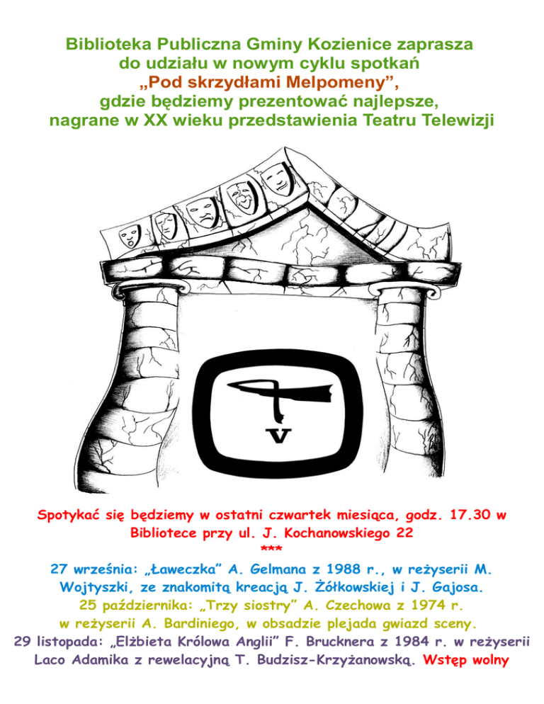 Biblioteka Publiczna Gminy Kozienice zaprasza do udziału w nowym cyklu spotkań „Pod skrzydłami Melpomeny”, gdzie będziemy prezentować najlepsze, nagrane w XX wieku przedstawienia Teatru Telewizji Spotykać się będziemy w ostatni czwartek miesiąca, godz. 17.30 w Bibliotece przy ul. J. Kochanowskiego 22 *** 27 września: „Ławeczka” A. Gelmana z 1988 r., w reżyserii M. Wojtyszki, ze znakomitą kreacją J. Żółkowskiej i J. Gajosa. 25 października: „Trzy siostry” A. Czechowa z 1974 r. w reżyserii A. Bardiniego, w obsadzie plejada gwiazd sceny. 29 listopada: „Elżbieta Królowa Anglii” F. Brucknera z 1984 r. w reżyserii Laco Adamika z rewelacyjną T. Budzisz-Krzyżanowską. Wstęp wolny