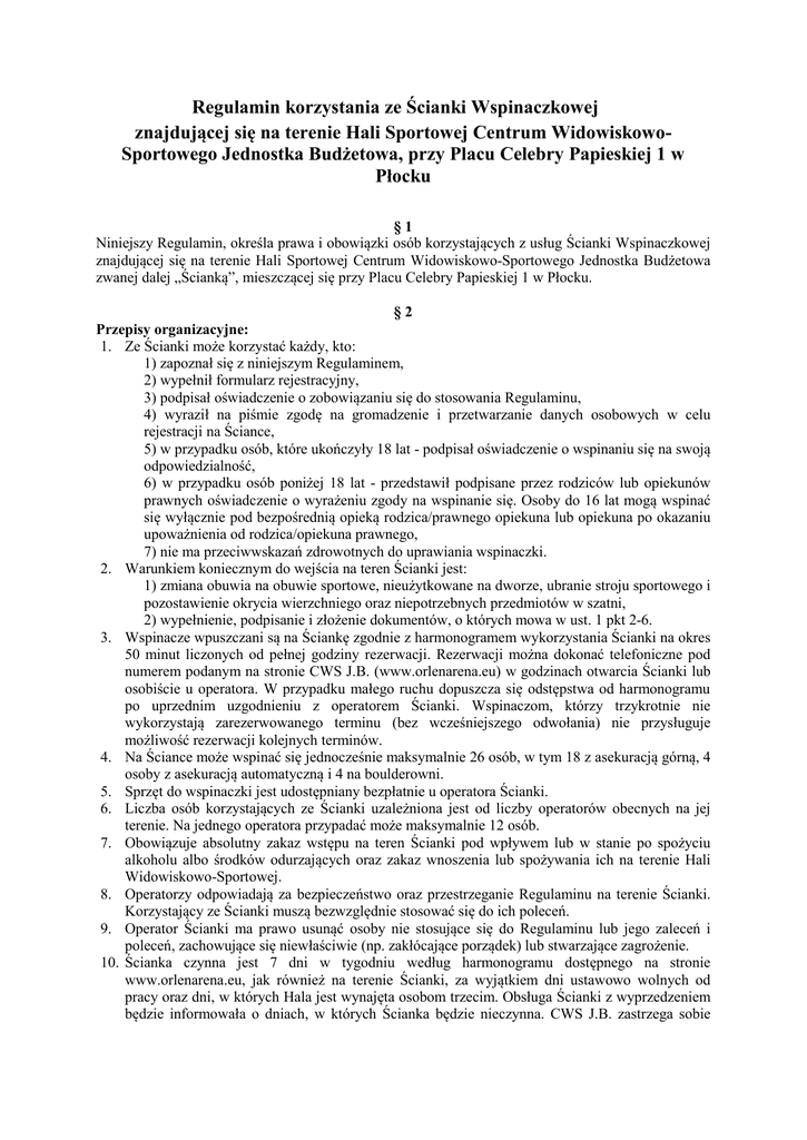 Regulamin korzystania ze Ścianki Wspinaczkowej znajdującej się na terenie Hali Sportowej Centrum WidowiskowoSportowego Jednostka Budżetowa, przy Placu Celebry Papieskiej 1 w Płocku §1 Niniejszy Regulamin, określa prawa i obowiązki osób korzystających z usług Ścianki Wspinaczkowej znajdującej się na terenie Hali Sportowej Centrum Widowiskowo-Sportowego Jednostka Budżetowa zwanej dalej „Ścianką”, mieszczącej się przy Placu Celebry Papieskiej 1 w Płocku. §2 Przepisy organizacyjne: 1. Ze Ścianki może korzystać każdy, kto: 1) zapoznał się z niniejszym Regulaminem, 2) wypełnił formularz rejestracyjny, 3) podpisał oświadczenie o zobowiązaniu się do stosowania Regulaminu, 4) wyraził na piśmie zgodę na gromadzenie i przetwarzanie danych osobowych w celu rejestracji na Ściance, 5) w przypadku osób, które ukończyły 18 lat - podpisał oświadczenie o wspinaniu się na swoją odpowiedzialność, 6) w przypadku osób poniżej 18 lat - przedstawił podpisane przez rodziców lub opiekunów prawnych oświadczenie o wyrażeniu zgody na wspinanie się. Osoby do 16 lat mogą wspinać się wyłącznie pod bezpośrednią opieką rodzica/prawnego opiekuna lub opiekuna po okazaniu upoważnienia od rodzica/opiekuna prawnego, 7) nie ma przeciwwskazań zdrowotnych do uprawiania wspinaczki. 2. Warunkiem koniecznym do wejścia na teren Ścianki jest: 1) zmiana obuwia na obuwie sportowe, nieużytkowane na dworze, ubranie stroju sportowego i pozostawienie okrycia wierzchniego oraz niepotrzebnych przedmiotów w szatni, 2) wypełnienie, podpisanie i złożenie dokumentów, o których mowa w ust. 1 pkt 2-6. 3. Wspinacze wpuszczani są na Ściankę zgodnie z harmonogramem wykorzystania Ścianki na okres 50 minut liczonych od pełnej godziny rezerwacji. Rezerwacji można dokonać telefoniczne pod numerem podanym na stronie CWS J.B. (www.orlenarena.eu) w godzinach otwarcia Ścianki lub osobiście u operatora. W przypadku małego ruchu dopuszcza się odstępstwa od harmonogramu po uprzednim uzgodnieniu z operatorem Ścianki. Wspinaczom, którzy trzykrotnie nie wykorzystają zarezerwowanego terminu (bez wcześniejszego odwołania) nie przysługuje możliwość rezerwacji kolejnych terminów. 4. Na Ściance może wspinać się jednocześnie maksymalnie 26 osób, w tym 18 z asekuracją górną, 4 osoby z asekuracją automatyczną i 4 na boulderowni. 5. Sprzęt do wspinaczki jest udostępniany bezpłatnie u operatora Ścianki. 6. Liczba osób korzystających ze Ścianki uzależniona jest od liczby operatorów obecnych na jej terenie. Na jednego operatora przypadać może maksymalnie 12 osób. 7. Obowiązuje absolutny zakaz wstępu na teren Ścianki pod wpływem lub w stanie po spożyciu alkoholu albo środków odurzających oraz zakaz wnoszenia lub spożywania ich na terenie Hali Widowiskowo-Sportowej. 8. Operatorzy odpowiadają za bezpieczeństwo oraz przestrzeganie Regulaminu na terenie Ścianki. Korzystający ze Ścianki muszą bezwzględnie stosować się do ich poleceń. 9. Operator Ścianki ma prawo usunąć osoby nie stosujące się do Regulaminu lub jego zaleceń i poleceń, zachowujące się niewłaściwie (np. zakłócające porządek) lub stwarzające zagrożenie. 10. Ścianka czynna jest 7 dni w tygodniu według harmonogramu dostępnego na stronie www.orlenarena.eu, jak również na terenie Ścianki, za wyjątkiem dni ustawowo wolnych od pracy oraz dni, w których Hala jest wynajęta osobom trzecim. Obsługa Ścianki z wyprzedzeniem będzie informowała o dniach, w których Ścianka będzie nieczynna. CWS J.B. zastrzega sobie prawo do zawieszenia działania Ścianki w terminach wynikających z przyczyn technicznych lub innych istotnych okoliczności o czym będzie informować użytkowników z wyprzedzeniem. 11. Poza godzinami otwarcia Ścianki istnieje możliwość bezpłatnego użyczenia Ścianki na podstawie umowy użyczenia według wzoru obowiązującego w CWS J.B. 12. CWS J.B. zastrzega sobie prawo do odmowy użyczenia Ścianki bez podania przyczyny. 13. Dostępność uprzęży, karabinków, kubków jest ograniczona. 1. 2. 3. 4. 5. 6. 7. 8. 9. §3 Przepisy prawne: Osoby początkujące, które nie znają zasad asekuracji i posługiwania się sprzętem wspinaczkowym mają obowiązek zgłosić się do operatora Ścianki. Osoby takie mogą być asekurowane tylko przez operatora lub przez osobę doświadczoną, wskazaną przez operatora. Wspinaczka takich osób powinna mieć charakter nauki wspinania. Osoby doświadczone, powyżej 18 lat i znające zasady asekuracji, mogą samodzielnie korzystać z części Ścianki z autoasekuracją. Osoby, które nie znają zasad asekuracji automatycznej oraz osoby niepełnoletnie powinny być wpinane do automatu tylko z pomocą obsługi Ścianki lub osób wskazanych przez operatora Ścianki. Operator Ścianki ma prawo i obowiązek sprawdzić umiejętności każdej osoby chcącej samodzielnie wspinać się i asekurować. Za bezpieczeństwo na Ściance odpowiada operator Ścianki. Każdy użytkownik jest zobowiązany do powiadomienia operatora Ścianki o sytuacjach mogących stanowić zagrożenie dla życia lub zdrowia użytkowników Ścianki lub osób postronnych, a także o uszkodzonych lub obluzowanych chwytach wspinaczkowych oraz wszelkich nieprawidłowościach w funkcjonowaniu obiektu. CWS J.B. jako administrator Ścianki nie ponosi odpowiedzialności za kontuzje, urazy i uszczerbki na zdrowiu wspinaczy, spowodowane niewłaściwym użytkowaniem urządzeń i uczestnictwem w zajęciach, a także nieprzestrzeganiem Regulaminów i zaleceń obsługi. CWS J.B. nie ponosi odpowiedzialności za przedmioty pozostawione w szatni oraz na terenie obiektu. Pozostawione przedmioty będą utylizowane po okresie 14 dni od czasu ich pozostawienia. Aktualnie obowiązujący Regulamin znajduje się przy wejściu do Ścianki, u operatorów oraz na stronie internetowej (www.orlenarena.eu). CWS J.B. zastrzega sobie prawo do zmiany niniejszego Regulaminu. Os