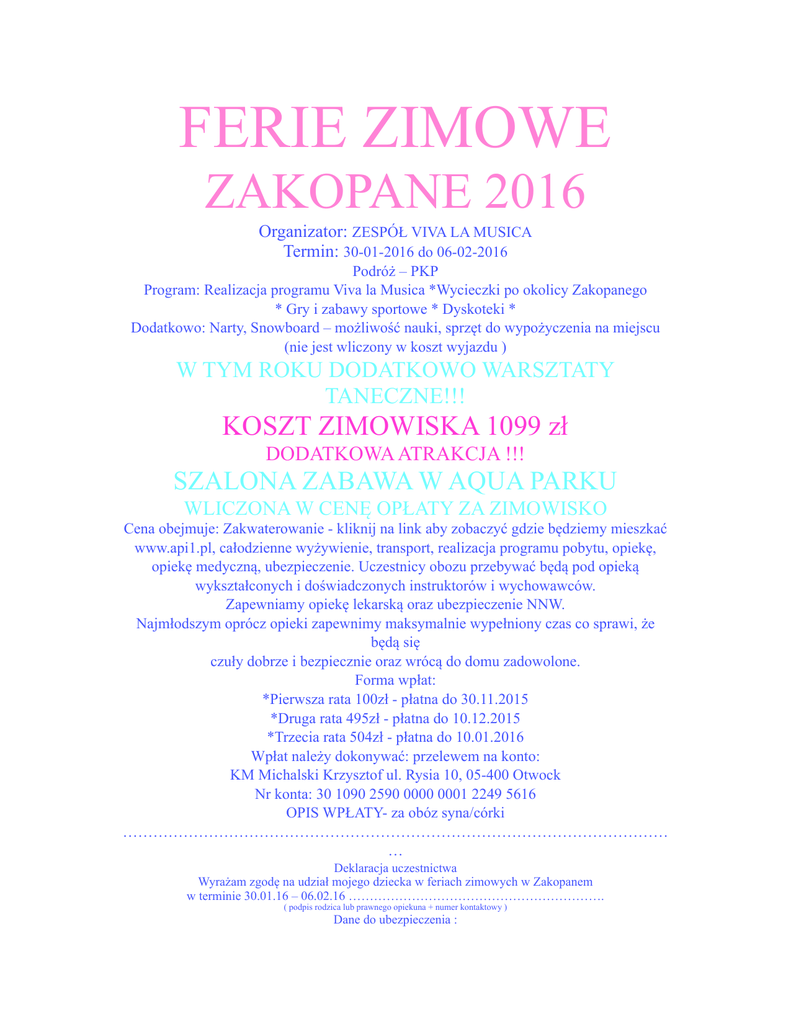 FERIE ZIMOWE ZAKOPANE 2016 Organizator: ZESPÓŁ VIVA LA MUSICA Termin: 30-01-2016 do 06-02-2016 Podróż – PKP Program: Realizacja programu Viva la Musica *Wycieczki po okolicy Zakopanego * Gry i zabawy sportowe * Dyskoteki * Dodatkowo: Narty, Snowboard – możliwość nauki, sprzęt do wypożyczenia na miejscu (nie jest wliczony w koszt wyjazdu ) W TYM ROKU DODATKOWO WARSZTATY TANECZNE!!! KOSZT ZIMOWISKA 1099 zł DODATKOWA ATRAKCJA !!! SZALONA ZABAWA W AQUA PARKU WLICZONA W CENĘ OPŁATY ZA ZIMOWISKO Cena obejmuje: Zakwaterowanie - kliknij na link aby zobaczyć gdzie będziemy mieszkać www.api1.pl, całodzienne wyżywienie, transport, realizacja programu pobytu, opiekę, opiekę medyczną, ubezpieczenie. Uczestnicy obozu przebywać będą pod opieką wykształconych i doświadczonych instruktorów i wychowawców. Zapewniamy opiekę lekarską oraz ubezpieczenie NNW. Najmłodszym oprócz opieki zapewnimy maksymalnie wypełniony czas co sprawi, że będą się czuły dobrze i bezpiecznie oraz wrócą do domu zadowolone. Forma wpłat: *Pierwsza rata 100zł - płatna do 30.11.2015 *Druga rata 495zł - płatna do 10.12.2015 *Trzecia rata 504zł - płatna do 10.01.2016 Wpłat należy dokonywać: przelewem na konto: KM Michalski Krzysztof ul. Rysia 10, 05-400 Otwock Nr konta: 30 1090 2590 0000 0001 2249 5616 OPIS WPŁATY- za obóz syna/córki ……………………………………………………………………………………………… … Deklaracja uczestnictwa Wyrażam zgodę na udział mojego dziecka w feriach zimowych w Zakopanem w terminie 30.01.16 – 06.02.16 ……………………………………………………. ( podpis rodzica lub prawnego opiekuna + numer kontaktowy ) Dane do ubezpieczenia : Imię i Nazwisko ………………………………………………………………………………….. Miejsce zameldowania…..……………………………………………………………………. Data urodzenia …..……………………………………………………………………………….. Pesel…………………………………………...