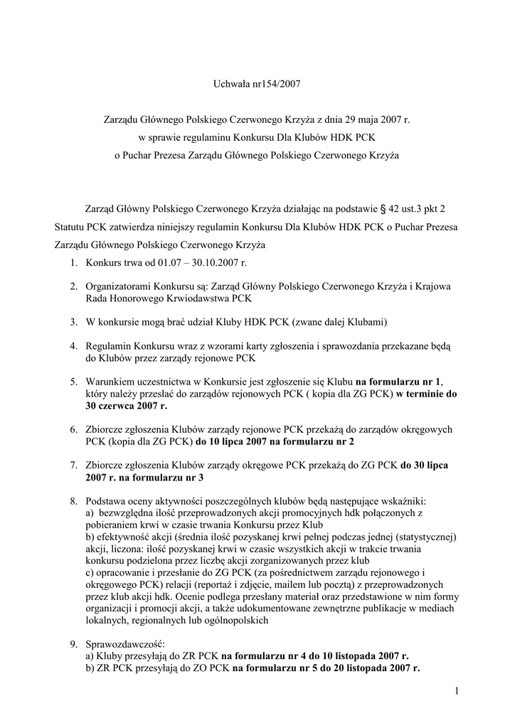 Uchwała nr154/2007 Zarządu Głównego Polskiego Czerwonego KrzyŜa z dnia 29 maja 2007 r. w sprawie regulaminu Konkursu Dla Klubów HDK PCK o Puchar Prezesa Zarządu Głównego Polskiego Czerwonego KrzyŜa Zarząd Główny Polskiego Czerwonego KrzyŜa działając na podstawie § 42 ust.3 pkt 2 Statutu PCK zatwierdza niniejszy regulamin Konkursu Dla Klubów HDK PCK o Puchar Prezesa Zarządu Głównego Polskiego Czerwonego KrzyŜa 1. Konkurs trwa od 01.07 – 30.10.2007 r. 2. Organizatorami Konkursu są: Zarząd Główny Polskiego Czerwonego KrzyŜa i Krajowa Rada Honorowego Krwiodawstwa PCK 3. W konkursie mogą brać udział Kluby HDK PCK (zwane dalej Klubami) 4. Regulamin Konkursu wraz z wzorami karty zgłoszenia i sprawozdania przekazane będą do Klubów przez zarządy rejonowe PCK 5. Warunkiem uczestnictwa w Konkursie jest zgłoszenie się Klubu na formularzu nr 1, który naleŜy przesłać do zarządów rejonowych PCK ( kopia dla ZG PCK) w terminie do 30 czerwca 2007 r. 6. Zbiorcze zgłoszenia Klubów zarządy rejonowe PCK przekaŜą do zarządów okręgowych PCK (kopia dla ZG PCK) do 10 lipca 2007 na formularzu nr 2 7. Zbiorcze zgłoszenia Klubów zarządy okręgowe PCK przekaŜą do ZG PCK do 30 lipca 2007 r. na formularzu nr 3 8. Podstawa oceny aktywności poszczególnych klubów będą następujące wskaźniki: a) bezwzględna ilość przeprowadzonych akcji promocyjnych hdk połączonych z pobieraniem krwi w czasie trwania Konkursu przez Klub b) efektywność akcji (średnia ilość pozyskanej krwi pełnej podczas jednej (statystycznej) akcji, liczona: ilość pozyskanej krwi w czasie wszystkich akcji w trakcie trwania konkursu podzielona przez liczbę akcji zorganizowanych przez klub c) opracowanie i przesłanie do ZG PCK (za pośrednictwem zarządu rejonowego i okręgowego PCK) relacji (reportaŜ i zdjęcie, mailem lub pocztą) z przeprowadzonych przez klub akcji hdk. Ocenie podlega przesłany materiał oraz przedstawione w nim formy organizacji i promocji akcji, a takŜe udokumentowane zewnętrzne publikacje w mediach lokalnych, regionalnych lub ogólnopolskich 9. Sprawozdawczość: a) Kluby przesyłają do ZR PCK na formularzu nr 4 do 10 listopada 2007 r. b) ZR PCK przesyłają do ZO PCK na formularzu nr 5 do 20 listopada 2007 r. 1 c) ZO PCK przesyłają do ZG PCK na formularzu nr 6 do 5 grudnia 2007 r. 10. Komisje w zarządach okręgowych, składające się z przedstawicieli PCK, RR HDK PCK i OR HDK PCK dokonają oceny działań klubów wg powyŜszych wskaźników, wyłonią i nagradza na szczeblu okręgowym po 2 najlepsze kluby: a) „Najlepszy Klub w….… okręgu PCK” b) „Najlepsza Promocja hdk” dla klubu wyróŜniającego się w swoich działaniach najciekawszą formą promocyjną, która równieŜ przyniosła najlepsze efekty w postaci liczby krwiodawców 11. Komisja w ZG PCK składająca się z przedstawicieli Polskiego Czerwonego KrzyŜa i Krajowej Rady HDK PCK wyłoni 2 najlepsze kluby do nagród: a) Puchar Prezesa Zarządu Głównego PCK (moŜliwa nagroda rzeczowa dla klubu) b) „Najlepsza Promocja hdk” i ogłosi wyniki drogą elektroniczną oraz opublikuje na swojej stronie internetowej do dnia 10 grudnia 2007 r.(pod warunkiem terminowego otrzymania sprawozdań z ZO PCK) 12. Komisje na poszczególnych szczeblach posiadają pełną niezaleŜność i ewentualne odwołania naleŜy składać do komisji, która wydała werdykt 13. Nagrody dla zwycięskich klubów szczebla centralnego zostaną wręczone na uroczystości w ZG PCK, której termin zostanie podany zarządom okręgowym PCK droga elektroniczną i opublikowany na głównej stronie internetowej PCK. 14. REGULAMIN niniejszy wchodzi w Ŝycie z dniem powzięcia. Podpisy na oryginale: /-/ Jarosław Pinkas Prezes Zarządu Głównego Polskiego Czerwonego KrzyŜa /-/ ElŜbieta Mikos-Skuza Wiceprezes Zarządu Głównego Polskiego Czerwonego KrzyŜa 2