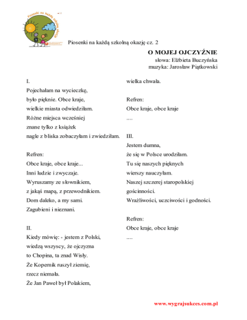 Piosenki na każdą szkolną okazję cz. 2 O MOJEJ OJCZYŹNIE słowa: Elżbieta Buczyńska muzyka: Jarosław Piątkowski I. wielka chwała. Pojechałam na wycieczkę, było pięknie. Obce kraje, Refren: wielkie miasta odwiedziłam. Obce kraje, obce kraje Różne miejsca wcześniej .... znane tylko z książek nagle z bliska zobaczyłam i zwiedziłam. III. Jestem dumna, Refren: że się w Polsce urodziłam. Obce kraje, obce kraje... Tu się naszych pięknych Inni ludzie i zwyczaje. wierszy nauczyłam. Wyruszamy ze słownikiem, Naszej szczerej staropolskiej z jakąś mapą, z przewodnikiem. gościnności. Dom daleko, a my sami. Wrażliwości, uczciwości i godności. Zagubieni i nieznani. Refren: II. Obce kraje, obce kraje Kiedy mówię: - jestem z Polski, .... wiedzą wszyscy, że ojczyzna to Chopina, ta znad Wisły. Że Kopernik ruszył ziemię, rzecz niemała. Że Jan Paweł był Polakiem, www.wygrajsukces.com.pl