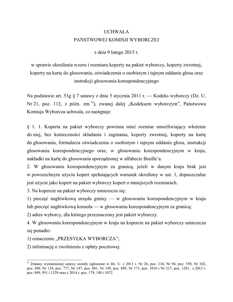 UCHWAŁA PAŃSTWOWEJ KOMISJI WYBORCZEJ z dnia 9 lutego 2015 r. w sprawie określenia wzoru i rozmiaru koperty na pakiet wyborczy, koperty zwrotnej, koperty na kartę do głosowania, oświadczenia o osobistym i tajnym oddaniu głosu oraz instrukcji głosowania korespondencyjnego Na podstawie art. 53g § 7 ustawy z dnia 5 stycznia 2011 r. — Kodeks wyborczy (Dz. U. Nr 21, poz. 112, z późn. zm. 1)), zwanej dalej „Kodeksem wyborczym”, Państwowa Komisja Wyborcza uchwala, co następuje: § 1. 1. Koperta na pakiet wyborczy powinna mieć rozmiar umożliwiający włożenie do niej, bez konieczności składania i zaginania, koperty zwrotnej, koperty na kartę do głosowania, formularza oświadczenia o osobistym i tajnym oddaniu głosu, instrukcji głosowania korespondencyjnego oraz, w głosowaniu korespondencyjnym w kraju, nakładki na kartę do głosowania sporządzonej w alfabecie Braille’a. 2. W głosowaniu korespondencyjnym za granicą, jeżeli w danym kraju brak jest w powszechnym użyciu kopert spełniających warunek określony w ust. 1, dopuszczalne jest użycie jako kopert na pakiet wyborczy kopert o mniejszych rozmiarach. 3. Na kopercie na pakiet wyborczy umieszcza się: 1) pieczęć nagłówkową urzędu gminy — w głosowaniu korespondencyjnym w kraju lub pieczęć nagłówkową konsula — w głosowaniu korespondencyjnym za granicą; 2) adres wyborcy, dla którego przeznaczony jest pakiet wyborczy. 4. W głosowaniu korespondencyjnym w kraju na kopercie na pakiet wyborczy umieszcza się ponadto: 1) oznaczenie „PRZESYŁKA WYBORCZA”; 2) informację o zwolnieniu z opłaty pocztowej. Zmiany wymienionej ustawy zostały ogłoszone w Dz. U. z 2011 r. Nr 26, poz. 134, Nr 94, poz. 550, Nr 102, poz. 588, Nr 134, poz. 777, Nr 147, poz. 881, Nr 149, poz. 889, Nr 171, poz. 1016 i Nr 217, poz. 1281, z 2012 r. poz. 849, 951 i 1529 oraz z 2014 r. poz. 179, 180 i 1072. 1) 2 5. Na kopercie na pakiet wyborczy nie umieszcza się żadnych innych oznaczeń poza wymienionymi w ust. 3 i 4. Nie dotyczy to pieczęci i adnotacji operatora przyjmującego i doręczającego przesyłkę, a w przypadku głosowania korespondencyjnego za granicą — także znaków opłaty pocztowej. 6. W przypadku doręczania do wyborcy pakietu wyborczego przez upoważnionego pracownika urzędu gminy oraz w przypadku gdy wyborca zadeklarował osobisty odbiór pakietu wyborczego, na kopercie na pakiet wyborczy nie jest konieczne umieszczenie informacji o zwolnieniu z opłaty pocztowej. 7. Koperty na pakiet wyborczy przekazywane przez dany urząd gminy oraz przez danego konsula wyborcom głosującym korespondencyjnie nie mogą różnić się między sobą. 8. Wzór koperty na pakiet wyborczy stanowi załącznik nr 1 do uchwały. § 2. 1. Koperta zwrotna powinna mieć rozmiar umożliwiający włożenie do niej, bez konieczności składania i zaginania, koperty na kartę do głosowania oraz oświadczenia o osobistym i tajnym oddaniu głosu. 2. Na kopercie zwrotnej umieszcza się: 1) adres obwodowej komisji wyborczej, dla której przeznaczona jest przesyłka — w głosowaniu korespondencyjnym w kraj; 2) adres konsula i informację, dla której obwodowej komisji wyborczej przesyłka jest przeznaczona — w głosowaniu korespondencyjnym za granicą. 3. Do kopert zwrotnych § 1 ust. 2, 4, 5 i 7 stosuje się odpowiednio. 4. Wzór koperty zwrotnej stanowi załącznik nr 2 do uchwały. § 3. 1. Koperta na kartę do głosowania ma, w zależności od przeprowadzanych wyborów oraz liczby i formatu stosowanych w nich kart do głosowania, rozmiar umożliwiający włożenie do niej, bez konieczności zaginania, kart do głosowania. 2. Koperta na kartę do głosowania wykonywana jest w sposób uniemożliwiający, bez jej otwarcia, odczytanie treści znajdującej się wewnątrz karty do głosowania. 3. Koperta na kartę do głosowania, w miarę możliwości, powinna być koloru białego. 4. W głosowaniu korespondencyjnym za granicą, jeżeli w danym kraju koperty koloru białego nie są w powszechnym użyciu, dopuszczalne jest użycie kopert na kartę do głosowania innego koloru. 3 5. Na kopercie na kartę do głosowania umieszcza się oznaczenie „Koperta na kartę do głosowania”. Rodzaj i wielkość czcionki dla oznaczenia, o którym mowa w zdaniu pierwszym, musi być jednakowa dla wszystkich kopert sporządzanych przez dany urząd gminy oraz przez danego konsula. Na kopercie na kartę do głosowania nie umieszcza się żadnych innych oznaczeń. 6. Do kopert zwrotnych § 1 ust. 2 i 7 stosuje się odpowiednio. 7. Wzór koperty na kartę do głosowania stanowi załącznik nr 3 do uchwały. § 4. 1. Oświadczenie o osobistym i tajnym oddaniu głosu sporządza się na karcie koloru białego, formatu A-5. 2. W głosowaniu korespondencyjnym za granicą oświadczenie o osobistym i tajnym oddaniu głosu może być sporządzone na karcie o formacie zbliżonym do formatu A-5, powszechnie stosowanym w druku w danym kraju. 3. Urząd gminy oraz konsul przygotowuje formularz oświadczenia, na którym umieszcza imię (imiona), nazwisko i numer ewidencyjny PESEL wyborcy (w odniesieniu do obywateli Unii Europejskiej niebędących obywatelami polskimi — numer paszportu lub innego dokumentu stwierdzającego tożsamość) oraz nazwę i datę przeprowadzanych wyborów, a także miejsce na wpisanie nazwy miejscowości, w której wyborca sporządza oświadczenie i daty jego sporządzenia oraz miejsce na własnoręczny podpis wyborcy. 4. Wzór oświadczenia o osobistym i tajnym oddaniu głosu stanowi załącznik nr 4 do uchwały. § 5. 1. Instrukcję głosowania korespondencyjnego sporządza się na karcie formatu A-4, czcionką o rozmiarze nie mniejszym niż 14 pkt. 2. W głosowaniu korespondencyjnym za granicą instrukcja głosowania korespondencyjnego może być sporządzona na karcie o formacie zbliżonym do formatu A-4, powszechnie stosowanym w druku w danym kraju. 3. W głosowaniu korespondencyjnym w kraju w przypadku gdy pakiet wyborczy przesy