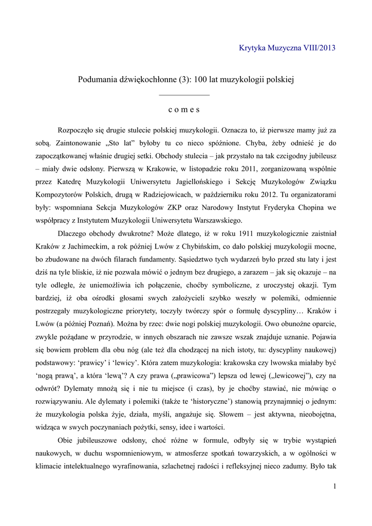 Krytyka Muzyczna VIII/2013 Podumania dźwiękochłonne (3): 100 lat muzykologii polskiej comes Rozpoczęło się drugie stulecie polskiej muzykologii. Oznacza to, iż pierwsze mamy już za sobą. Zaintonowanie „Sto lat” byłoby tu co nieco spóźnione. Chyba, żeby odnieść je do zapoczątkowanej właśnie drugiej setki. Obchody stulecia – jak przystało na tak czcigodny jubileusz – miały dwie odsłony. Pierwszą w Krakowie, w listopadzie roku 2011, zorganizowaną wspólnie przez Katedrę Muzykologii Uniwersytetu Jagiellońskiego i Sekcję Muzykologów Związku Kompozytorów Polskich, drugą w Radziejowicach, w październiku roku 2012. Tu organizatorami były: wspomniana Sekcja Muzykologów ZKP oraz Narodowy Instytut Fryderyka Chopina we współpracy z Instytutem Muzykologii Uniwersytetu Warszawskiego. Dlaczego obchody dwukrotne? Może dlatego, iż w roku 1911 muzykologicznie zaistniał Kraków z Jachimeckim, a rok później Lwów z Chybińskim, co dało polskiej muzykologii mocne, bo zbudowane na dwóch filarach fundamenty. Sąsiedztwo tych wydarzeń było przed stu laty i jest dziś na tyle bliskie, iż nie pozwala mówić o jednym bez drugiego, a zarazem – jak się okazuje – na tyle odległe, że uniemożliwia ich połączenie, choćby symboliczne, z uroczystej okazji. Tym bardziej, iż oba ośrodki głosami swych założycieli szybko weszły w polemiki, odmiennie postrzegały muzykologiczne priorytety, toczyły twórczy spór o formułę dyscypliny… Kraków i Lwów (a później Poznań). Można by rzec: dwie nogi polskiej muzykologii. Owo obunożne oparcie, zwykle pożądane w przyrodzie, w innych obszarach nie zawsze wszak znajduje uznanie. Pojawia się bowiem problem dla obu nóg (ale też dla chodzącej na nich istoty, tu: dyscypliny naukowej) podstawowy: ‘prawicy’ i ‘lewicy’. Która zatem muzykologia: krakowska czy lwowska miałaby być ‘nogą prawą’, a która ‘lewą’? A czy prawa („prawicowa”) lepsza od lewej („lewicowej”), czy na odwrót? Dylematy mnożą się i nie tu miejsce (i czas), by je choćby stawiać, nie mówiąc o rozwiązywaniu. Ale dylematy i polemiki (także te ‘historyczne’) stanowią przynajmniej o jednym: że muzykologia polska żyje, działa, myśli, angażuje się. Słowem – jest aktywna, nieobojętna, widząca w swych poczynaniach pożytki, sensy, idee i wartości. Obie jubileuszowe odsłony, choć różne w formule, odbyły się w trybie wystąpień naukowych, w duchu wspomnieniowym, w atmosferze spotkań towarzyskich, a w ogólności w klimacie intelektualnego wyrafinowania, szlachetnej radości i refleksyjnej nieco zadumy. Było tak 1 Krytyka Muzyczna VIII/2013 zarówno w obecnej siedzibie muzykologii krakowskiej, w Pałacu Pusłowskich (wspaniałe piwnice – kto był, ten wie, o czym mowa!), jak i w urokliwej scenerii pałacu i parku w Radziejowicach. Szkoda, że ‘stulecia’ przypadają tak rzadko, że tylko raz w życiu udaje się być ich świadkiem (a i to nie wszystkim, zatem obecni na jubileuszu mogą czuć się swoiście wyróżnieni). Jaki temat, motyw czy zagadnienie podjąć w tak uroczystej i dziejowej chwili, na granicy dwóch stuleci, nie chcąc brązowić, a mając do dyspozycji formułę tekstu z gatunku lżejszych, ale też nie całkiem błahych? To trochę zadanie w rodzaju: podjąć – nie podejmując, komentować – nie komentując itp. Stulecie polskiej muzykologii – choć przez pojedynczych muzykologów niedoświadczone przecież w całej swej czasowej przestrzeni – jako świadectwo upływającego czasu w sposób naturalny kieruje ku przeszłości, przywołuje momenty znacznie krótszych, ale mierzonych już wszak kilkoma dziesięcioleciami, indywidualnych „muzykologicznych życiorysów”. Wiele tu zapamiętanych sytuacji, wiele wątków i refleksji… Także tych, które – mimo pozorów anegdotyczności – tyczą spraw podstawowych. Na przykład kwestii współczesnej tożsamości muzykologii. Rzecz to ważna i poważna, która w kontekście jubileuszu pewnie nie raz pojawi się w muzykologicznych publikacjach i debatach. A zindywidualizowana, może znaleźć się też na gruncie felietonowym. Pamiętam egzaminy wstępne na muzykologię. Obok będącej na tym samym wydziale historii – resztę dyscyplin (archeologię, historię sztuki, etnologię i muzykologię) określano jako ‘małe kierunki’. Istotnie, nawet wzięte razem stanowiły one niewielką jedynie część Wydziału Historycznego. Mały kierunek, ale jakże wielki duchem – należałoby pomyśleć, ale – przyznaję – myśl taka wtedy się nie pojawiła. Pojawiła się zaś inna, nieco pokrewna: owa ‘małość’ wydała mi się wówczas nawet szlachetna, wręcz granicząca z dobrze pojętą elitarnością, wyjątkowością – zarazem szansą na specjalistyczne, ciekawe studia, poznanie naukowych indywidualności (co istotnie miało miejsce!). Szybko okazało się, iż ta tak cenna dla mnie jakość „małego kierunku”, a właściwie jego specyfika, ma drobną skazę: nie pozwala się w prostym przekazie wyjaśnić klasowym koleżankom i kolegom pytającym, na jakich jesteś studiach. Oni byli na medycynie, na politechnice, filologii polskiej, archeologii – i to było czytelne. Na pytania kolegów początkowo odpowiadałem zatem po prostu: studiuję muzykologię. To na czym grasz? – padało niezmiennie pytanie (wiedzieli, że chodziłem do szkoły muzycznej, więc logiczna była kontynuacja tej ścieżki). Gram, ale nie o to tu chodzi. Więc o co? To taka wiedza o muzyce, historia muzyki – próbowałem nieporadnie opisać, co studiuję w oparciu o intuicję początkującego studenta, mając zarazem pełną świadomość, że nie do 2 Krytyka Muzyczna VIII/2013 końca, a nawet nie przede wszystkim o tę historię muzyki tu idzie. Ostatecznie, żeby nie wypaść całkiem blado (i – przyznaję – pokonany na ‘muzykologicznych szańcach’), mówiłem – zgodnie z prawdą, że gram i owsz