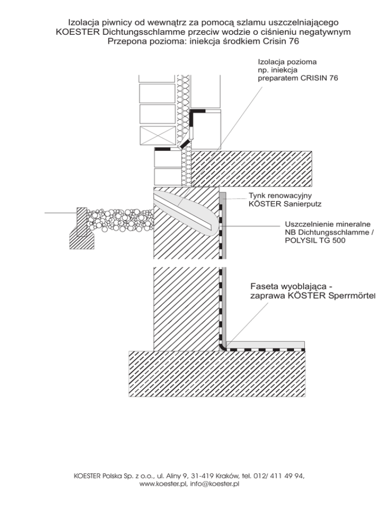 Izolacja piwnicy od wewn¹trz za pomoc¹ szlamu uszczelniaj¹cego KOESTER Dichtungsschlamme przeciw wodzie o ciœnieniu negatywnym Przepona pozioma: iniekcja œrodkiem Crisin 76 Izolacja pozioma np. iniekcja preparatem CRISIN 76 Tynk renowacyjny KÖSTER Sanierputz Uszczelnienie mineralne NB Dichtungsschlamme / POLYSIL TG 500 Faseta wyoblaj¹ca zaprawa KÖSTER Sperrmörtel KOESTER Polska Sp. z o.o., ul. Aliny 9, 31-419 Kraków, tel. 012/ 411 49 94, www.koester.pl, [email protected]