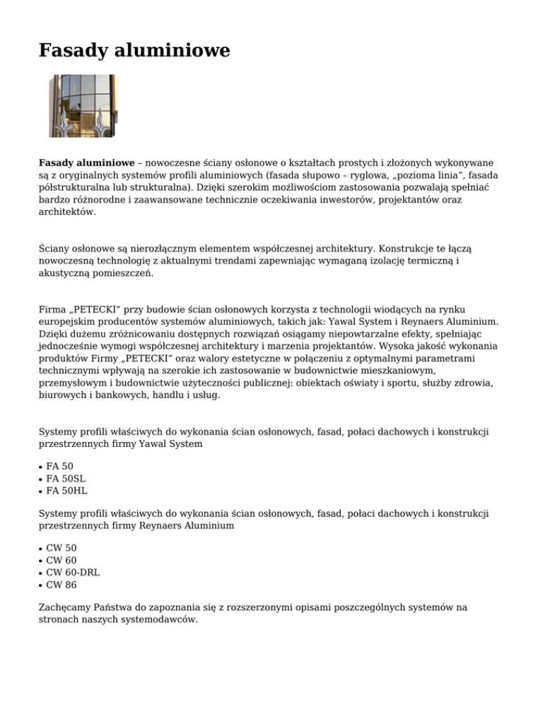 Fasady aluminiowe Fasady aluminiowe – nowoczesne ściany osłonowe o kształtach prostych i złożonych wykonywane są z oryginalnych systemów profili aluminiowych (fasada słupowo – ryglowa, „pozioma linia”, fasada półstrukturalna lub strukturalna). Dzięki szerokim możliwościom zastosowania pozwalają spełniać bardzo różnorodne i zaawansowane technicznie oczekiwania inwestorów, projektantów oraz architektów. Ściany osłonowe są nierozłącznym elementem współczesnej architektury. Konstrukcje te łączą nowoczesną technologię z aktualnymi trendami zapewniając wymaganą izolację termiczną i akustyczną pomieszczeń. Firma „PETECKI” przy budowie ścian osłonowych korzysta z technologii wiodących na rynku europejskim producentów systemów aluminiowych, takich jak: Yawal System i Reynaers Aluminium. Dzięki dużemu zróżnicowaniu dostępnych rozwiązań osiągamy niepowtarzalne efekty, spełniając jednocześnie wymogi współczesnej architektury i marzenia projektantów. Wysoka jakość wykonania produktów Firmy „PETECKI” oraz walory estetyczne w połączeniu z optymalnymi parametrami technicznymi wpływają na szerokie ich zastosowanie w budownictwie mieszkaniowym, przemysłowym i budownictwie użyteczności publicznej: obiektach oświaty i sportu, służby zdrowia, biurowych i bankowych, handlu i usług. Systemy profili właściwych do wykonania ścian osłonowych, fasad, połaci dachowych i konstrukcji przestrzennych firmy Yawal System ● ● ● FA 50 FA 50SL FA 50HL Systemy profili właściwych do wykonania ścian osłonowych, fasad, połaci dachowych i konstrukcji przestrzennych firmy Reynaers Aluminium ● ● ● ● CW 50 CW 60 CW 60-DRL CW 86 Zachęcamy Państwa do zapoznania się z rozszerzonymi opisami poszczególnych systemów na stronach naszych systemodawców. KONTAKT Petecki