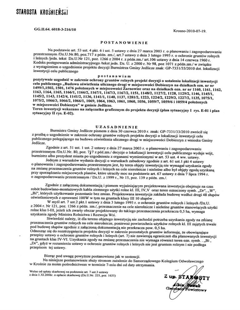 GG.11.64. 6018-3-216 /10 Krosno-201 0-07-19. POSTA NOWIE NIE Na podstawie art. 53 ust. 4 pkt. 6 i ust. 5 ustawy z dnia 27 marca 2003 r. o planowaniu i zagospodar owaniu przestrzenn ym /Dz.U.Nr.SO, poz.717 z późn. zm.I, art.7 ustawy z dnia 3 lutego 1995 r. o ochronie gruntów rolnych i leśnych /jedn. tekst Dz.U.Nr 121, poz. 1266 z 2004 r. z późn.zm./ art.106 ustawy z dnia 14 czerwca 1960 r. Kodeks postępowania administrac yjnego /tekstjedn. Dz. U. z 2000 r. Nr 98, poz 1071 z późn.zm./ w związku z wystąpieniem o uzgodnieni e projektu decyzji Burmistrza Gminy Jedlicze znak: GP-7331/3 3/20 IO dot. lokalizacji inwestycji celu publiczneg o postana wiam pozytywnie uzgodnić w zakresie ochrony gruntów rolnych projekt decyzji o ustaleniu lokalizacji inwestycji celu publicznego „Budowa oświetlenia ulicznego drogi w miejscowości Dobieszyn na działkach ozu. nr nr 1499/1,150 2, 1501, 1476 położonych w miejscowości Żarnowiec oraz na działkach ozu. nr nr 1160, 1161, 1162, 1163, 1164, 1165, 116611, 116612, 1167/1, 1167/3, 1167/2, 1151, 1148/2, 1127/2, 1128, 112912, 1146, 1145/1, 114512, 1143, 1142/4, 1141/2, 1136, 114111, 1140, 1137, 128112, 1223, 1224/2, 1229/3, 1227/2, 1135, 1075/l, 1075/2, 106613, 1066/2, 1066/l, 1069, 1064, 1063, 1061, 1060, 1056, 1059/7, 1059/6 i 1059/4 położonych w miejscowości Dobieszyn" w gminie Jedlicze. Teren inwestycji wskazano na załączniku graficznym do projektu decyzji (plan sytuacyjny I rys. E-01 i plan sytuacyjny II rys. E-02). UZASA DNIEN IE Burmistrz Gminy Jedlicze pismem z dnia 30 czerwca 201 O r. znak: GP-7331133/201 O zwrócił się z prośbą o uzgodnieni e w zakresie ochrony gruntów rolnych projektu decyzji o lokalizacji inwestycji celu publiczneg o polegającego na budowa oświetlenia ulicznego drogi w miejscowości Dobieszyn z wniosku Gminy Jedlicze. Zgodnie z art. 51 ust. 1 ust. 2 ustawy z dnia 27 marca 2003 r. o planowaniu i zagospodar owaniu przestrzenn ym /Dz.U.Nr. 80, poz. 7} 7 z póź.zm./ decyzje o lokalizacji inwestycji celu publiczneg o wydaje wójt, burmistrz albo prezydent miasta po uzgodnieni u z organami wymienion ymi w art. 53 ust. 4 ww. ustawy. Jednym z warunków wydania decyzji o warunkach zabudowy zgodnie z art. 61 ust. I pkt 4 ustawy o planowaniu i zagospodar owaniu przestrzenn ym jest, by teren objęty inwestycją nie wymagał uzyskania zgody na zmianę przeznacze nia gruntów rolnych i leśnych na cele nierolnicze i nieleśne albo był objęty zgodą uzyskaną przy sporządzaniu miejscowy ch planów, które utraciły moc na podstawie art. 67 ustawy z dnia 7 lipca 1994 r. o zagospodar owaniu przestrzenn ym I Dz.U. z 1999 r., Nr 15, poz. 139 z późn. zm./. Zgodnie z załączoną dokumentacją i pismem wyjaśniającym projektowa na inwestycja obejmuje na czas robót budowlano-montażowych kabla ziemnego użytki rolne kl. III, IV,V oraz teren oznaczony symb. ,,Dr'', „W", „Bi", których użytkowanie pozostanie bez zmian. Projektowa na inwestycja zakłada budowę wzdłuż drogi 48 słupów oświetleniowych z oprawami l OOW w tym na gruntach klasy III l O słupów . W myśl art. 7 ust.2 pkt. I ustawy z dnia 3 lutego 1995 r. o ochronie gruntów rolnych i leśnych /Dz.U. z 2004 r. Nr 121, poz. 1266 z późn. zm./, przeznacze nie na cele nierolnicze i nieleśne gruntów stanowiący ch użytki rolne klas I-III, jeżeli ich zwarty obszar projektowa ny do takiego przeznacze nia przekracza 0,5 ha, wymaga uzyskania zgody Ministra Rolnictwa i Rozwoju Wsi. Stwierdzić należy, iż dla terenu objętego inwestycją nie zachodzi potrzeba uzyskania zgody na zrliianę przeznacze nia gruntów rolnych na cele nierolnicze , ponieważ powierzchn ia użytków rolnych kl. III zajętych trwale pod budowę słupów zgodnie z załączoną dokumentacją nie przekracza pow. 0,5 ha. Odnosząc się do rozstrzygnięcia projektu decyzji w zakresie pozostałych gruntów informuję, że obowiązujące przepisy ustawy o ochronie gruntów rolnych i leśnych (art. 7) nie zawierają ograniczeń dla planowany ch inwestycji na gruntach klas IV-VI. Uzyskania zgody na zmianę przeznacze nia nie wymaga również teren ozn. symb .. ,,Bi, ,,Dr", gdyż w rozumieniu ustawy o ochronie gruntów rolnych i leśnych nie jest gruntem rolnym i nie podlega przepisom tej ustawy. Biorąc pod uwagę powyższe postanowio no jak w sentencji. Na niniejsze postanowie nie służy stronom zażalenie do Samorządowego Kolegium Odwoławczego w Krośnie za moim pośrednictwem w te1minie 7-miu dni od daty otrzymania . Wolne od opłaty skarbowej na podstawie art. 7 ust.3 ustawy z dnia l .XI.2006r. o opłacie skarbowej (Dz. U.Nr. 225, poz. 1635) y Otrzymują: 1. 2. 3. 4. 5. 6. Burmistrz Gminy Jedlicze Gmina Jedlicze Tablica ogłoszeń w siedzibie Urzędu Gminy Jedlicze Tablica ogłoszeń w miejscu Dobieszyn Tablica ogłoszeń w miejscowości Żarnowiec a.a. Strony zawiadamia się o wydaniu niniejszego postanowienia w drodze obwieszczenia umieszczonego na tablicy ogłoszeń i na stronie internetowej Starostwa Powiatowego w Krośnie www.powiat.krosno. pl Doręczenie w wyżej wymienionym trybie uważa się za dokonanie po upływie 14 dni od dnia publicznego ogłoszenia (art. 49 kpa, w związku z art. 53 ustl.1 ustawy z dnia 27 marca 2003r. o planowaniu i zagospodarowaniu przestrzennym) f