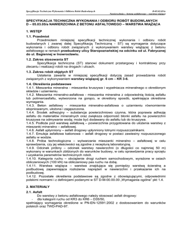 Specyfikacja Techniczna Wykonania i Odbioru Robót Budowlanych D-05.03.05/a Nawierzchnia z betonu asfaltowego – warstwa wiąŜąca SPECYFIKACJA TECHNICZNA WYKONANIA I ODBIORU ROBÓT BUDOWLANYCH D – 05.03.05/a NAWIERZCHNIA Z BETONU ASFALTOWEGO – WARSTWA WIĄśĄCA 1. WSTĘP 1.1. Przedmiot Przedmiotem niniejszej specyfikacji technicznej wykonania i odbioru robót budowlanych ( zwanej dalej Specyfikacją Techniczną - ST) są wymagania dotyczące wykonania i odbioru robót związanych z wykonywaniem warstwy wiąŜącej z betonu asfaltowego w ramach przebudowy ulicy Staropoznańskiej na odcinku od ul. Fabrycznej do ul. Bagiennej w Inowrocławiu. 1.2. Zakres stosowania ST Specyfikacja techniczna (ST) stanowi dokument przetargowy i kontraktowy przy zlecaniu i realizacji robót na drogach i ulicach. 1.3. Zakres robót objętych ST Ustalenia zawarte w niniejszej specyfikacji dotyczą zasad prowadzenia robót związanych z wykonywaniem warstwy wiąŜącej gr. 6 cm – KR 3-6. 1.4. Określenia podstawowe 1.4.1. Mieszanka mineralna - mieszanka kruszywa i wypełniacza mineralnego o określonym składzie i uziarnieniu. 1.4.2. Mieszanka mineralno-asfaltowa - mieszanka mineralna z odpowiednią ilością asfaltu lub polimeroasfaltu, wytworzona na gorąco, w określony sposób, spełniająca określone wymagania. 1.4.3. Beton asfaltowy - mieszanka mineralno-asfaltowa o uziarnieniu równomiernie stopniowanym, ułoŜona i zagęszczona. 1.4.4. Środek adhezyjny – substancja powierzchniowo czynna, która poprawia adhezję asfaltu do materiałów mineralnych oraz zwiększa odporność błonki asfaltu na powierzchni kruszywa na odmywanie wodą; moŜe być dodawany do asfaltu lub do kruszywa. 1.4.5. PodłoŜe pod warstwę asfaltową – powierzchnia przygotowana do ułoŜenia warstwy z mieszanki mineralno – asfaltowej. 1.4.6. Asfalt upłynniony – asfalt drogowy upłynniony lotnymi rozpuszczalnikami. 1.4.7. Emulsja asfaltowa kationowa – asfalt drogowy w postaci zawiesiny rozpuszczonego asfaltu w wodzie. 1.4.8. Próba technologiczna – wytwarzanie mieszanki mineralno – asfaltowej w celu sprawdzenia, czy jej właściwości są zgodne z recepturą laboratoryjną. 1.4.9. Odcinek próbny – odcinek warstwy nawierzchni (o długości co najmniej 50 m) wykonany w warunkach zbliŜonych do warunków budowy, w celu sprawdzenia pracy sprzętu i uzyskania parametrów technicznych robót. 1.4.10. Kategoria ruchu – obciąŜenie drogi ruchem samochodowym, wyraŜone w osiach obliczeniowych (100 kN) na obliczeniowy pas ruchu na dobę. 1.4.11. Warstwa wiąŜąca – warstwa znajdująca się pomiędzy warstwą ścieralną a podbudową zapewniająca rozłoŜenie napręŜeń w nawierzchni i przekazanie ich na podbudowę. 1.4.12. Pozostałe określenia podstawowe są zgodne z obowiązującymi, odpowiednimi polskimi normami i z definicjami podanymi w ST D-M-00.00.00 „Wymagania ogólne” pkt 1.4. 2. MATERIAŁY 2.1. Asfalt Do warstwy z betonu asfaltowego naleŜy stosować asfalt drogowy: - dla kategorii ruchu od KR3 do KR6 – D35/50, spełniający wymagania określone w PN-EN-12591:2002 z dostosowaniem do warunków polskich oraz TWD-PAD-97. Specyfikacja Techniczna Wykonania i Odbioru Robót Budowlanych D-05.03.05/a Nawierzchnia z betonu asfaltowego – warstwa wiąŜąca Tablica 1. Wymagania dla D 35/50 Lp. Cechy asfaltu Wymagania 1 2 3 4 Penetracja w temp. 25°C, 0,1 mm Temperatura mięknienia, °C Temperatura zapłonu nie niŜsza niŜ, °C Zawartość skład. rozpuszczalnych, nie mniej niŜ, % m/m Zmiany masy po starzeniu, nie więcej niŜ, % m/m Pozostała penetracja po starzeniu, nie mniej niŜ, % Temp. mięknienia po starzeniu, nie mniej niŜ, °C Zawartość parafiny, nie więcej niŜ, % Wzrost temp. mięknienia po starzeniu, nie więcej niŜ, °C 35 ÷ 50 50 ÷ 58 240 PN-EN 1426 PN-EN 1427 PN-EN 22592 99 PN-EN 12592 0,5 PN-EN 12607-1 53 PN-EN 1426 52 2,2 PN-EN 1427 PN-EN 12606-1 5 6 7 8 9 8 Metody badań wg PN-EN 1427 2.2. Wypełniacz NaleŜy stosować wypełniacz podstawowy produkowany ze skał wapiennych drobnoziarnistych lub bezpostaciowych ze starych formacji geologicznych wapienia. Zawartość węglanu wapnia (CaCO3) w skałach powinna być nie mniejsza niŜ 90%. Wypełniacz powinien spełniać następujące wymagania wg Zeszytu nr 56 IBDiM Wwa. Tablica 2. Wymagania dla wypełniacza Lp. Cecha materiału Gatunek I Badania wg pkt. Zeszytu nr 56 1 1 2 3 2 Zawartość węglanu wapnia nie mniej niŜ (%) Wilgotność mączki wapiennej, nie więcej niŜ (%) Górna granica wielkości ziarn mączki wapiennej odpowiadająca wymiarowi oczek sit kontrolnych, mm Zawartość wypełniacza w mączce wapiennej, nie mniej niŜ (%) Zawartość części rozpuszczalnych w wodzie, nie więcej niŜ (%) Oznaczanie zawartości minerałów ilastych; wskaźnik błękitu metylenowego, nie więcej niŜ Oznaczanie właściwości usztywniających wypełniacza wg PiK, nie więcej niŜ (°C) 3 90 1,0 5 4.5.4 4.5.1 0,5 4.5.2 80 4.5.2 1,2 4.5.3 0,8 4.5.5.1 20 4.5.6 4 5 6 7 Transport i przechowywanie wypełniacza muszą odbywać się w sposób chroniący go przed zawilgoceniem, zbrylowaniem i zanieczyszczeniem. 2.3. Kruszywo Do mieszanek mineralno – bitumicznych stosuje się kruszywa łamane wg PN-B11112:1996. Składowanie kruszywa powinno odbywać się w warunkach zabezpieczających je przed zanieczyszczeniem i zmieszaniem z innymi asortymentami kruszywa lub jego frakcjami. Specyfikacja Techniczna Wykonania i Odbioru Robót Budowlanych D-05.03.05/a Nawierzchnia z betonu asfaltowego – warstwa wiąŜąca Tablica 3. Wymagania wobec materiałów do warstwy wiąŜącej z betonu asfaltowego Lp. Rodzaj materiału nr normy 1. 2. 3. 4. 5. 3. 4. Kruszywo łamane granulowane wg PN-B-11112:1996 z litego surowca skalnego, ze skał: - magmowych - przeobraŜonych Kruszywo łamane zwykłe wg PN-B-11112:1996 świr i mieszanka Wg PN-B-11111:1996 Grys i Ŝwir kruszony zał. G normy PN-S-96025:2000 Piasek wg PN-S-96025:2000 Wypełniacz mineralny: wg Ze