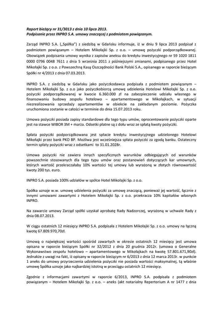 Raport bieżący nr 31/3013 z dnia 10 lipca 2013. Podpisanie przez INPRO S.A. umowy znaczącej z podmiotem powiązanym. Zarząd INPRO S.A. („Spółka”) z siedzibą w Gdańsku informuje, iż w dniu 9 lipca 2013 podpisał z podmiotem powiązanym – Hotelem Mikołajki Sp. z o.o. – umowę pożyczki podporządkowanej. Obowiązek podpisania umowy wynika z zapisów aneksu do kredytu inwestycyjnego nr 59 1020 1811 0000 0796 0048 7611 z dnia 5 września 2011 z późniejszymi zmianami, podpisanego przez Hotel Mikołajki Sp. z o.o. z Powszechną Kasą Oszczędności Bank Polski S.A., opisanego w raporcie bieżącym Spółki nr 4/2013 z dnia 07.03.2013. INPRO S.A. z siedzibą w Gdańsku jako pożyczkodawca podpisała z podmiotem powiązanym – Hotelem Mikołajki Sp. z o.o jako pożyczkobiorcą umowę udzielenia Hotelowi Mikołajki Sp. z o.o. pożyczki podporządkowanej w kwocie 6.360.000 zł na zabezpieczenie udziału własnego w finansowaniu budowy zespołu hotelowo – apartamentowego w Mikołajkach, w sytuacji niezrealizowania sprzedaży apartamentów w obiekcie na zakładanym poziomie. Pożyczka uruchomiona zostanie w całości w terminie do dnia 15.07.2013 roku. Umowa pożyczki posiada zapisy standardowe dla tego typu umów, oprocentowanie pożyczki oparte jest na stawce WIBOR 3M + marża. Odsetki płatne są z dołu wraz ze spłatą kwoty pożyczki. Spłata pożyczki podporządkowana jest spłacie kredytu inwestycyjnego udzielonego Hotelowi Mikołajki przez bank PKO BP. Możliwa jest wcześniejsza spłata pożyczki za zgodą banku. Ostateczny termin spłaty pożyczki wraz z odsetkami to 31.01.2028r. Umowa pożyczki nie zawiera innych specyficznych warunków odbiegających od warunków powszechnie stosowanych dla tego typu umów oraz postanowień dotyczących kar umownych, których wartość przekraczałaby 10% wartości tej umowy lub wyrażoną w złotych równowartość kwoty 200 tys. euro. INPRO S.A. posiada 100% udziałów w spółce Hotel Mikołajki Sp. z o.o. Spółka uznaje w.w. umowę udzielenia pożyczki za umowę znaczącą, ponieważ jej wartość, łącznie z innymi umowami zawartymi z Hotelem Mikołajki Sp. z o.o. przekracza 10% kapitałów własnych INPRO. Na zawarcie umowy Zarząd spółki uzyskał aprobatę Rady Nadzorczej, wyrażoną w uchwale Rady z dnia 08.07.2013. W ciągu ostatnich 12 miesięcy INPRO S.A. podpisała z Hotelem Mikołajki Sp. z o.o. umowy na łączną kwotę 67.809.970,70zł. Umową o największej wartości spośród zawartych w okresie ostatnich 12 miesięcy jest umowa opisana w raporcie bieżącym Spółki nr 32/2012 z dnia 20 grudnia 2012r. (umowa o Generalne Wykonawstwo zespołu hotelowo – apartamentowego w Mikołajkach na kwotę 57.801.671,90zł). Jednakże z uwagi na fakt, iż opisany w raporcie bieżącym nr 6/2013 z dnia 12 marca 2013r. w punkcie 1 aneks do umowy przyrzeczenia udzielenia pożyczki nie posiada wartości maksymalnej, tą właśnie umowę Spółka uznaje jako najbardziej istotną w przeciągu ostatnich 12 miesięcy. Zgodnie z informacjami zawartymi w raporcie 6/2013, INPRO S.A. podpisała z podmiotem powiązanym – Hotelem Mikołajki Sp. z o.o. – aneks (akt notarialny Repertorium A nr 1477 z dnia 11.03.2013) do notarialnej bezwarunkowej umowy przyrzeczenia udzielenia pożyczek (akt notarialny Repertorium A nr 4566/2011 z dnia 05.09.2011). Bezwarunkowa umowa przyrzeczenia udzielenia pożyczek podporządkowanych dla spółki Hotel Mikołajki Sp. z o.o. przeznaczona jest na pokrycie ewentualnych dodatkowych kosztów przedsięwzięcia wykraczających poza koszty określone w przedłożonym w PKO BP biznesplanie oraz spłatę kredytów udzielonych przez Bank, a także dokonanie przelewu wierzytelności z umowy pożyczki na PKO BP, za zgodą INPRO. Przedmiotowa pożyczka udzielona zostanie w kwocie odpowiadającej sumie niespłaconych przez Pożyczkobiorcę zobowiązań wynikających z umów kredytowych podpisanych z PKO BP oraz na pokrycie ewentualnych dodatkowych uzasadnionych kosztów inwestycyjnych wykraczających poza koszty określone w przedłożonym w Banku biznesplanie. Aneks do umowy przyrzeczenia udzielenia pożyczek aktualizuje wartość umowy kredytu inwestycyjnego, tzn. podwyższenie kredytu o kwotę 9.124.000 zł, czyli z kwoty 27.090.000 zł do kwoty 36.214.000 zł, ustanowionego aneksem do umowy kredytowej z dnia 06.03.2013. Umowa przyrzeczenia nie określa górnego pułapu kwoty przyrzeczonej pożyczki, dla potrzeb przygotowania raportu przyjęto wartość szacunkową przedmiotu umowy jako sumę zawartych przez Hotel Mikołajki z PKO BP umów kredytowych, tj. 40.714.000,00zł. Wszystkie pozostałe zapisy umowy przyrzeczenia pozostały bez zmian. Spółka uznaje w.w. umowę przyrzeczenia udzielenia pożyczek za umowę znaczącą, ponieważ jej wartość (liczona jako wartość przyjęta dla potrzeb raportowania) przekracza 10% kapitałów własnych INPRO. Szczegółowa podstawa prawna: § 5 ust. 1 pkt 3 Rozporządzenia Ministra Finansów z dnia 19 lutego 2009r. w sprawie informacji bieżących i okresowych przekazywanych przez emitentów papierów wartościowych oraz warunków uznawania za równoważne informacji wymaganych przepisami prawa państwa niebędącego państwem członkowskim (Dz. U. 2009, Nr 33 , poz. 259 z dnia 28 lutego 2009r. z późn. zm.). Podstawa prawna: Art. 56 ust. 1 pkt 2 Ustawy o ofercie - informacje bieżące i okresowe