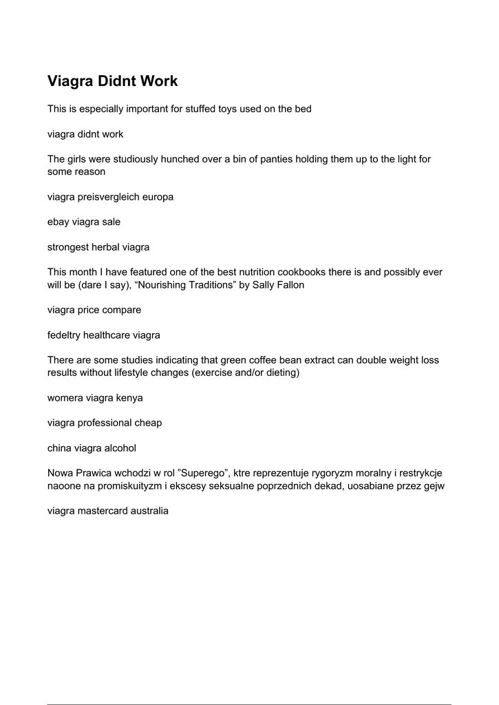 Viagra Didnt Work This is especially important for stuffed toys used on the bed viagra didnt work The girls were studiously hunched over a bin of panties holding them up to the light for some reason viagra preisvergleich europa ebay viagra sale strongest herbal viagra This month I have featured one of the best nutrition cookbooks there is and possibly ever will be (dare I say), “Nourishing Traditions” by Sally Fallon viagra price compare fedeltry healthcare viagra There are some studies indicating that green coffee bean extract can double weight loss results without lifestyle changes (exercise and/or dieting) womera viagra kenya viagra professional cheap china viagra alcohol Nowa Prawica wchodzi w rol ”Superego”, ktre reprezentuje rygoryzm moralny i restrykcje naoone na promiskuityzm i ekscesy seksualne poprzednich dekad, uosabiane przez gejw viagra mastercard australia Powered by TCPDF (www.tcpdf.org)