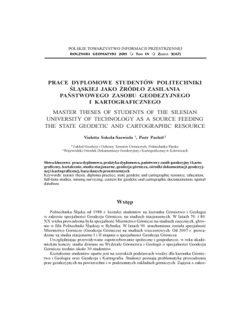 PRACE DYPLOMOWE STUDENTÓW POLITECHNIKI L¥SKIEJ JAKO RÓD£O ZASILANIA PAÑSTWOWEGO... POLSKIE TOWARZYSTWO INFORMACJI PRZESTRZENNEJ 105 ROCZNIKI GEOMATYKI 2011 m TOM IX m ZESZYT 3(47) PRACE DYPLOMOWE STUDENTÓW POLITECHNIKI L¥SKIEJ JAKO RÓD£O ZASILANIA PAÑSTWOWEGO ZASOBU GEODEZYJNEGO I KARTOGRAFICZNEGO MASTER THESES OF STUDENTS OF THE SILESIAN UNIVERSITY OF TECHNOLOGY AS A SOURCE FEEDING THE STATE GEODETIC AND CARTOGRAPHIC RESOURCE Violetta Soko³a-Szewio³a 1, Piotr Pachó³ 2 2 1 Zak³ad Geodezji i Ochrony Terenów Górniczych, Politechnika l¹ska Wojewódzki Orodek Dokumentacji Geodezyjnej i Kartograficznej w Katowicach S³owa kluczowe: praca dyplomowa, praktyka dyplomowa, pañstwowy zasób geodezyjny i kartograficzny, kszta³cenie, studia stacjonarne, geodezja górnicza, orodki dokumentacji geodezyjnej i kartograficznej, baza danych przestrzennych Keywords: master thesis, diploma practice, state geodetic and cartographic resource, education, full-time studies, mining surveying, centers for geodetic and cartographic documentation, spatial database Wstêp Politechnika l¹ska od 1988 r. kszta³ci studentów na kierunku Górnictwo i Geologia w zakresie specjalnoci Geodezja Górnicza, na studiach stacjonarnych. W latach 70. i 80. XX wieku prowadzona by³a specjalnoæ Miernictwo Górnicze na studiach zaocznych, g³ównie w filii Politechniki l¹skiej w Rybniku. W latach 90. uruchomiona zosta³a specjalnoæ Miernictwo Górnicze (Geodezja Górnicza) na studiach wieczorowych. Od 2007 r. prowadzone s¹ studia stacjonarne I i II stopnia o specjalnoci Geodezja Górnicza. Uwzglêdniaj¹c przewidywane zapotrzebowanie spo³eczne i gospodarcze, w roku akademickim koñczy studia dzienne na Wydziale Górnictwa i Geologii o specjalnoci Geodezja Górnicza rednio oko³o 30 studentów. Kszta³cenie studentów oparte jest na szerokich podstawach wiedzy dla kierunku Górnictwo i Geologia oraz Geodezja i Kartografia. Studenci poznaj¹ problematykê prowadzenia prac geodezyjnych na powierzchni i w podziemnych zak³adach górniczych. Zajêcia z zakre- 106 VIOLETTA SOKO£A-SZEWIO£A, PIOTR PACHÓ£ su Geodezja i Kartografia prowadzone s¹ g³ównie przez pracowników Zak³adu Geodezji i Ochrony Terenów Górniczych. Z uwagi na szybki postêp techniczny w zakresie zarówno sprzêtu komputerowego, oprogramowania, jak i metod i technologii pomiarowych na bie¿¹co nastêpuje modernizacja planów studiów i programów nauczania, w celu rozszerzenia wiedzy absolwentów, tak¿e tej zwi¹zanej z geoinformatyk¹. Uwzglêdniane s¹ potrzeby przysz³ych potencjalnych pracodawców, tj.: przedsiêbiorstw górniczych, organów administracji geodezyjnej i kartograficznej oraz prywatnych firm geodezyjnych. Przedsiêbiorstwa górnicze wymagaj¹ od osób zatrudnianych w dzia³ach mierniczo-geologicznych wiedzy i umiejêtnoci w zakresie tworzenia dokumentacji mierniczo-geologicznej w postaci numerycznej, w tym dokumentacji kartograficznej. Obecnie wiele kopalñ prowadzi dokumentacjê w tej postaci, co dopuszczono wprowadzaj¹c odpowiednie zapisy rozporz¹dzenia Ministra Gospodarki z dnia 19 czerwca 2002 r. w sprawie dokumentacji mierniczo-geologicznej (Rozporz¹dzenie, 2002). D¹¿y siê tak¿e do wdro¿enia systemów informatycznych pozwalaj¹cych na utworzenie baz danych stanowi¹cych element Systemu Informacji o Terenie Górniczym, które usprawni³by prowadzenie ruchu zak³adu górniczego. Sposób prowadzenia pañstwowego zasobu geodezyjnego i kartograficznego (pzgik) w orodkach dokumentacji geodezyjnej i kartograficznej (odgik) wynikaj¹cy z ustawy z dnia 17 maja 1989 r. Prawo geodezyjne i kartograficzne (Ustawa, 1989) i rozporz¹dzenia Ministra Rozwoju Regionalnego i Budownictwa z dnia 12 lipca 2001r. w sprawie szczegó³owych zasad i trybu za³o¿enia i prowadzenia krajowego systemu informacji o terenie (Rozporz¹dzenie, 2001b) oraz obowi¹zuj¹cych instrukcji i wytycznych, wyranie wskazuje na potrzebê przygotowania absolwenta do pracy przy tworzeniu baz danych przestrzennych Krajowego Systemu Informacji o Terenie (KSIT) takich jak: Ewidencja Gruntów i Budynków (EGiB) i Baza Danych Obiektów Topograficznych (BDOT). Uwzglêdniaj¹c powy¿sze, plany studiów wzbogacono o przedmioty miêdzy innymi przygotowuj¹ce do prac w zakresie tworzenia i prowadzenia systemów informacji przestrzennej, w tym obs³ugi aplikacji CAD oraz GIS. Zmiany w programach nauczania dotyczy³y przede wszystkim przedmiotów: 1) kartografia, w którym obecnie znaczna czêæ prowadzonych zajêæ dotyczy kartografii komputerowej; 2)geodezja, w którym wprowadzono w szerszym zakresie wykorzystanie tachimetrów elektronicznych, niwelatorów kodowych oraz techniki GPS. Nie s¹ to wci¹¿ zmiany, które pozwalaj¹ na przekazanie szerszego zakresu wiedzy dotycz¹cej geoinformacji, co jest zwi¹zane g³ównie ze zbyt ma³¹ liczb¹ godzin dydaktycznych, jakie mo¿na przeznaczyæ na realizacjê tego zakresu zagadnieñ. Poszerzenie wiedzy absolwenta zainteresowanego szczególnie t¹ tematyk¹ jest mo¿liwe, dziêki odbywaniu praktyki zawodowej we wskazanych przez studentów instytucjach. Dodatkowo dopuszczono realizacjê prac dyplomowych na tematy zaproponowane przez samych studentów (wynikaj¹ce z ich w³asnych zainteresowañ naukowych) lub przez zak³ad pracy, w którym zamierzaj¹ podj¹æ pracê zawodow¹ po skoñczeniu studiów lub s¹ w nim zatrudnieni. Uczelnia wspó³pracuje z wieloma odgik, które proponuj¹ temat prac dyplomowvch, g³ównie w celu wykorzystania ich wyników do zasilenia pzgik. Tematy realizowane w ramach wspó³pracy, dotycz¹ g³ównie opracowania baz danych KSIT, zarówno w zakresie treci obligatoryjnej, jak i fakultatywnej czy tworzenia opracowañ dla zasilenia systemów informacji przestrzennej miast i powiatów. Studenci odbywaj¹c praktykê dyplomow¹ w orodkach maj¹ mo¿liwoæ uzyskania dostêpu do danych pzgik oraz zapoznania siê z produkcyjnym wyko- PRACE DYPLOMOWE STUDENTÓW POLITECHNIKI L¥SKIEJ JAKO RÓD£O ZASI