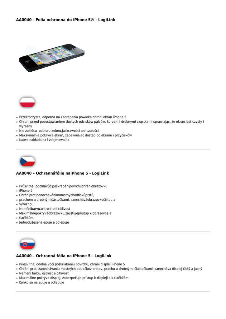 AA0040 - Folia ochronna do iPhone 5® - LogiLink ● ● ● ● ● Przeźroczysta, odporna na zadrapania powłoka chroni ekran iPhone 5 Chroni przed pozostawianiem tłustych odcisków palców, kurzem i drobnymi cząstkami sprawiając, że ekran jest czysty i wyraźny Nie zakłóca odbioru koloru,jaskrawości ani czułości Maksymalnie pokrywa ekran, zapewniając dostęp do ekranu i przycisków Łatwo nakładalna i zdejmowalna AA0040 – Ochrannáfólie naiPhone 5 - LogiLink ● ● ● ● ● ● ● ● ● Průsvitná, odolnávůčipoškrábánípovrchuchráníobrazovku iPhone 5 Chráníprotiponechávánímmastnýchodtiskůprstů, prachem a drobnýmičástečkami, zanecháváobrazovkučistou a výraznou Neměníbarvu,ostrost ani citlivost Maximálněpokrýváobrazovku,zajišťujepřístup k obrazovce a tlačítkům Jednodušesenalepuje a odlepuje AA0040 – Ochranná fólia na iPhone 5 - LogiLink ● ● ● ● ● Priesvitná, odolná voči poškriabaniu povrchu, chráni displej iPhone 5 Chráni proti zanechávaniu mastných odtlačkov prstov, prachu a drobnými čiastočkami, zanecháva displej čistý a jasný Nemení farbu, ostrosť a citlivosť Maximálne pokrýva displej, zabezpečuje prístup k displeji a k tlačidlám Ľahko sa nalepuje a odlepuje Kod EAN:4052792012729