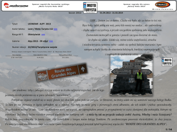 Sponsor nagród dla laureatów rankingu „Moto-Turysta Roku 2013” Se z o n 2 0 1 3 Sponsor nagrody dla autora „Relacji Roku 2013” 01.04.2013 - 31.03.2014 Uffff.... Jestem już w domu. Ciężko nie było, ale za łatwo to też nie. Tytuł: LEONOWE ALPY 2013 Autor tekstu: Leon / Moto-Turysta 152 >>> Ranga M-T: Obieżyświat >>> Galeria: Alpy 2013 - 99 zdjęć >>> Ręce bolą, tyłek jakby nie mój, parę kilo mniej na wadze... ale zadowolony - chyba nawet szczęśliwy, a przede wszystkim spełniony jako motocyklista. Zostawiam motocykl w garażu i powoli zaczyna docierać do mnie, że chyba się udało. Udało się, mimo wielu wątpliwości, strachu i niedowierzaniu samemu sobie - udało się spełnić kolejne marzenie i tym Numer relacji: 22/2013/Turystyczne wojaże samym uchylić furtkę do stawiania kolejnych, bardziej wymagających Relacja objęta rankingami "Moto -Turysta Roku 2013" & "Wyprawa Roku 2013" Data wyprawy Data nadesłania relacji Data publikacji relacji 27.06 - 04.07.2013 01.09.2013 24.11.2013 i trudnych do spełnienia celów. Jak wiadomo, żeby z jakiegoś miejsca wrócić to trzeba najpierw wyjechać. Jak do tego powrotu doszło postaram się w paru zdaniach "namalować". Pomysł na wyjazd zrodził się w mojej głowie już dwa lata temu podczas pobytu w Słowenii, na który udało mi się namówić naszego kolegę Bodka. To tam po raz pierwszy w życiu zetknąłem się z Alpami. Nie były to może góry z pierwszych stron albumów, ale ich widok i piękno spowodowały, że zachciałem poznać je całe. "Całe" to określenie może na wyrost, ale zapragnąłem poznać je przynajmniej w części dostępnej dla motocykla, którym się poruszam. Już wtedy luźno rzuciłem pomysł wycieczki na następny rok: - a może by tak na przyszłe wakacje zrobić Austrię, Włochy i może Szwajcarię? Koleje losu spowodowały, że tamtą część Alp zwiedziłem z innym moim kolegą Tomkiem. Po zeszłorocznym powrocie stwierdziłem, że chcę jeszcze. Po notorycznym studiowaniu map, internetu i paru książkowych pozycji powstał tytuł tegorocznej wycieczki: "ROUTE DES GRANDES ALPES". 1 / 14 Route des Grandes Alpes, czyli droga staroalpejska - jest to trasa, która wiedzie od brzegów Jeziora Genewskiego, aż do brzegów Morza Liguryjskiego. Długa na 684 kilometry, wiedzie przez jedne z najwyższych przełęczy alpejskich. Wybudowana w pierwszej połowie dwudziestego wieku miała służyć jako droga przeznaczona dla zwykłego transportu, jednak po wybudowaniu autostrad, nabrała typowo turystycznego charakteru. W wigilię wyjazdu, podczas pakowania, stwierdzam brak jednej śrubki w plastiku pod siedzeniem. W taką podróż z luźnym plastikiem? Nie ze mną te numery... Dzwonię do Seta i w słuchawce słyszę: - jak będziesz wyjeżdżał z garażu to mnie obudź. Dobrze, że chłop wyrozumiały jest i wcześnie rano mi tę śrubkę przykręci. Taki to już ze mnie mechanik... Może dlatego też nie każdy wierzył w to, że wybiorę się sam tak daleko od domu. Szczerze mówiąc, sam w to do końca nie wierzyłem... Dzisiaj pojechałbym nawet bez owiewek – taki twardziel się ze mnie zrobił ha,ha... Następnego dnia po ledwie przespanej nocy wsiadam na motocykl i zgodnie z umową naginam do Jacka. Śrubka przykręcona, kawa wypita, pamiątkowe zdjęcie zrobione, życzenia szerokiej drogi i...witaj przygodo, witaj nieznane !!! Na pierwszy dzień postawiłem sobie za cel dojechać jak najbliżej Szwajcarii. Do granicy z Niemcami ze względu na wczesną porę dnia poszło bardzo sprawnie. Niemcy jak to Niemcy. Autostrady i nuuuuda. Orzeźwiło mnie trochę Monachium. Tak jak w zeszłym roku nawigacja wpierdzieliła mnie w jakieś przebudowy okraszone wszędobylskim korkiem (myślałem, że tylko u nas tak wszystko się wlecze z tymi remontami). Ona każe mi w lewo a tam drogi nie ma. Zamknięta. Po paru podejściach i już moim delikatnie mówiąc zirytowaniu, odbiłem gdzieś w boczną uliczkę i jechałem tak długo, póki to moje elektroniczne pudełko odpuściło sobie opcję zawracania. To był strzał w dziesiątkę. Nowa trasa i jestem na rogatkach tego miejskiego molocha. Po drodze do Garmisch łapie mnie kilka razy deszcz. Trochę jestem przerażony - im bliżej gór tym więcej chmur i wilgoci. W samym Garmisch już tak leje, że jestem zmuszony ubrać przeciwdeszczówkę żeby móc jechać dalej. Parująca szybka i deszcz zrobiły swoje, bo nawet nie wiem kiedy znalazłem się w Austrii. Nadeszła pora na szukanie noclegu. Tu muszę nadmienić, że ogólnie to nastawiony byłem na spanie w namiocie, jednak nieustający z nieba prysznic bardzo szybko ostudził moje zapędy. Pamiętając z zeszłego roku, że w Austrii ceny nie zabijają, zacząłem rozglądać się za jakimś noclegiem pod dachem. Udało mi się go znaleźć gdzieś koło Piller, a może w samym Piller? Nieważne. Grunt, że sucho, ciepło i wygodnie. 2 / 14 Pogoda skróciła mój plan dojazdu o jakieś 60 kilometrów, lecz nie przejmowałem się tym za bardzo. Taki dystans jestem w stanie nadrobić następnego dnia. Z tym postanowieniem kładę się do łóżka i nawet nie wiem kiedy zasypiam. Nazajutrz budzę się dość wcześnie. Od razu idę do okna sprawdzić, czy przypadkiem nie leje. Asfalty mokre, niebo w chmurach, ale na całe szczęście nie pada. Dzisiaj muszę dojechać do Francji, jak najbliżej początku drogi staroalpejskiej, czyli miasta Thonon-les-Bains. Krótko mówiąc - cały dzień Szwajcaria z całym dorobkiem inwentarza - ograniczenia prędkości do 80km/h, jeżdżący nad wyraz ostrożnie Szwajcarzy i mój ciągły strach, żeby nie trafić na ich radar lub policję. Strach tkwił we mnie pomimo, że jechałem bardzo przepisowo. Tak nawiasem mówiąc, Szwajcarzy nieźle "powiększyli" sobie teren tym ograniczeniem. Państwo ciupeńkie a jeeeedzie się przez nie i jeeeeedzie, aż do wyrzygania. Muszę zapamiętać, że Szwajcaria na zwiedzanie – o.k., ale jako przelotów